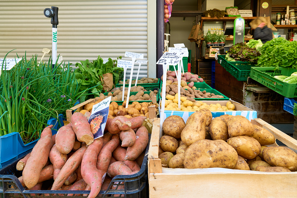 A greengrocer in Augsburg is selling different types of potatoes along the Romantic Road in Bavaria. Customers browse the fresh produce.