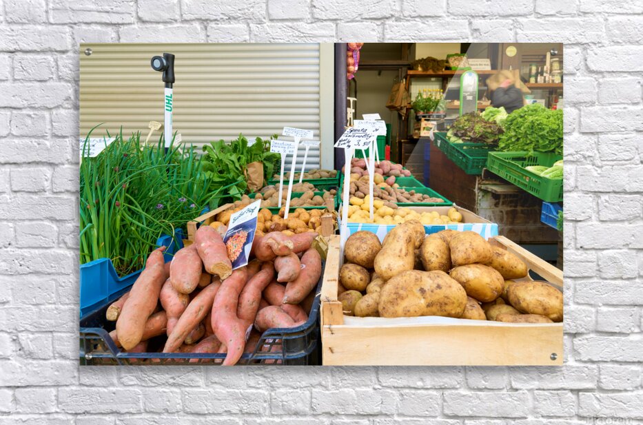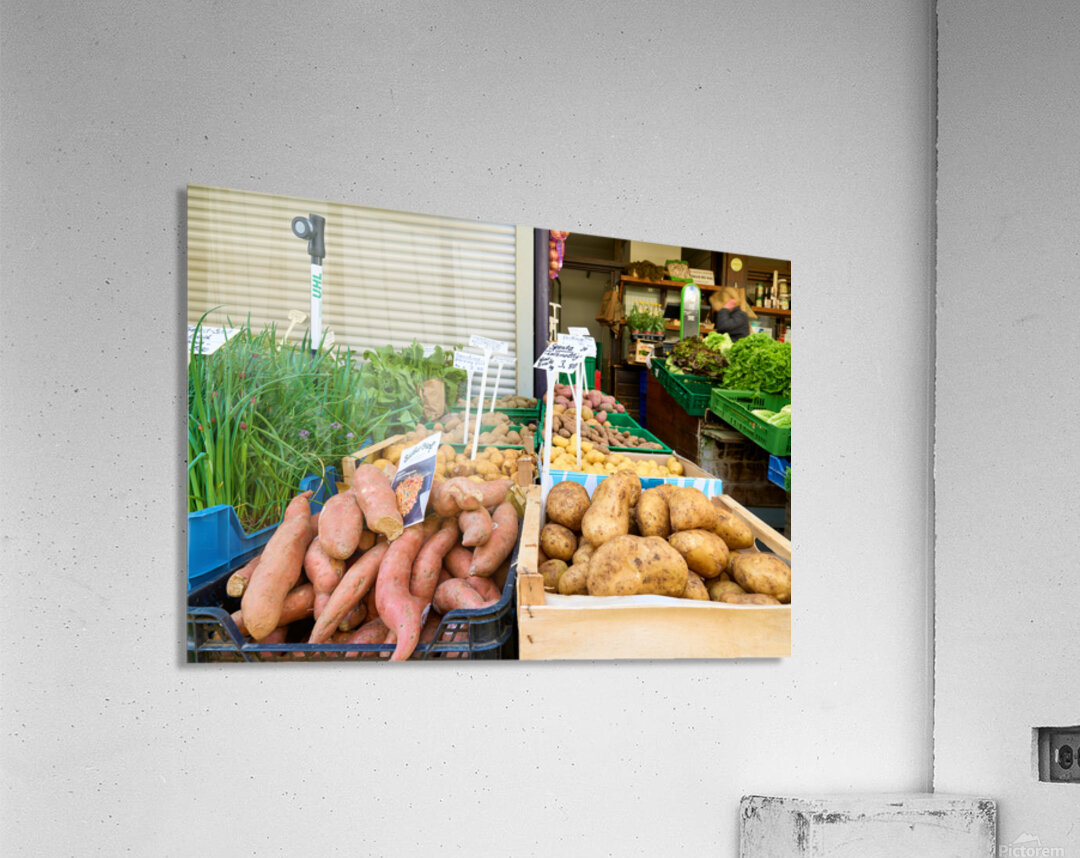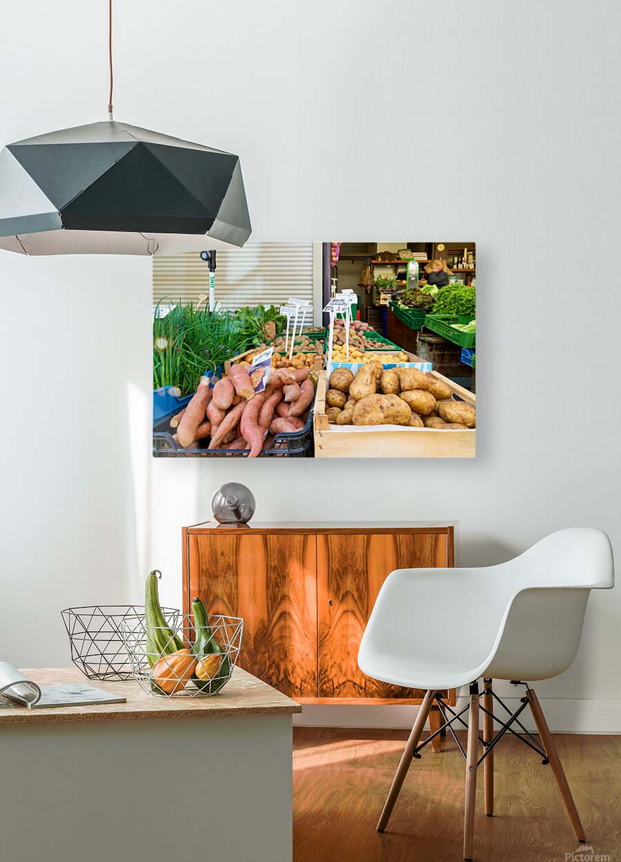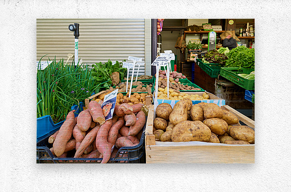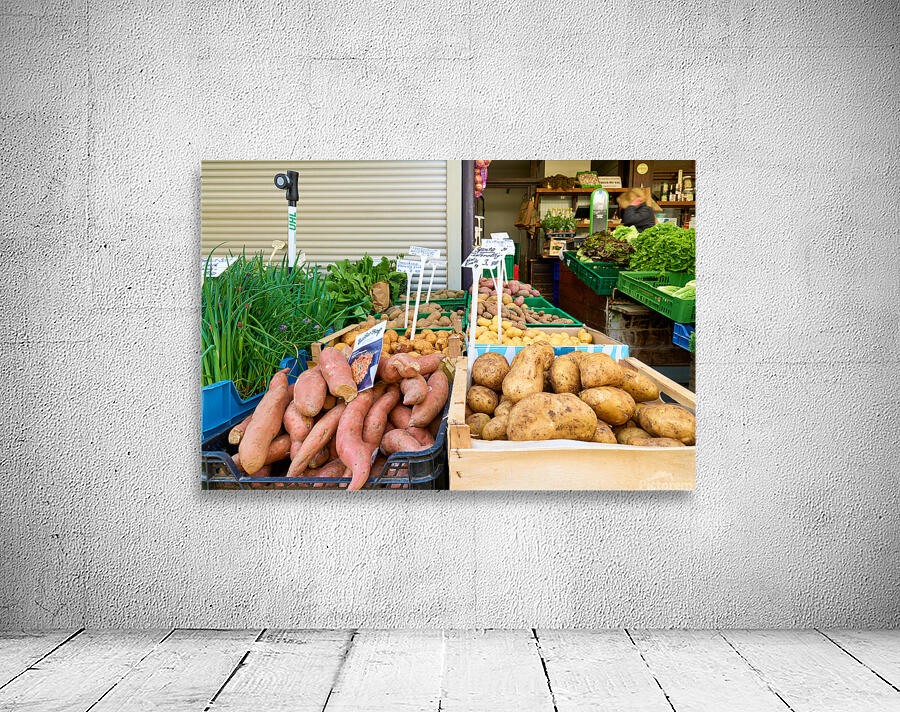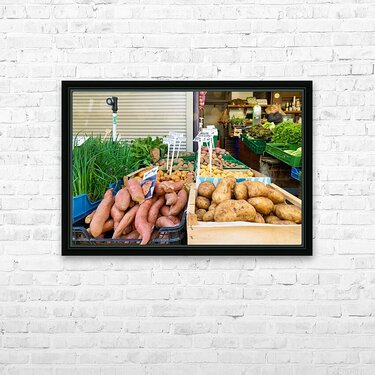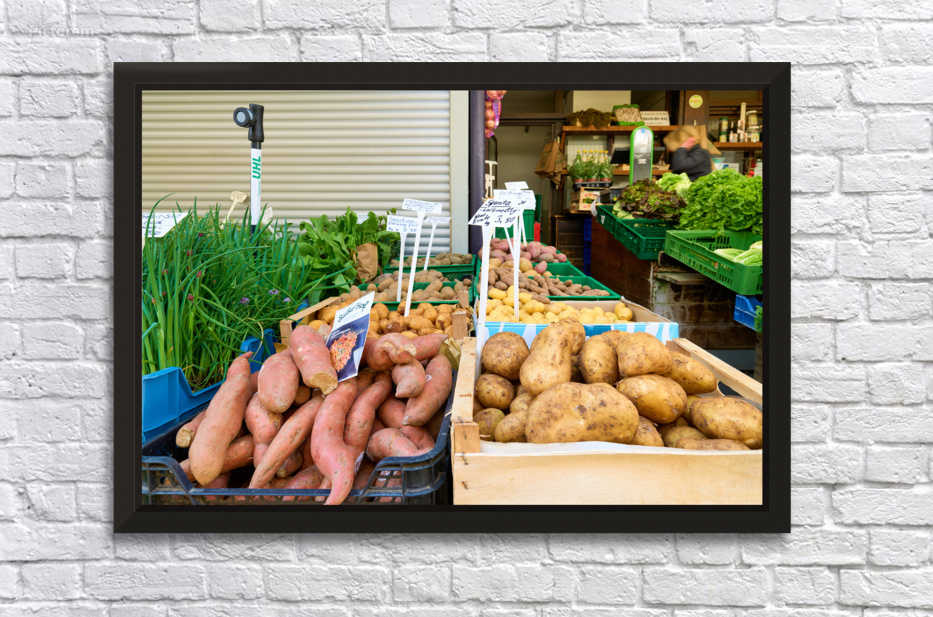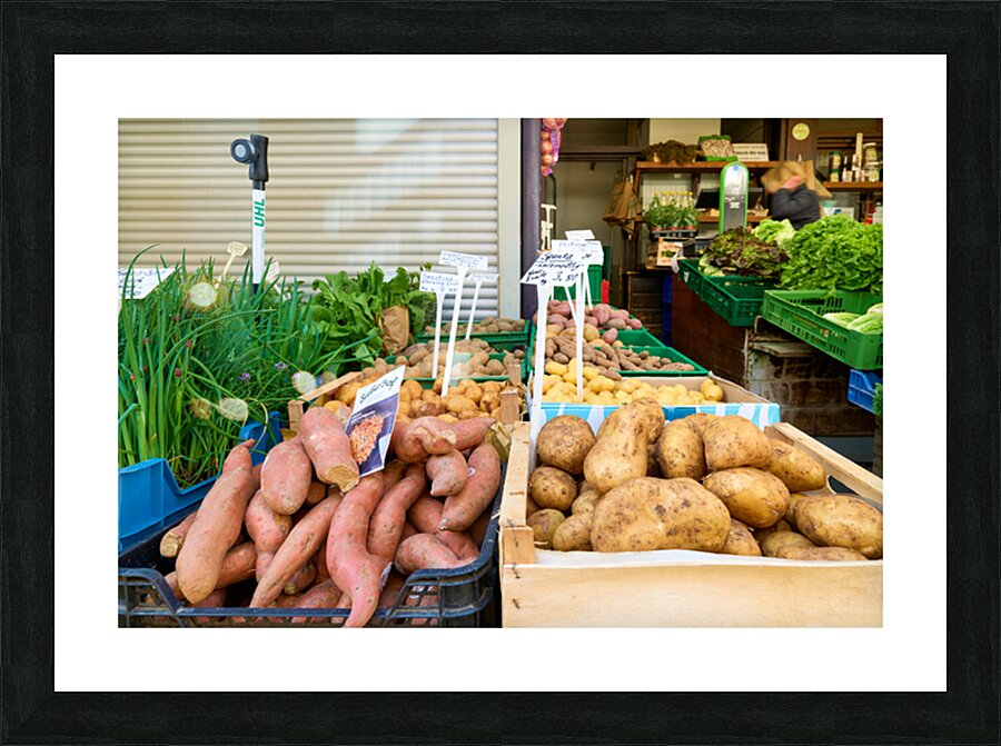 "Greengrocer selling varieties of potatoes in Augsburg Bavaria" in a framed print.