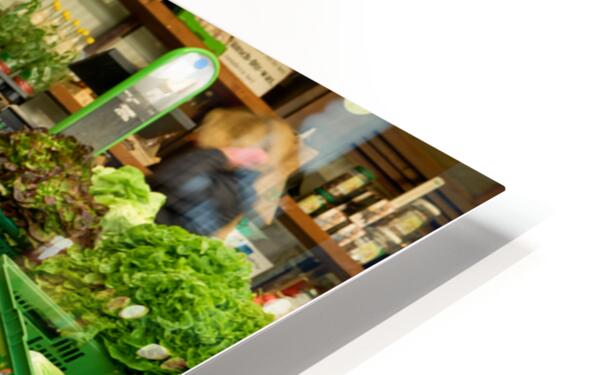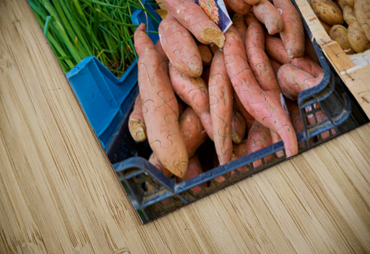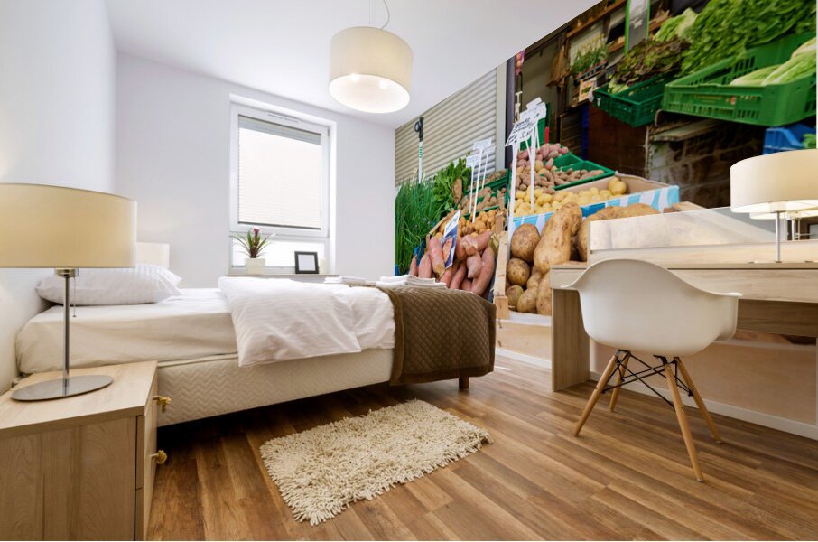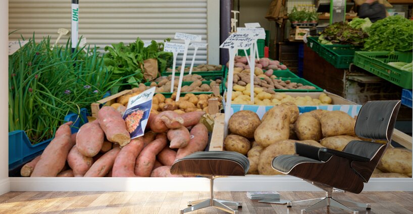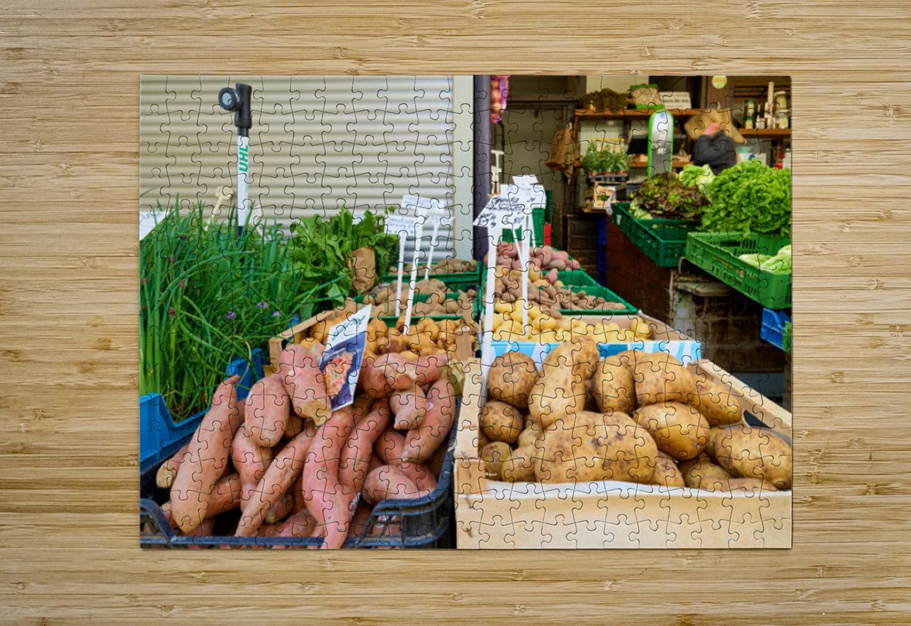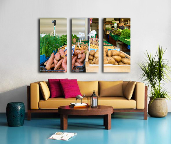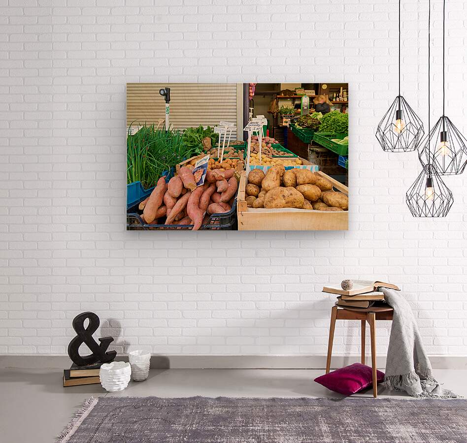 "Greengrocer selling varieties of potatoes in Augsburg Bavaria" in a framed print.