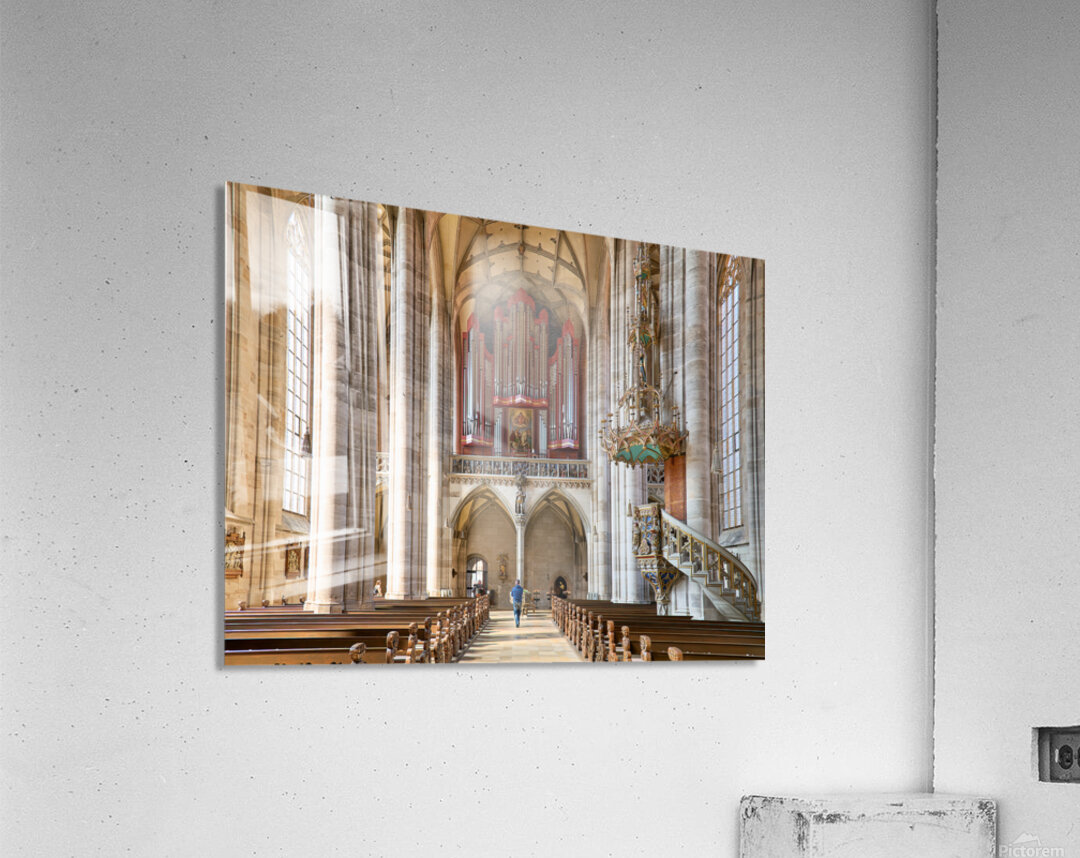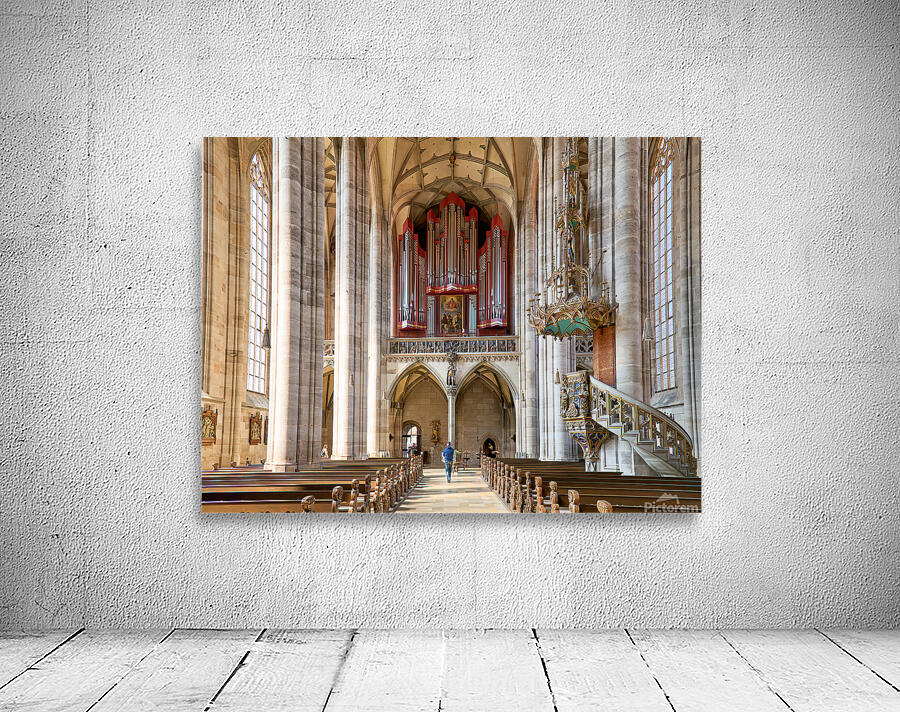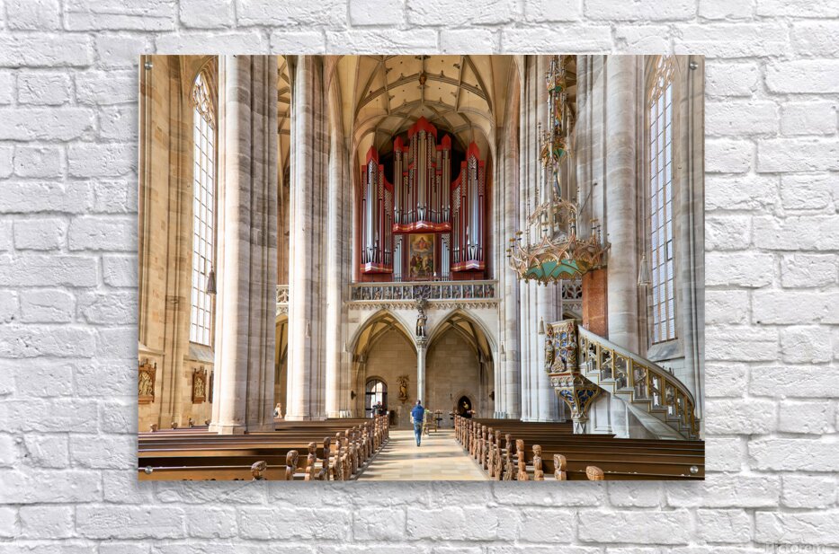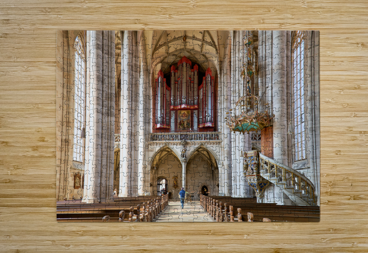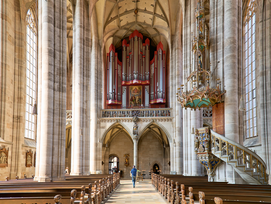 Visitors walk through Saint Georges Minster. The church features tall columns an organ and wooden seating. It is located in Dinkelsbuhl Germany.