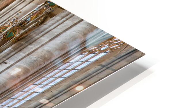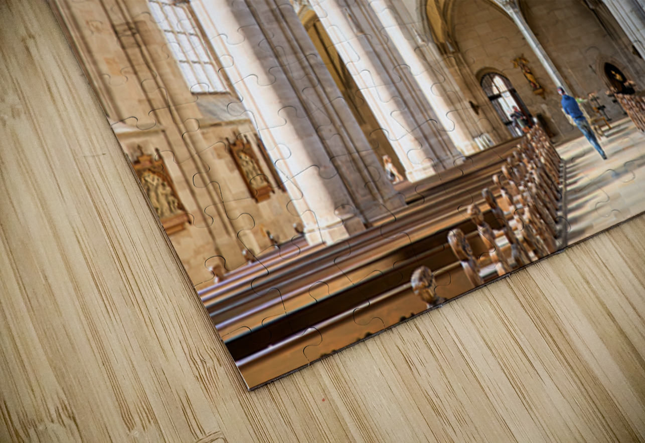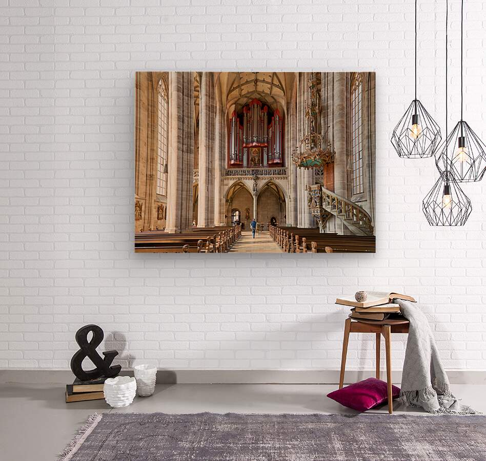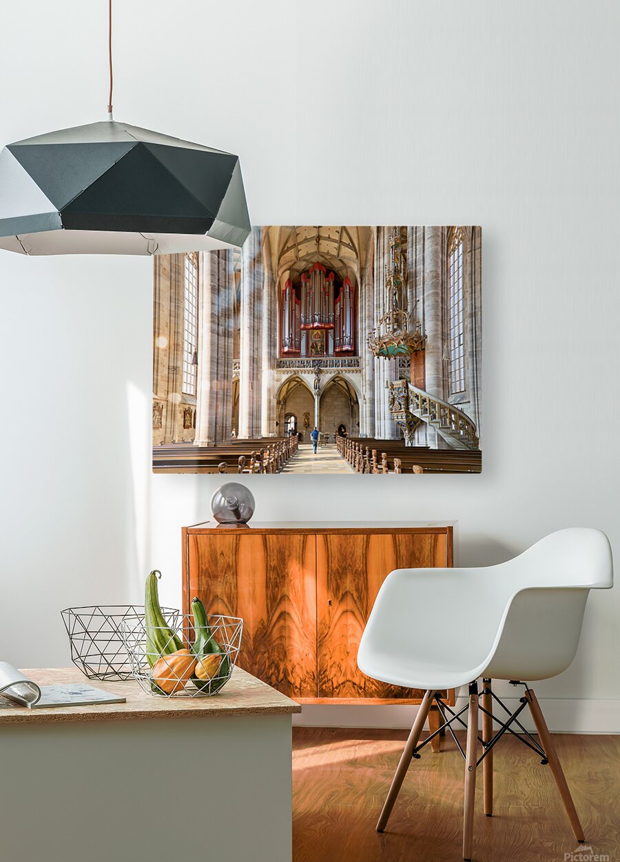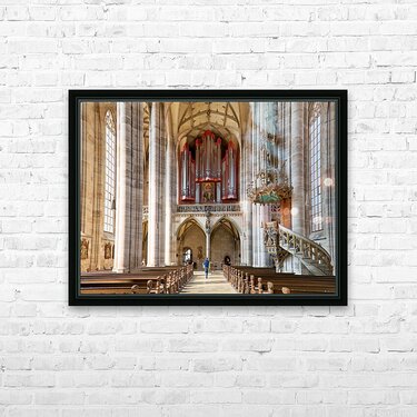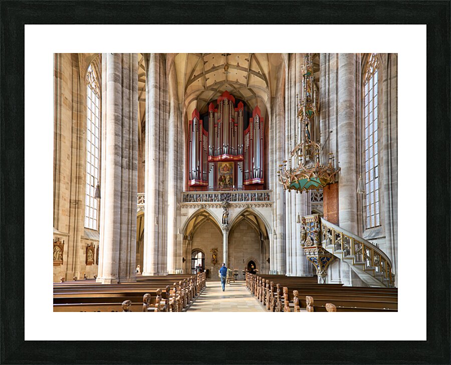 Visitors walk through Saint Georges Minster. The church features tall columns an organ and wooden seating. It is located in Dinkelsbuhl Germany.