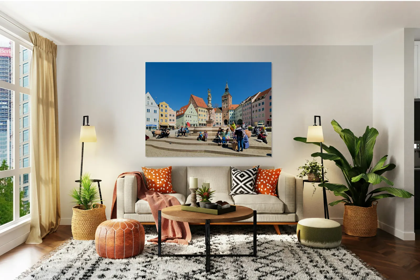 People sit and relax at Hauptplatz square. Colorful buildings surround the fountain. It is a sunny day in Landsberg am Lech along the Romantic Road.
