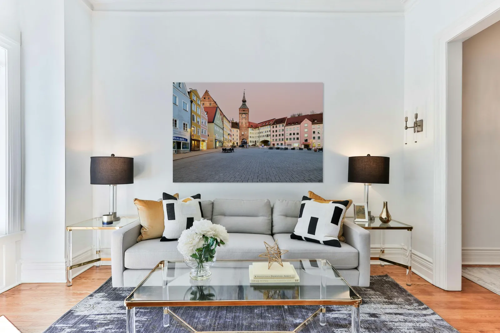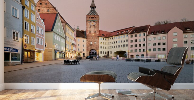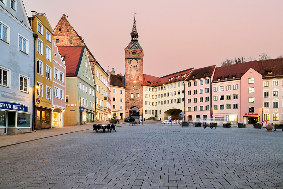 People explore Hauptplatz square in Landsberg am Lech. This square showcases colorful buildings and a historic clock tower at sunset.