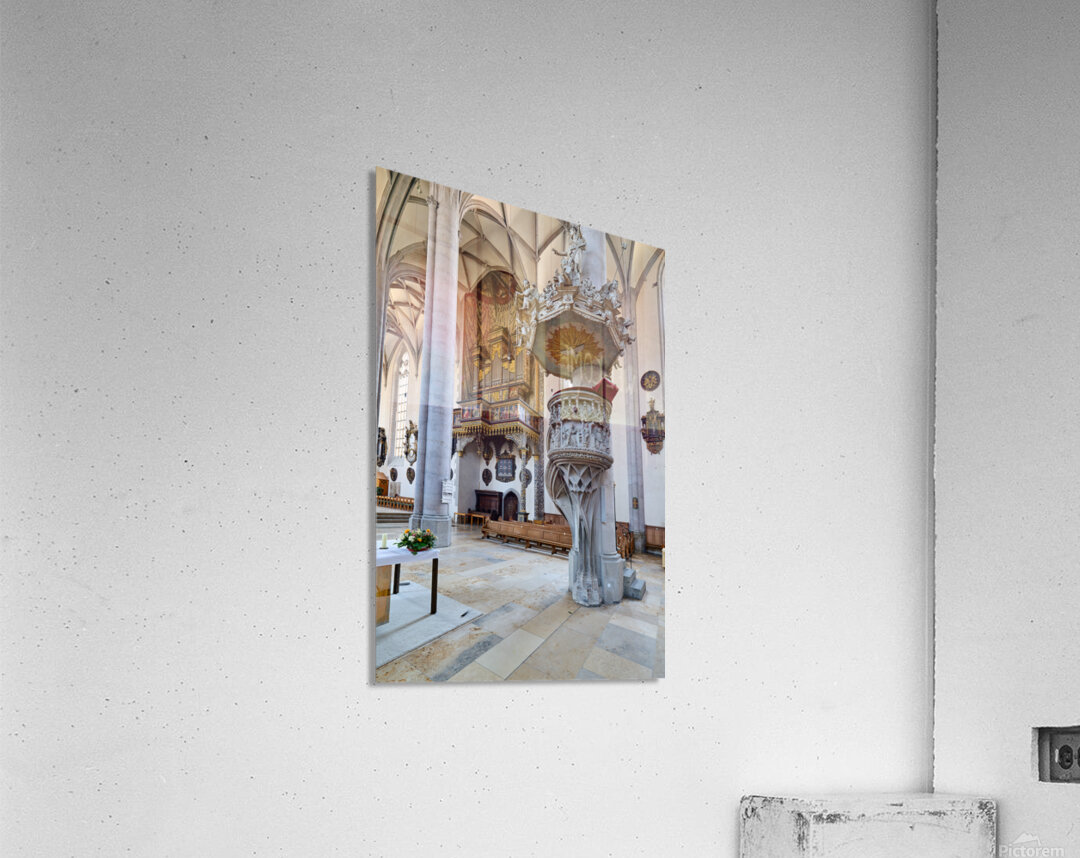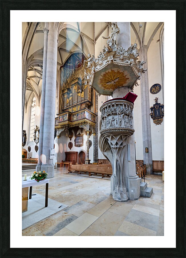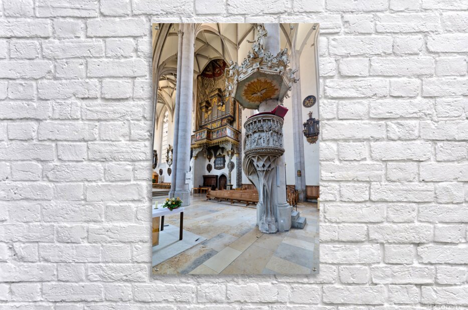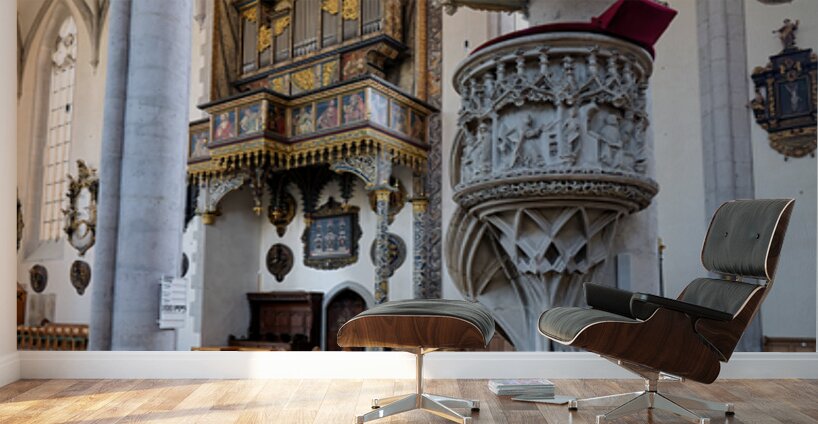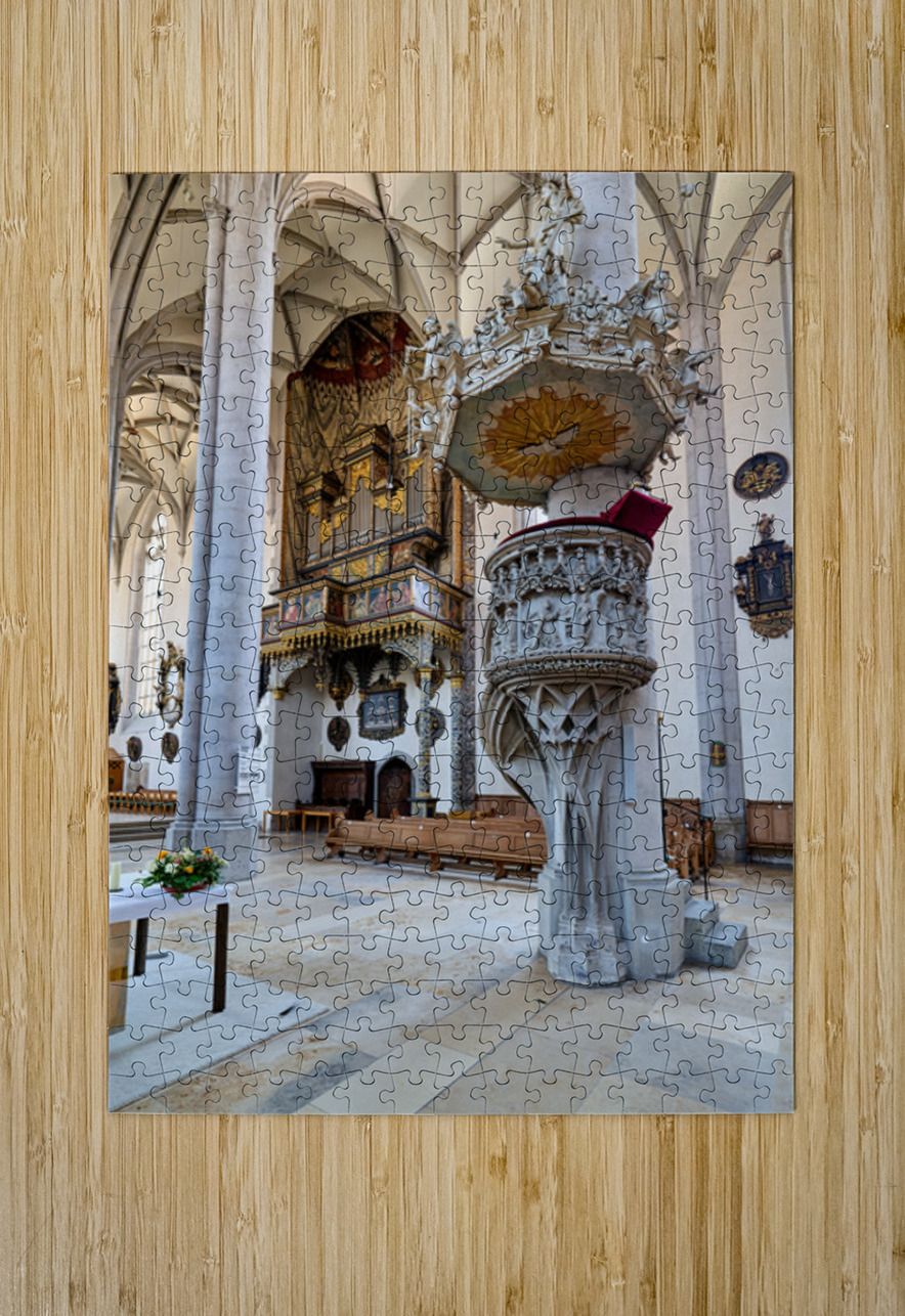 People explore the interior of St. Georgs Kirche in Nordlingen. The church features a tall organ and detailed stonework.