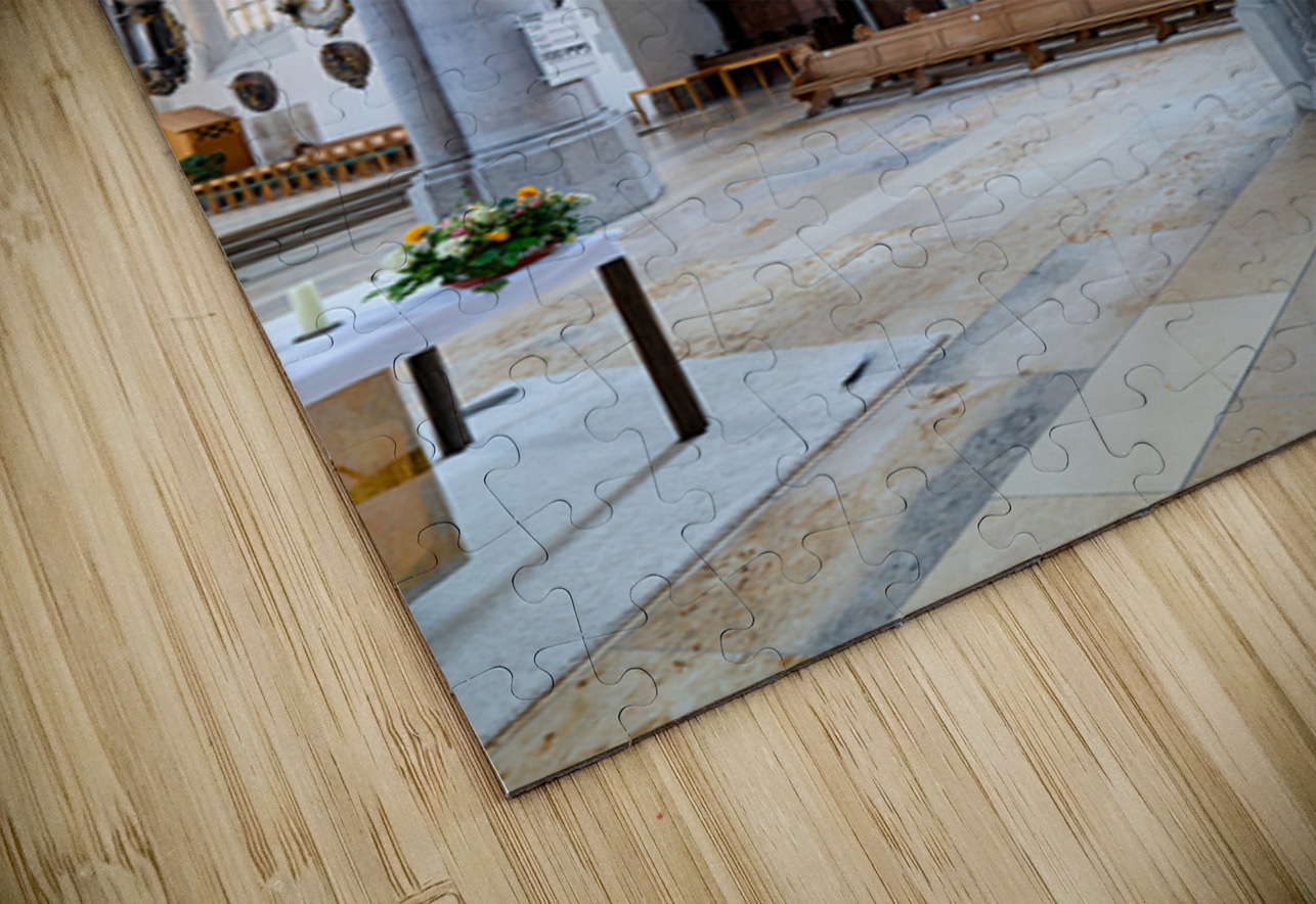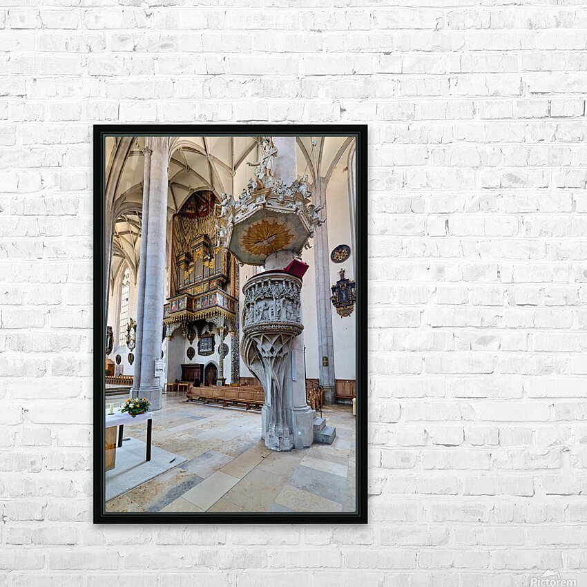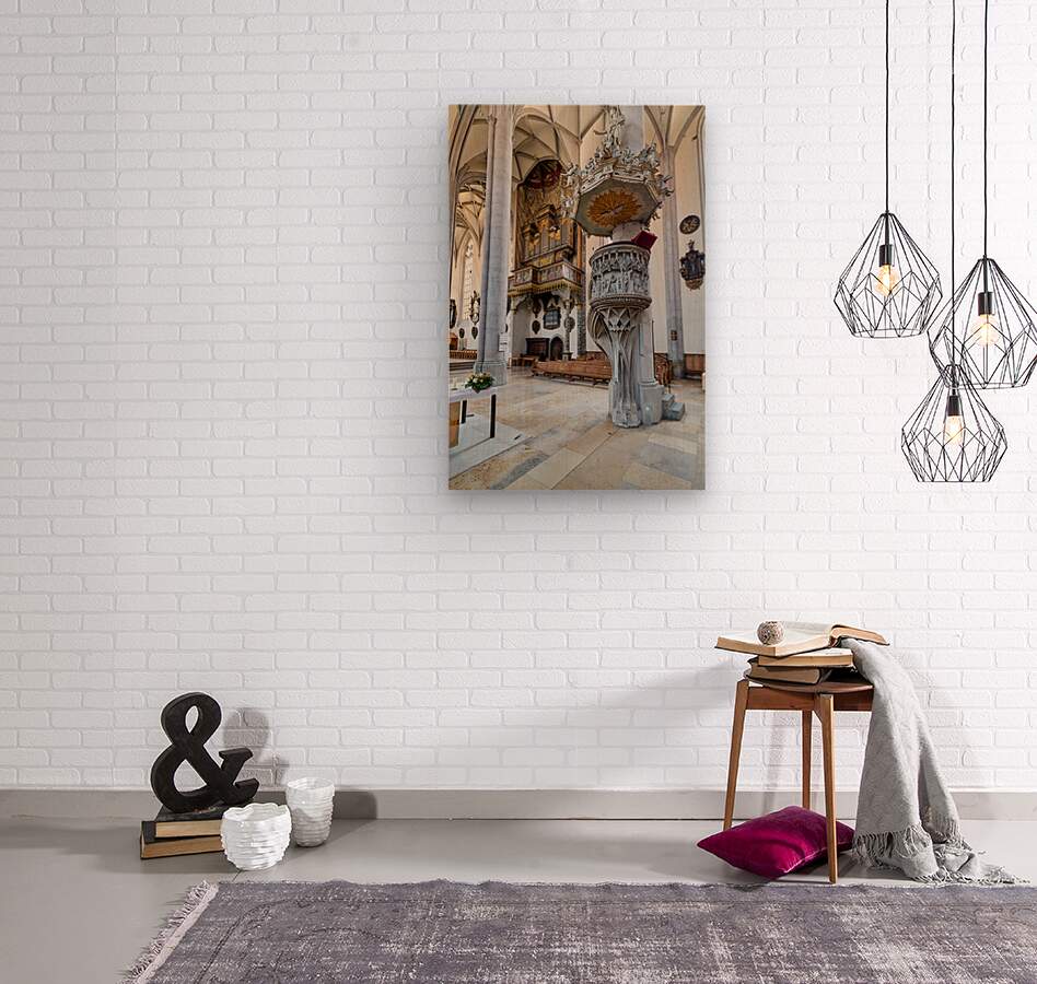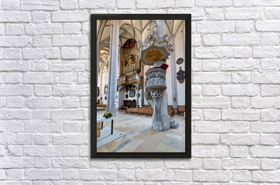 People explore the interior of St. Georgs Kirche in Nordlingen. The church features a tall organ and detailed stonework.