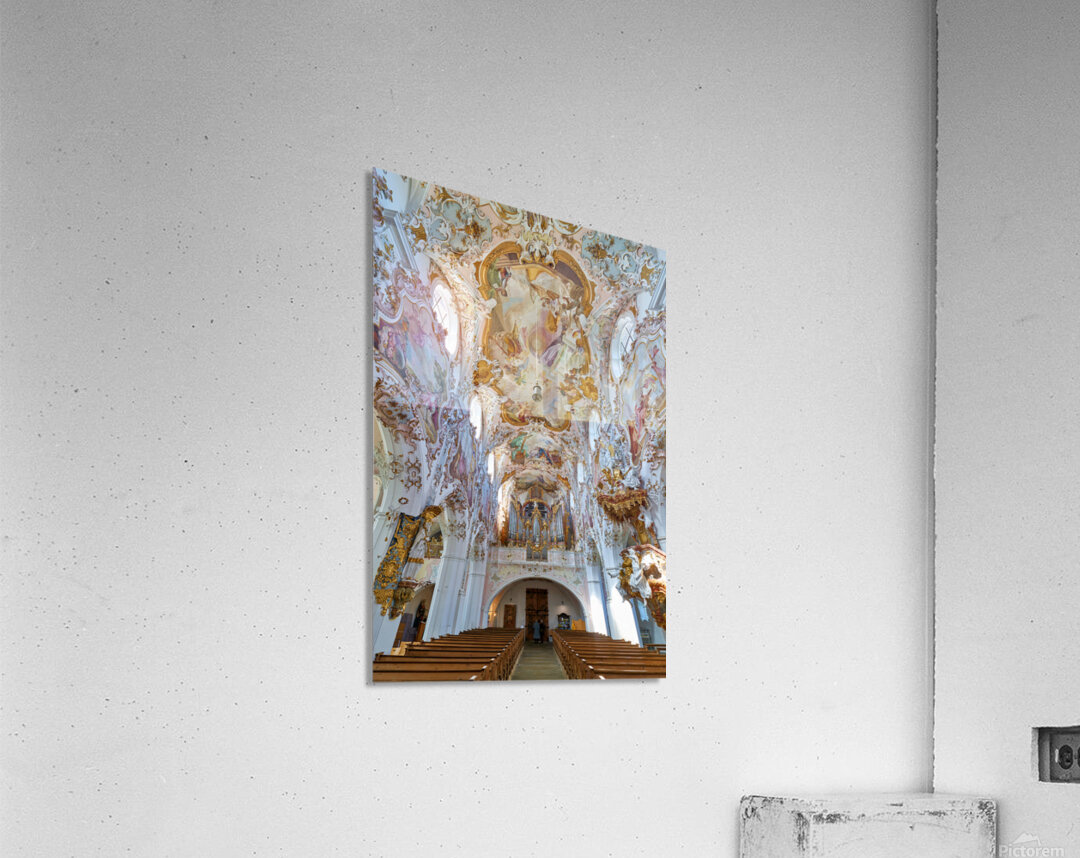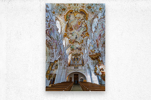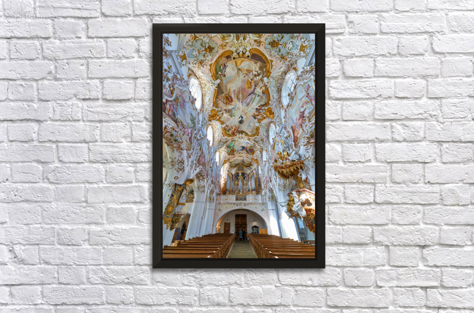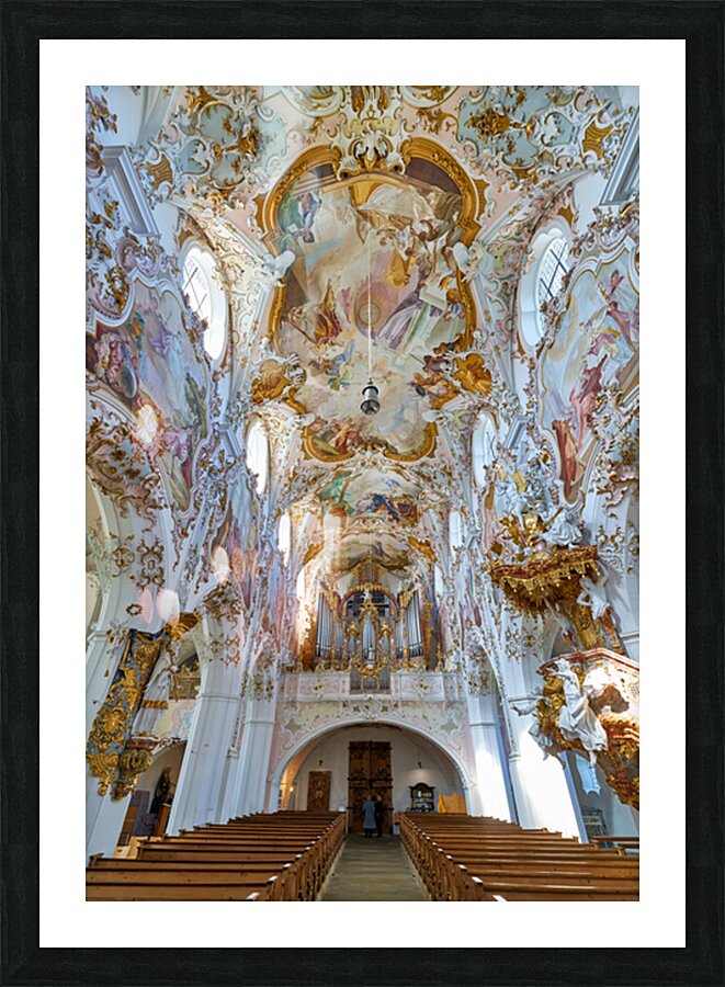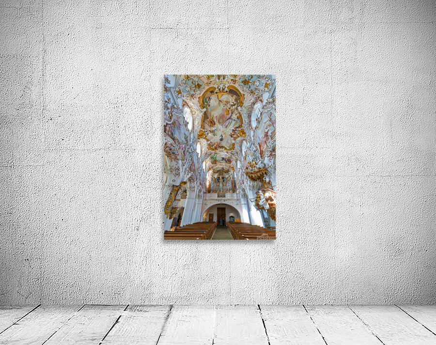 Inside Maria Geburt Church visitors can see the detailed ceiling artwork and organ. The church is located in Rottenbuch Germany.