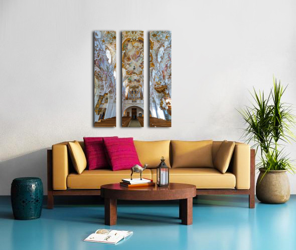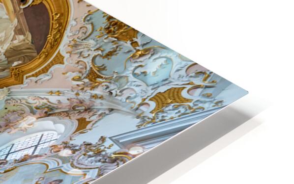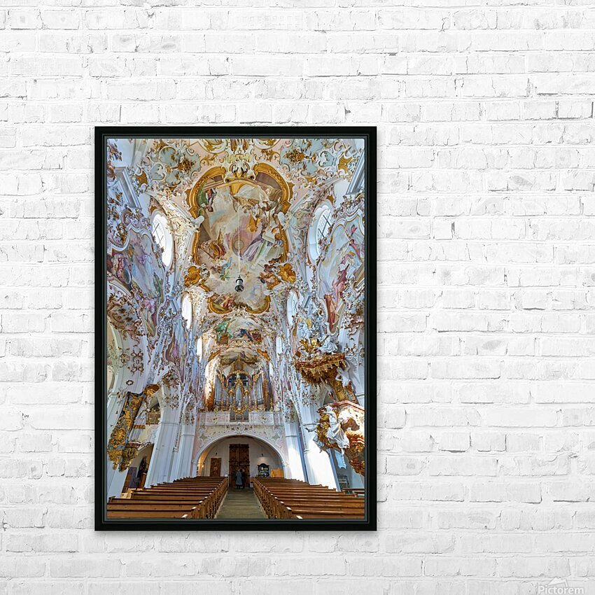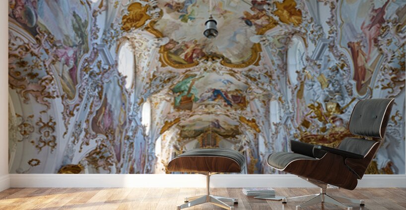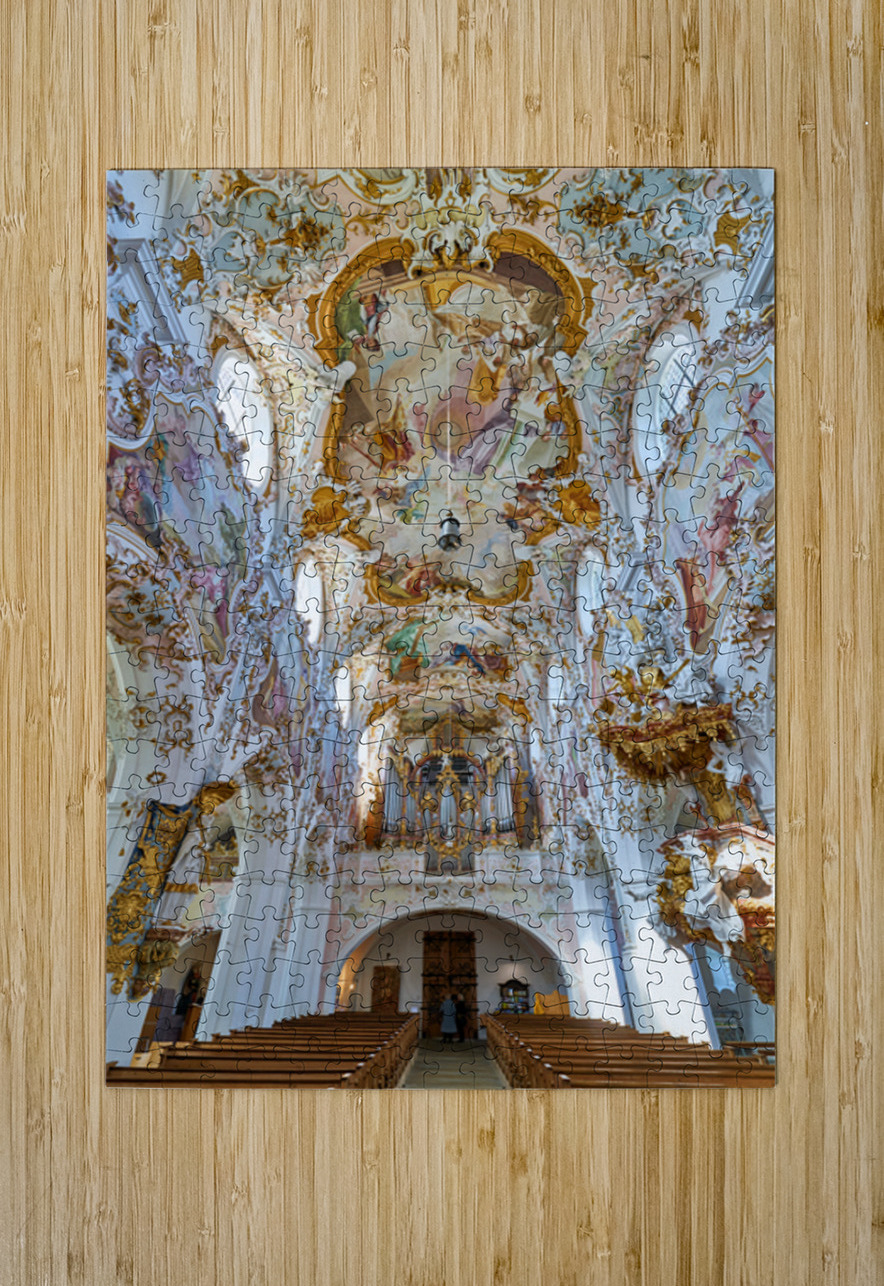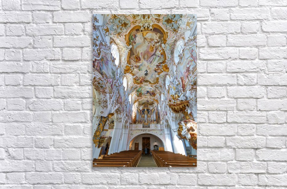 Inside Maria Geburt Church visitors can see the detailed ceiling artwork and organ. The church is located in Rottenbuch Germany.