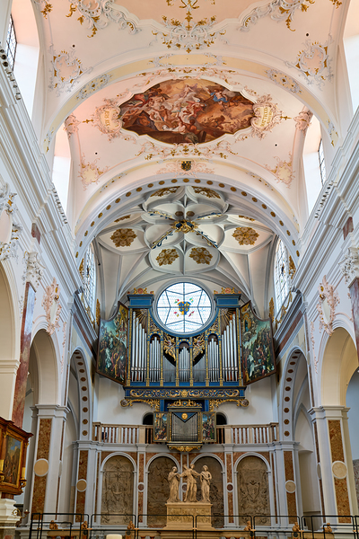 Visitors explore the interior of St. Annes Church in Augsburg. The church features art sculptures and a large organ.