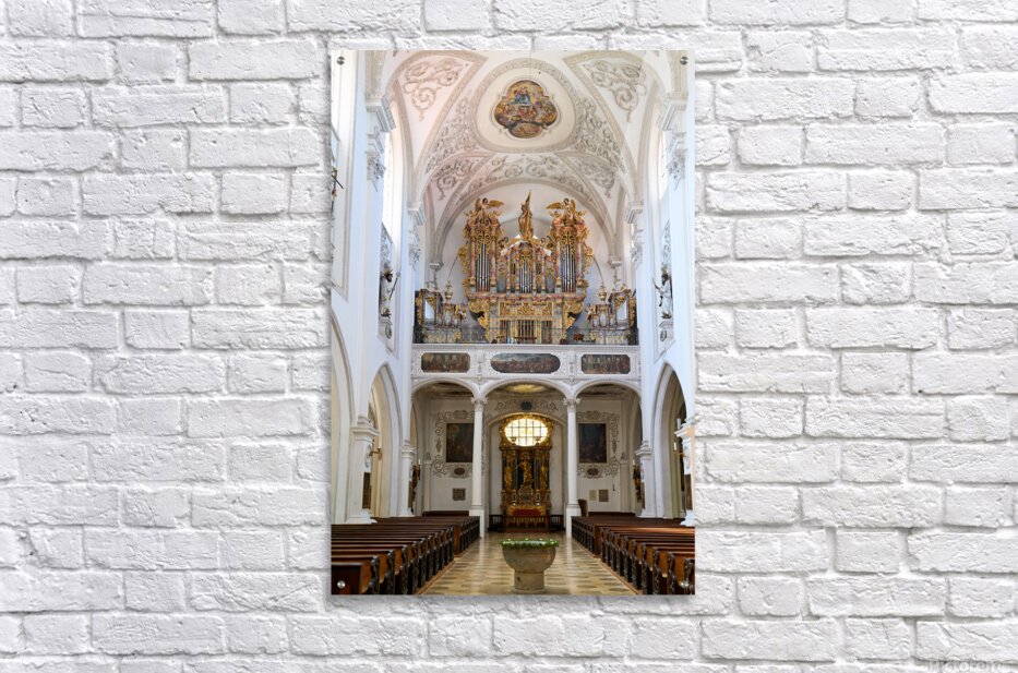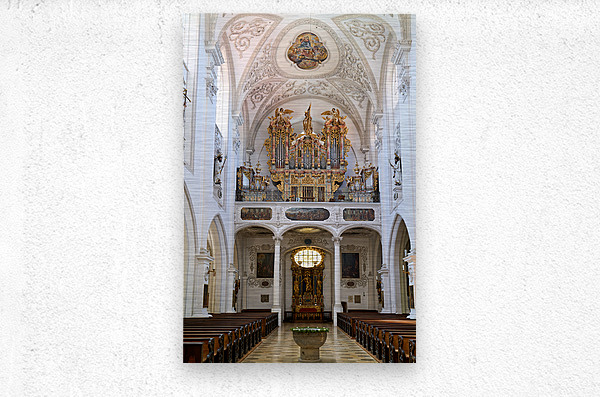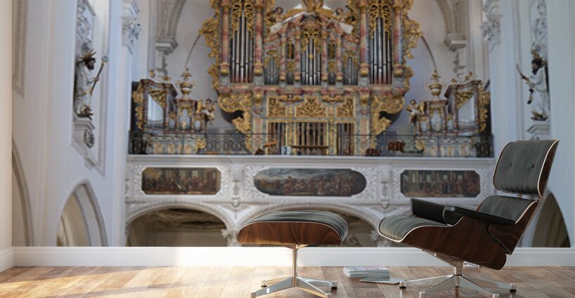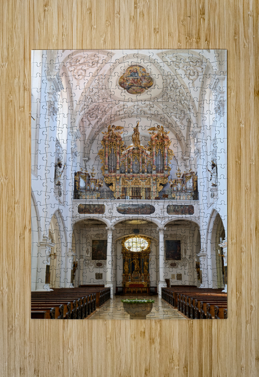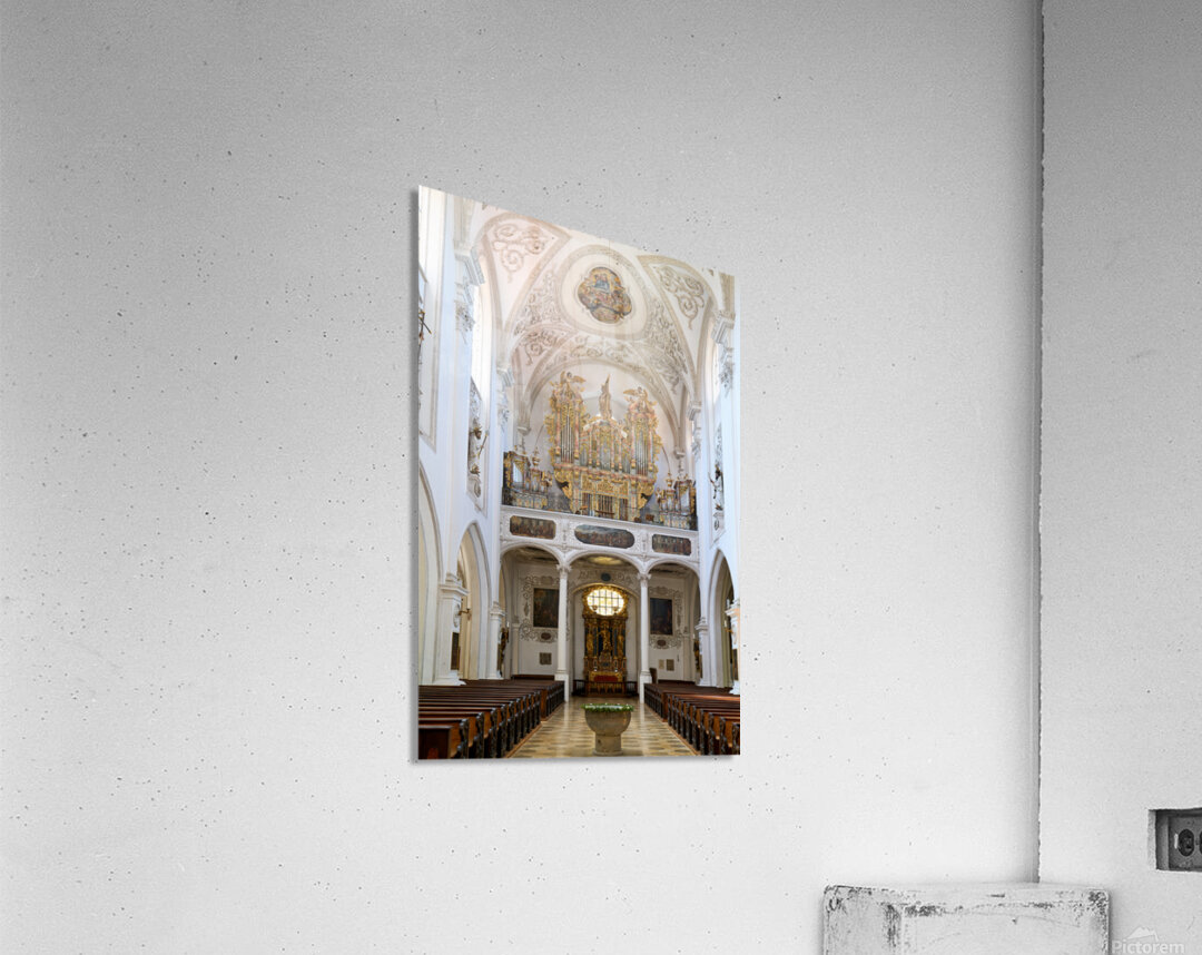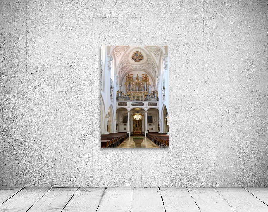 The interior of the Church of the Assumption of Mary in Landsberg am Lech. Visitors observe the large altar and organ.