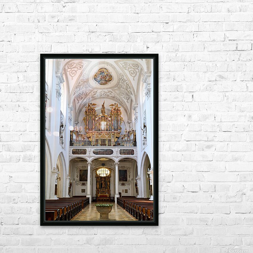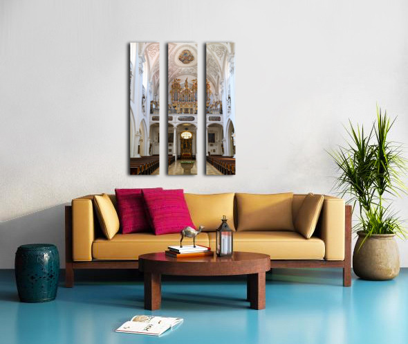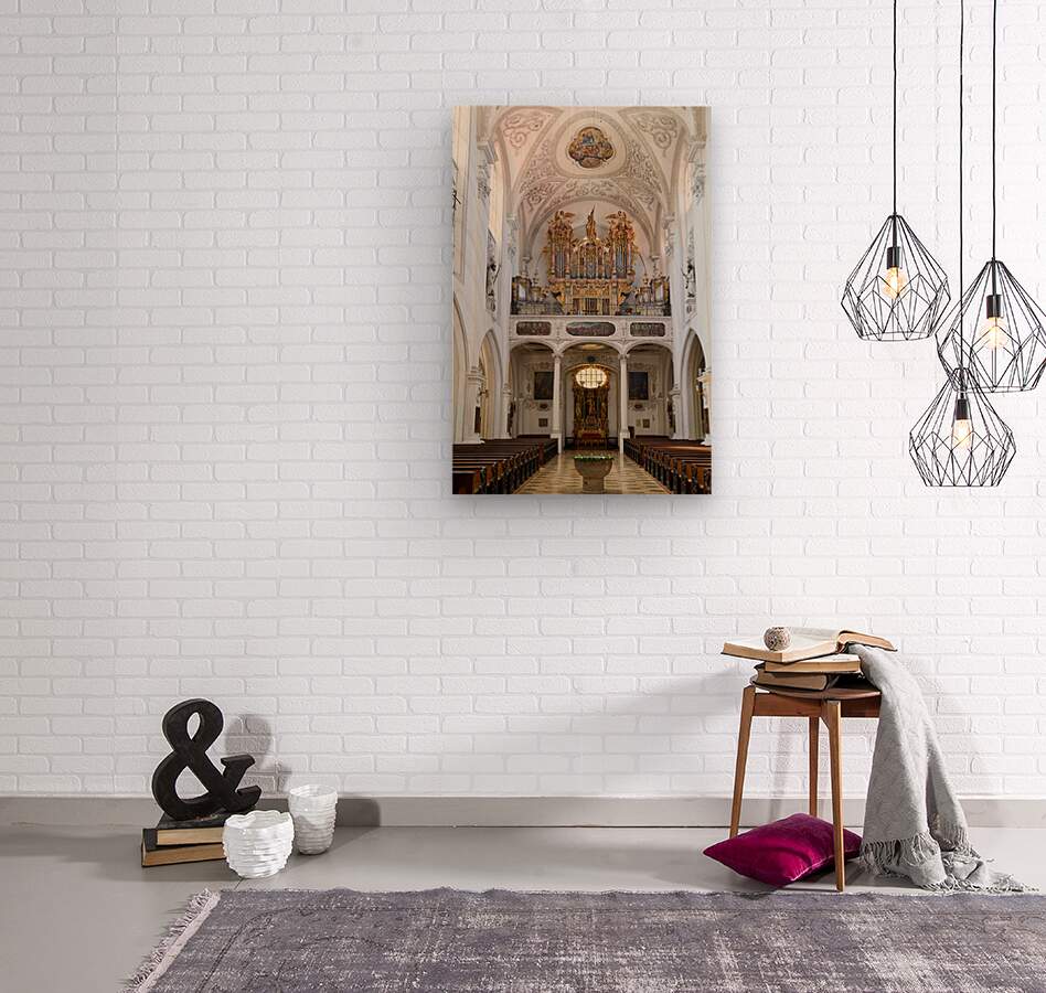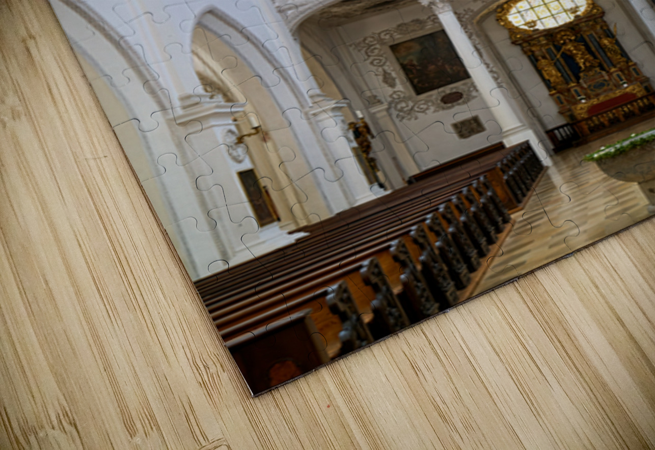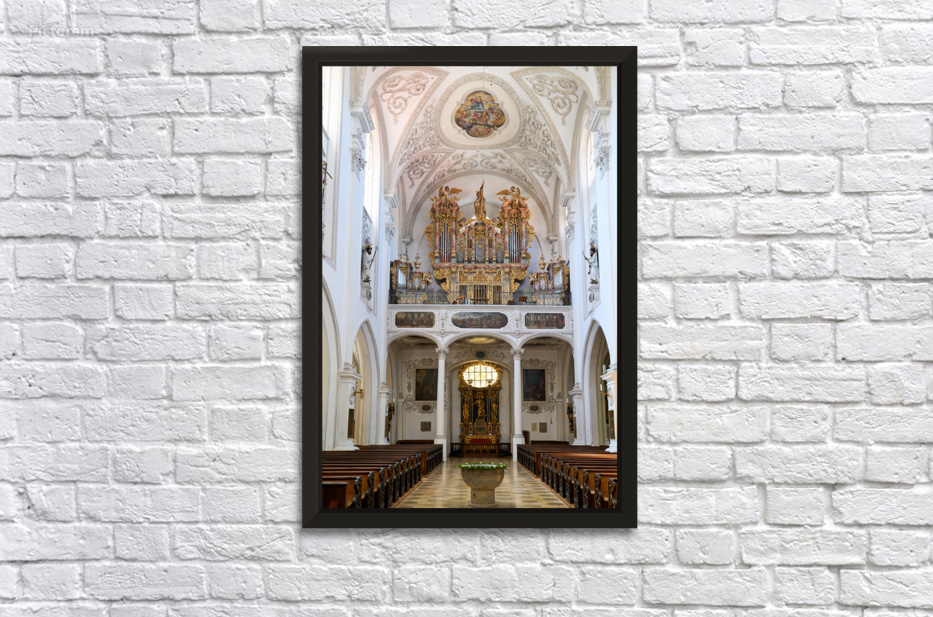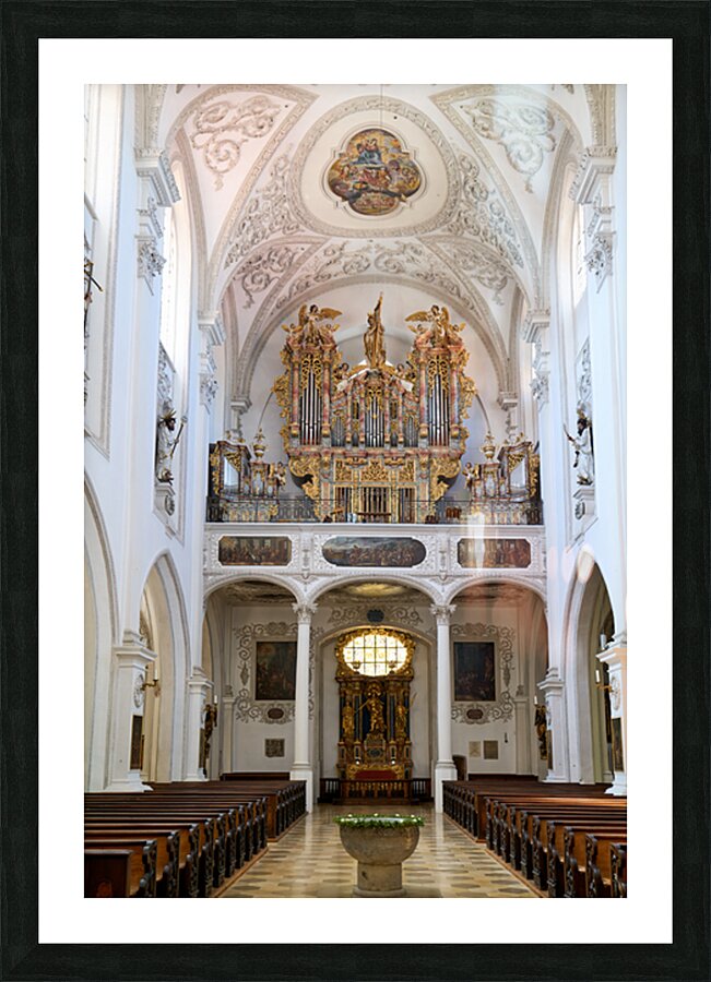 The interior of the Church of the Assumption of Mary in Landsberg am Lech. Visitors observe the large altar and organ.