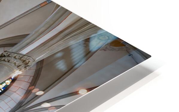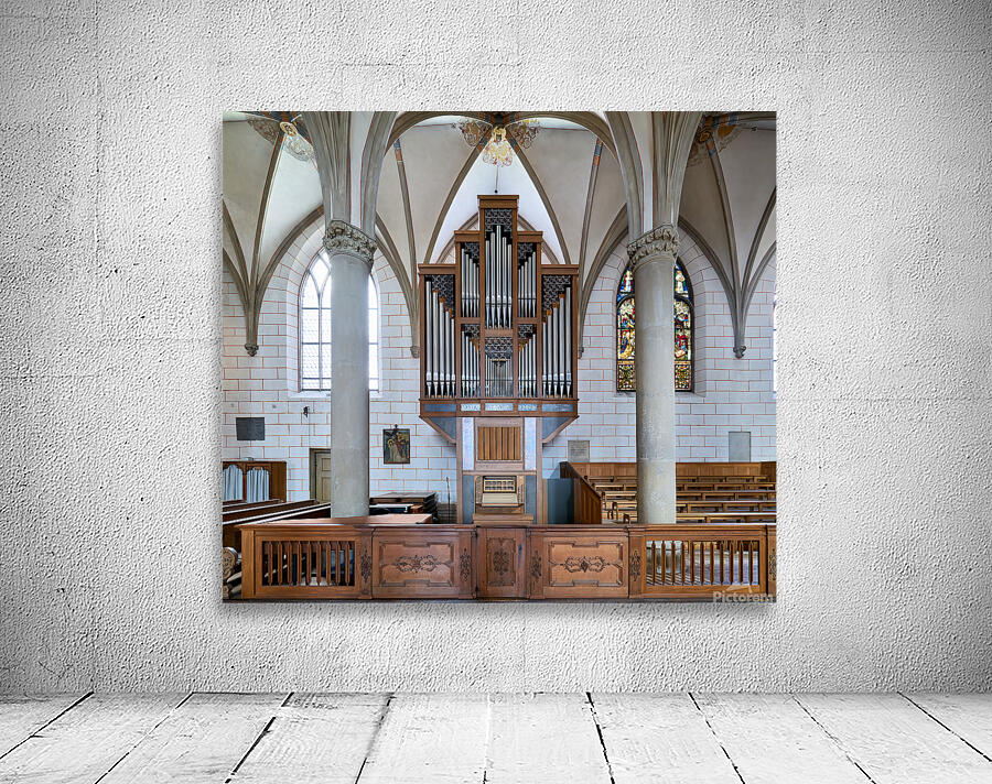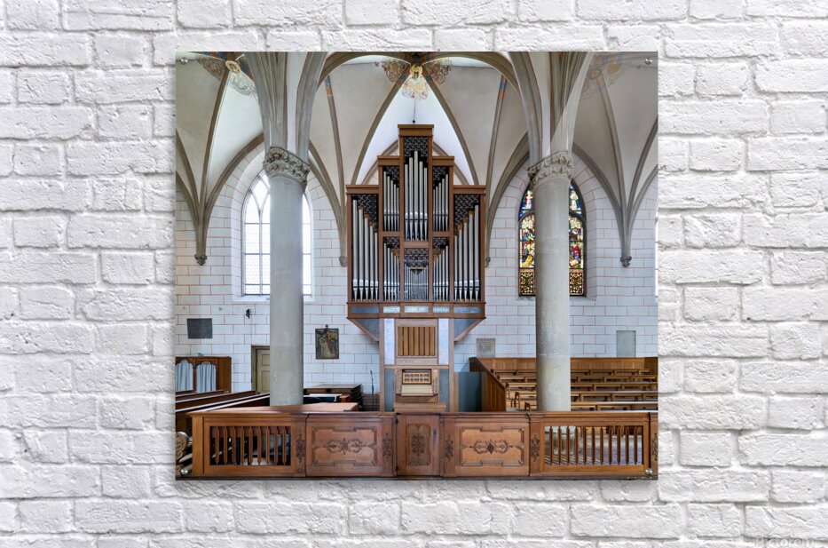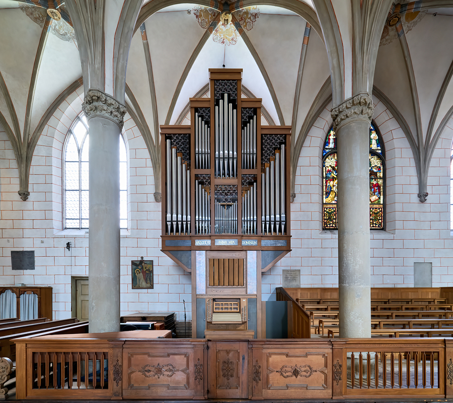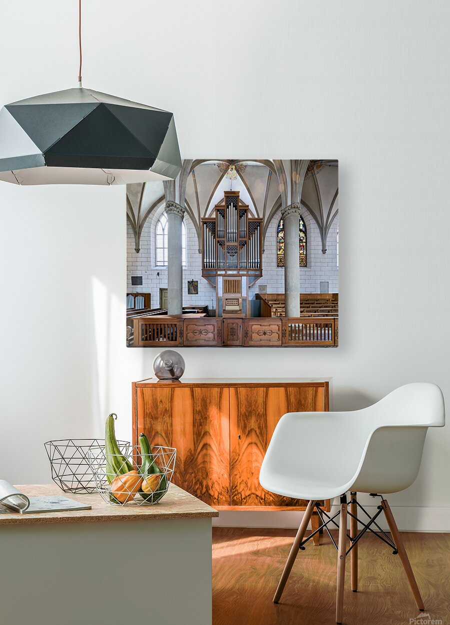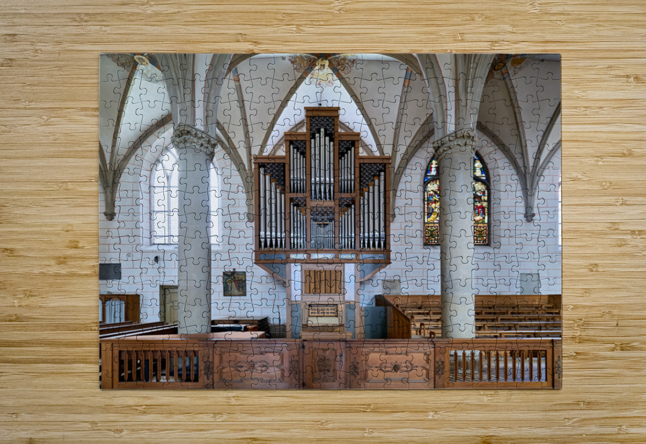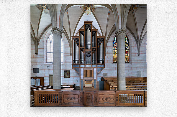 People explore Augsburg Dom Cathedral in Bavaria. The interior features tall arches a large organ and colorful stained glass windows.