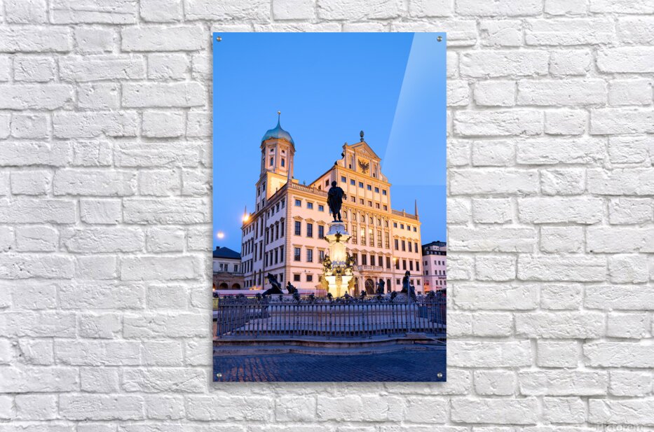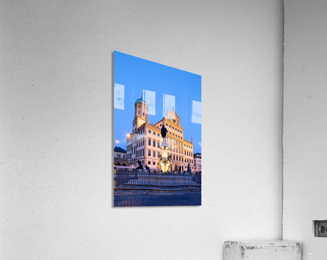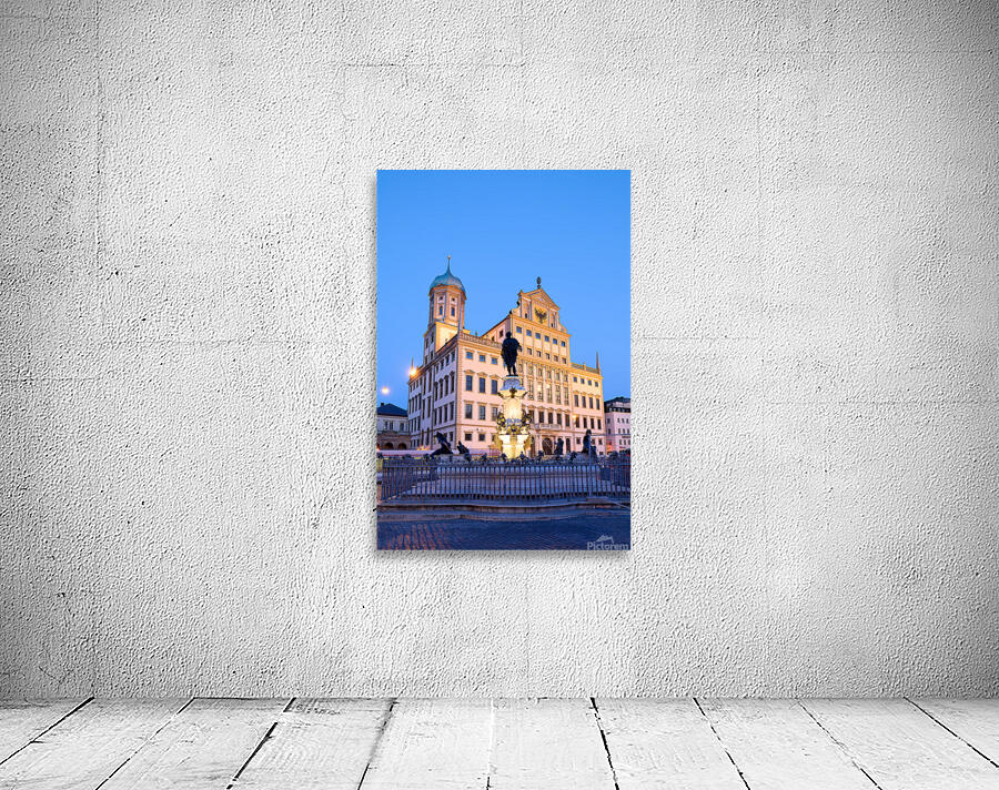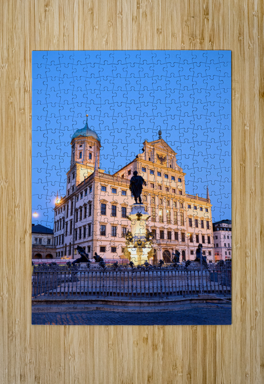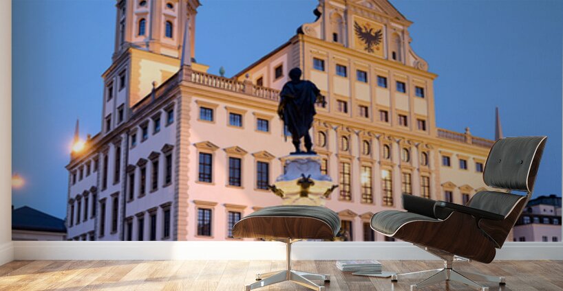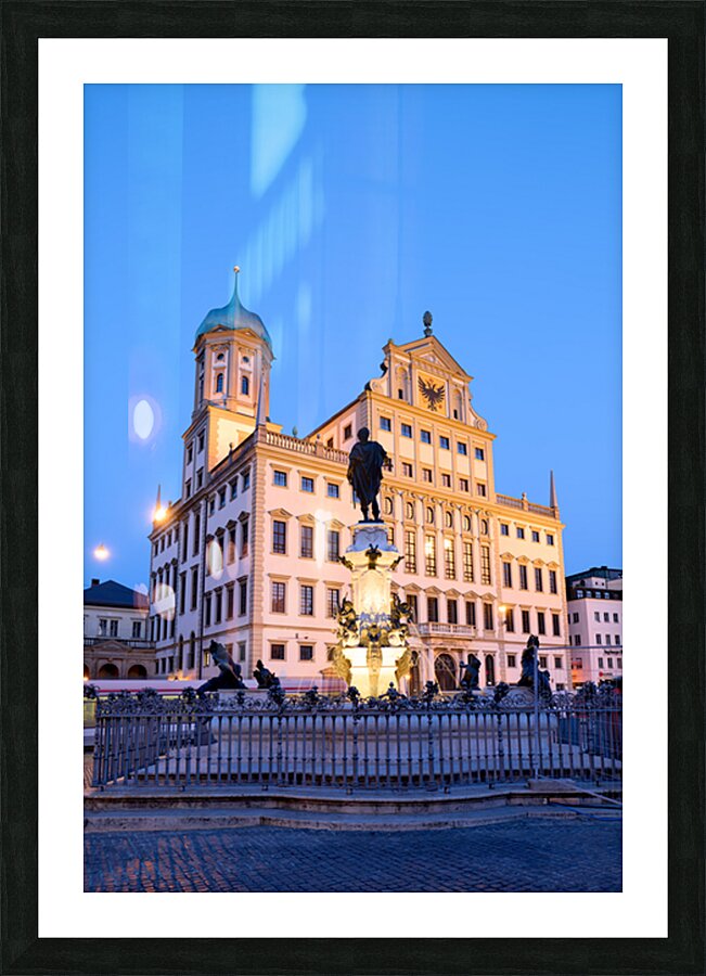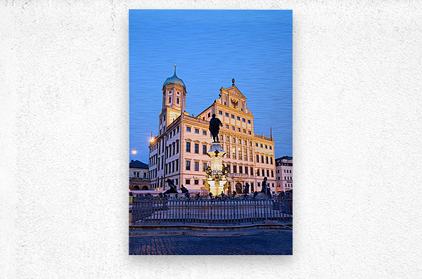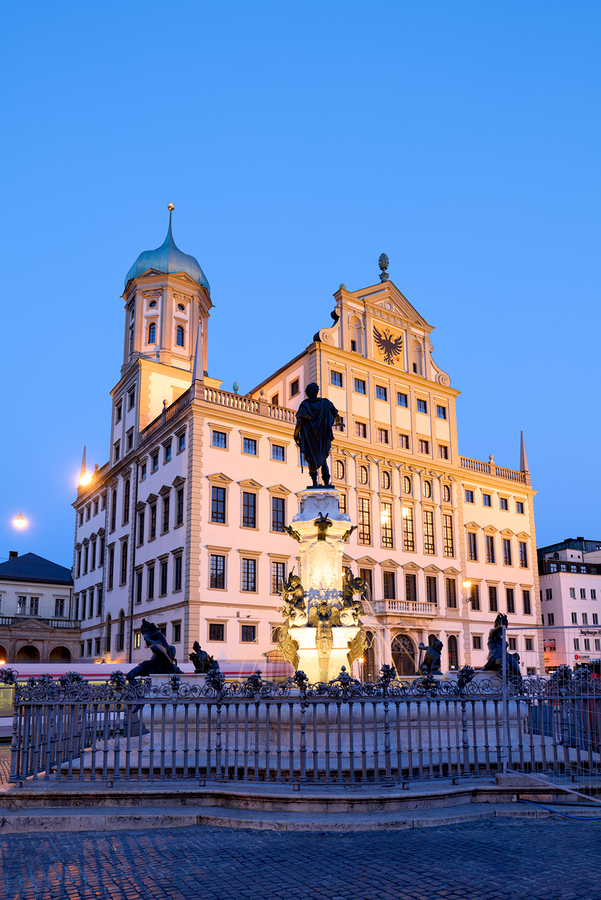 People gather around the fountain at Rathausplatz in Augsburg during twilight. The Town Hall stands tall in the background.
