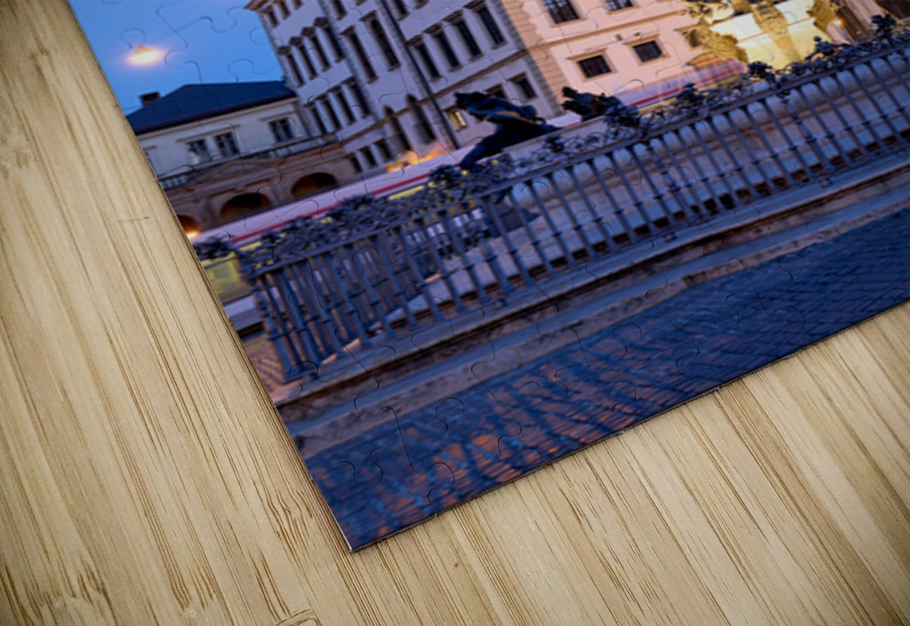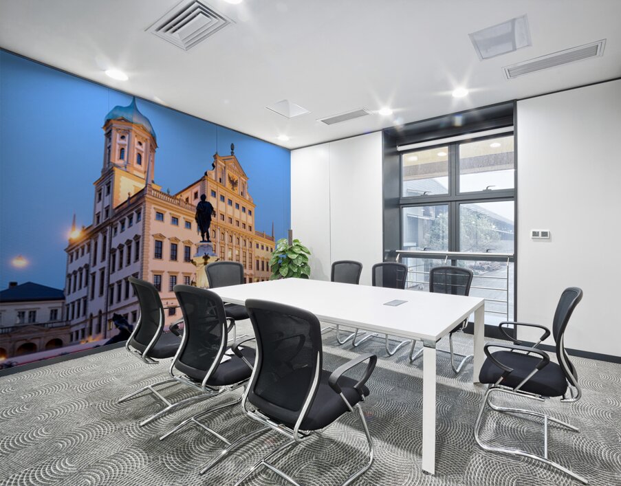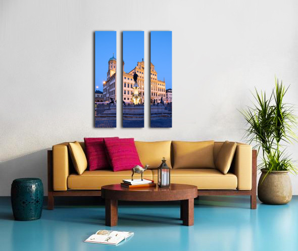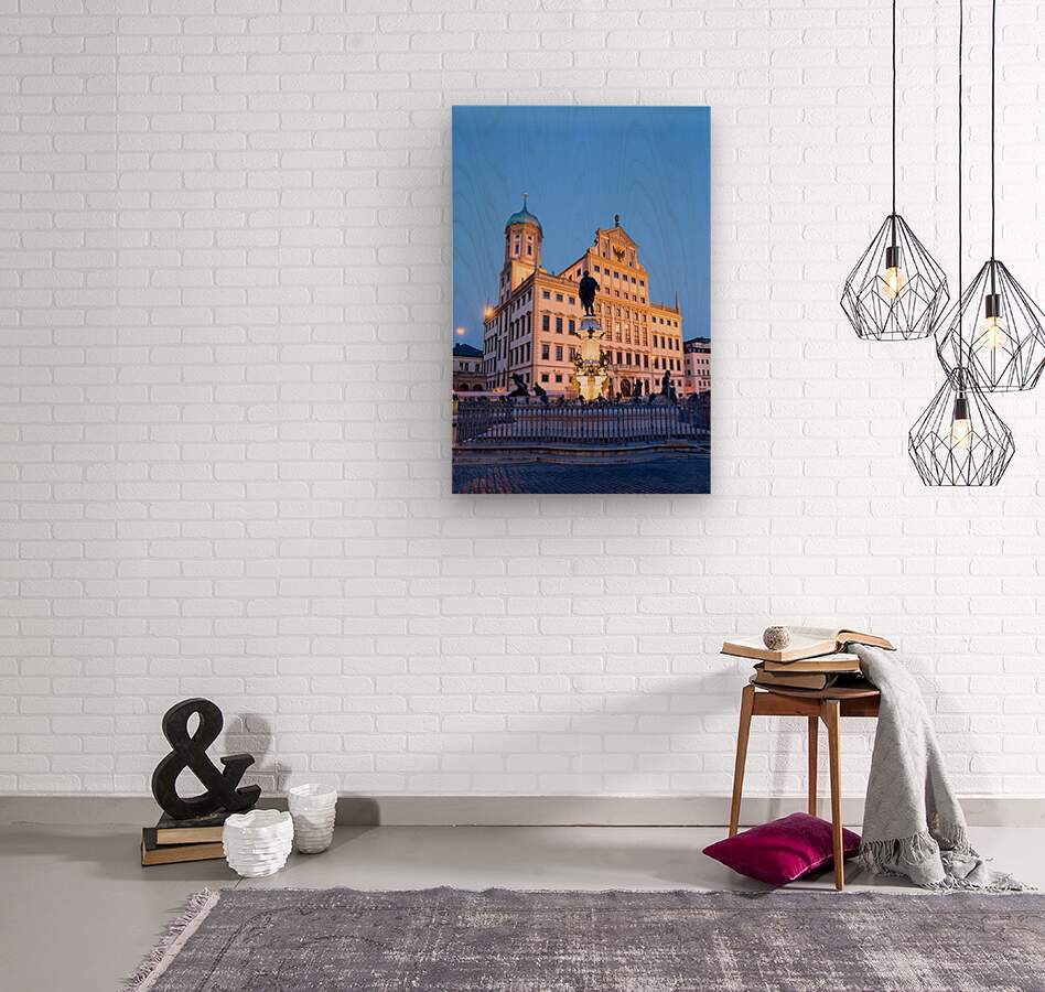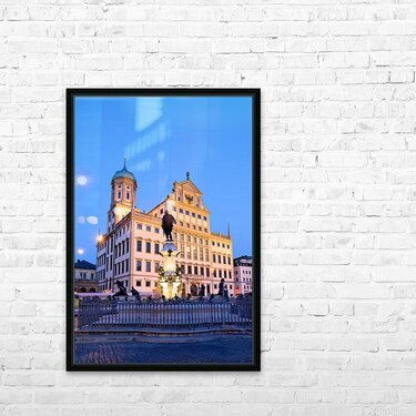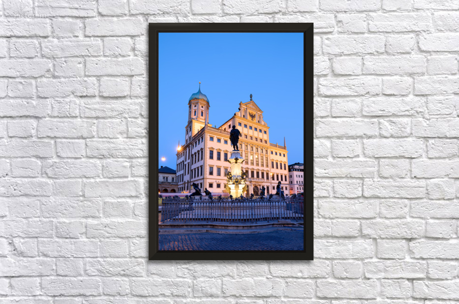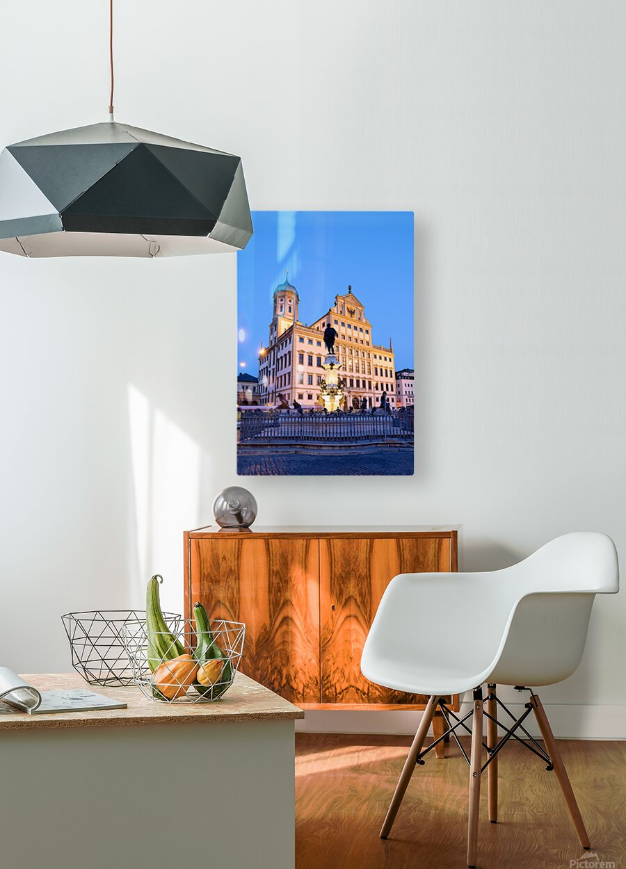 People gather around the fountain at Rathausplatz in Augsburg during twilight. The Town Hall stands tall in the background.