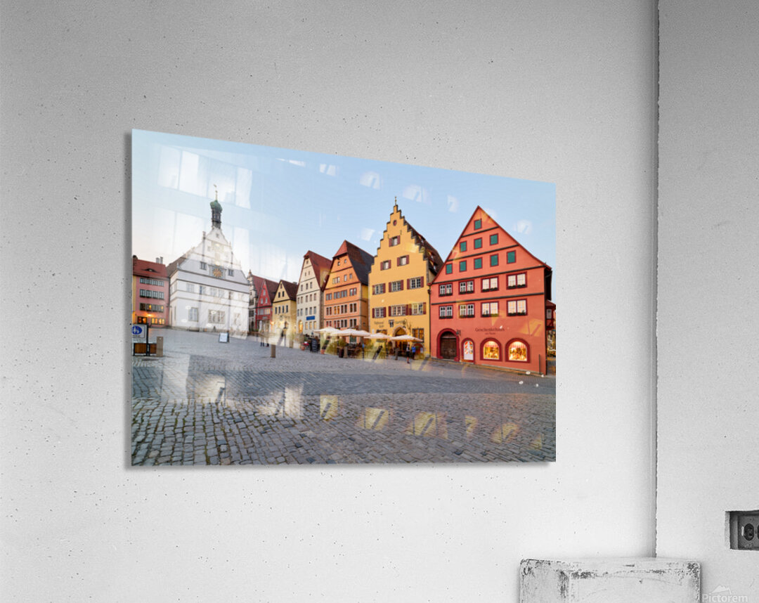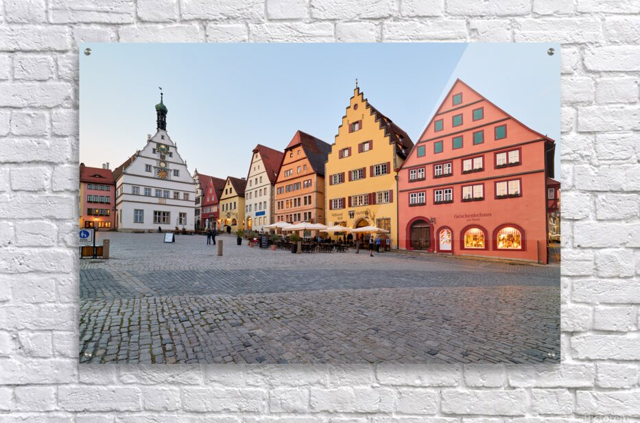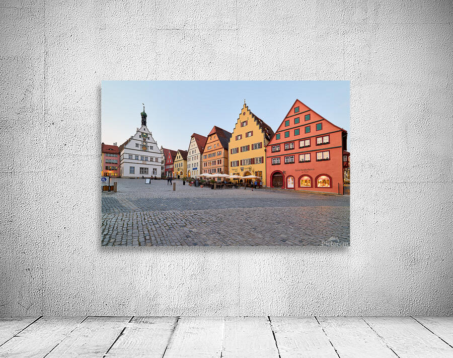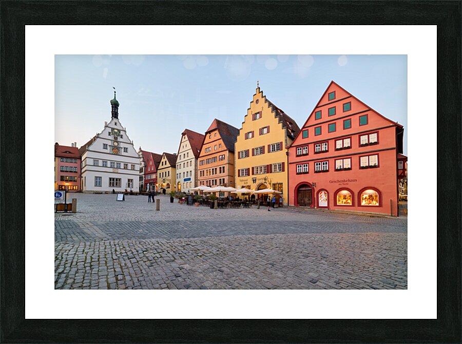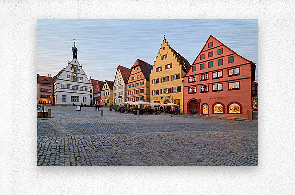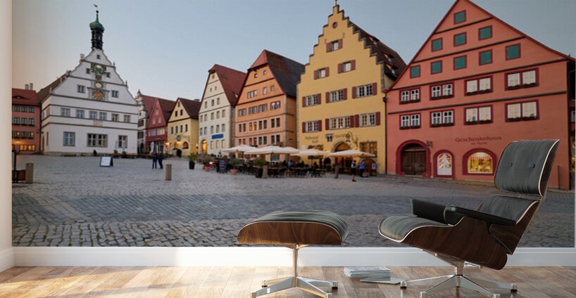 Rothenburg ob der Tauber features a market square with historic buildings and outdoor seating. Visitors explore and enjoy the vibrant atmosphere.