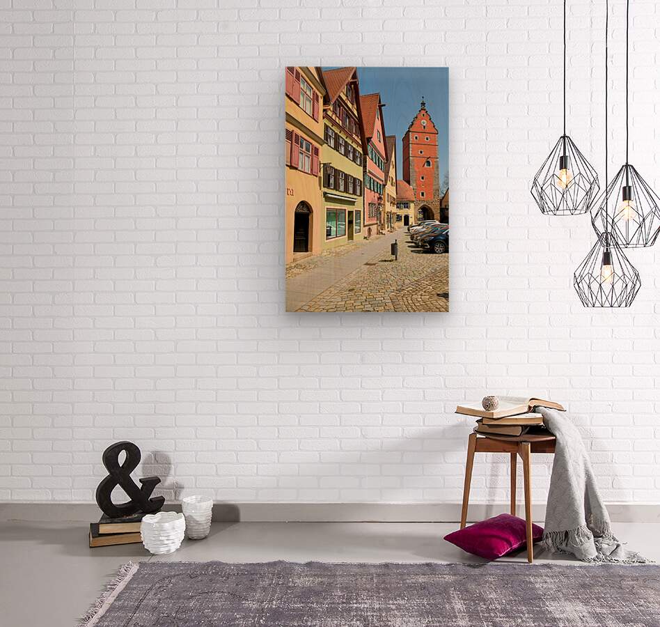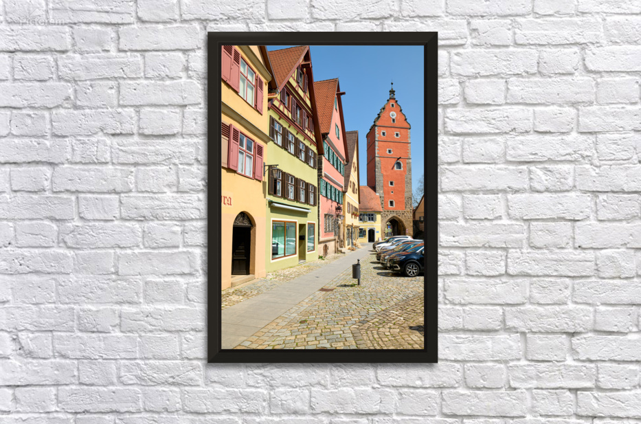 Visitors walk along cobblestone streets beside historic buildings near Wornitz Gate in Dinkelsbuhl during a clear day in Bavaria Germany.