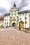 People walk through the entrance of Deutschordensschloss Castle in Bad Mergentheim located along the Romantic Road in Bavaria.