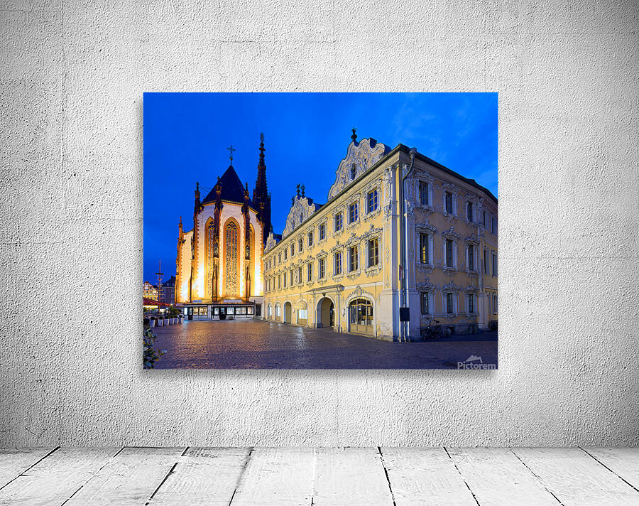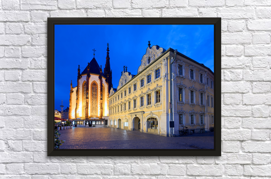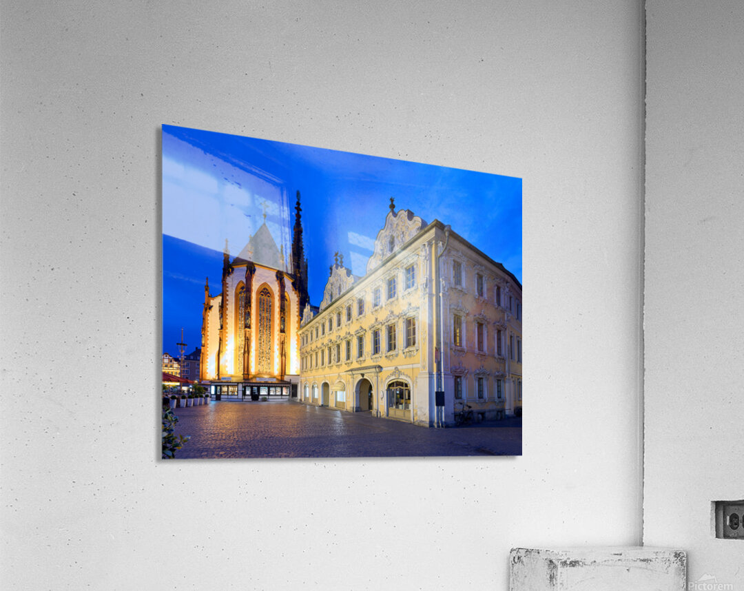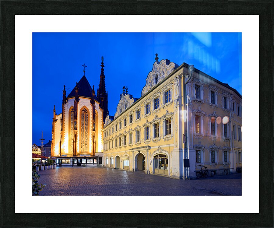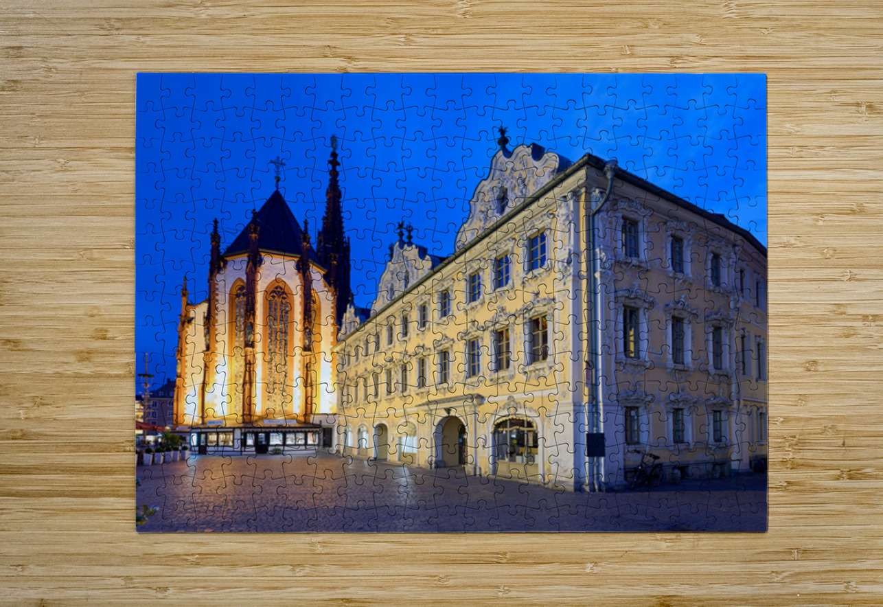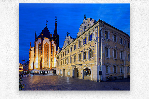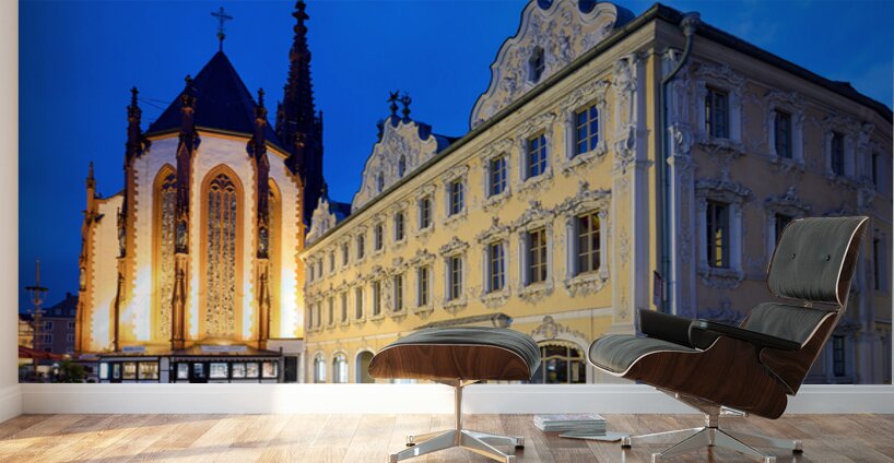 Visitors explore Marienkapelle and Falcon House in Wurzburg at dusk. The buildings are illuminated against a darkening sky.