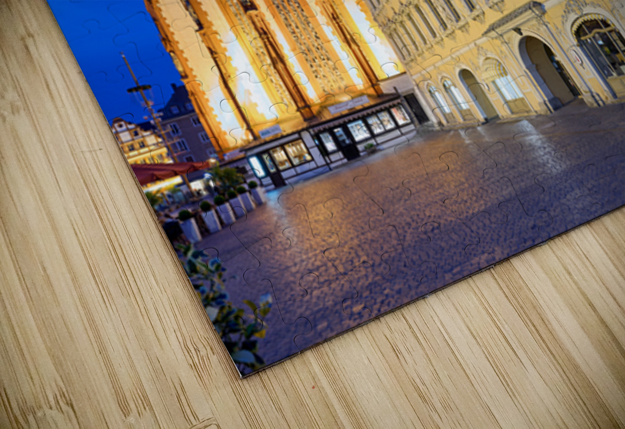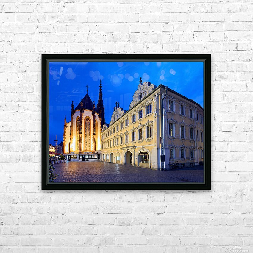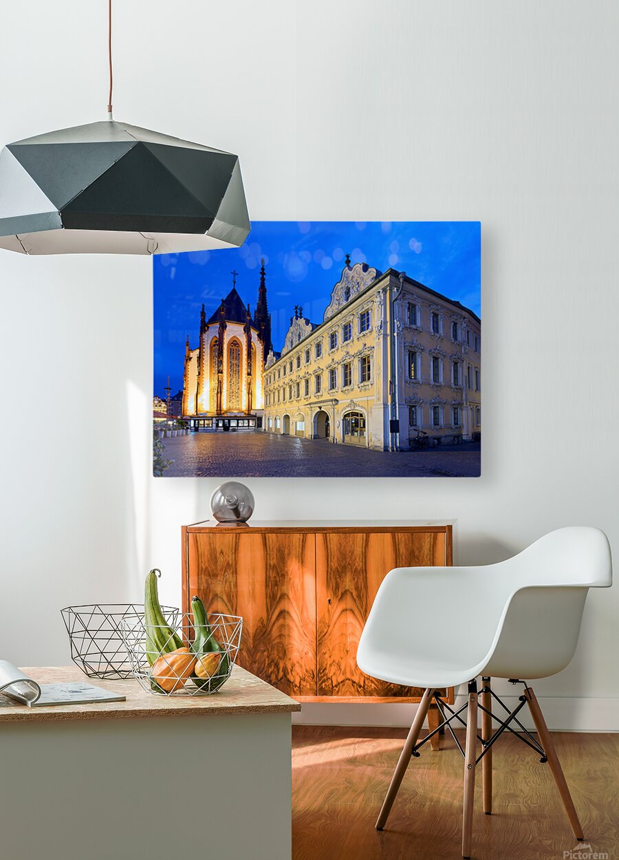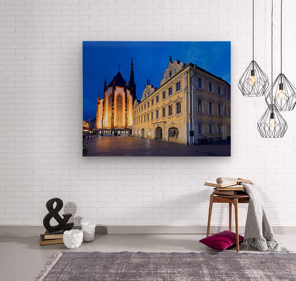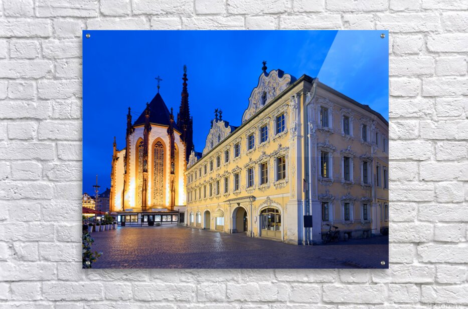 Visitors explore Marienkapelle and Falcon House in Wurzburg at dusk. The buildings are illuminated against a darkening sky.