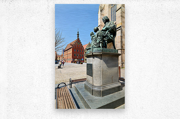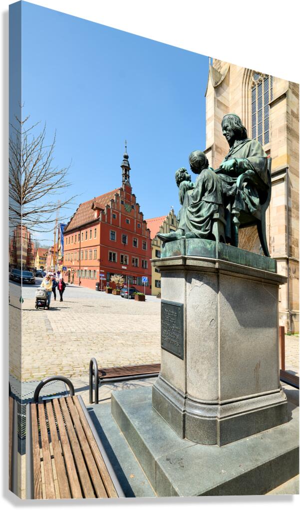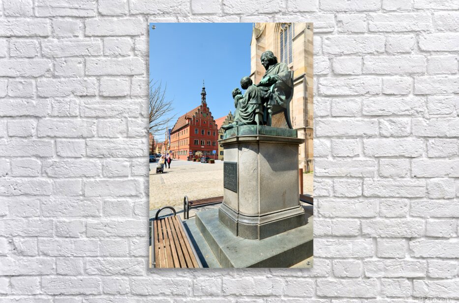 Get this artwork "Visitors explore Dinkelsbuhl old town and historical statue" in a framed print.