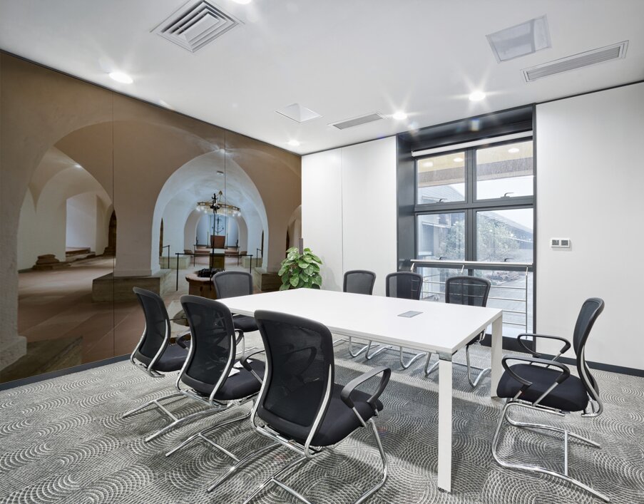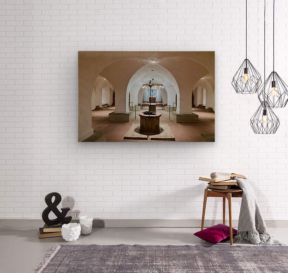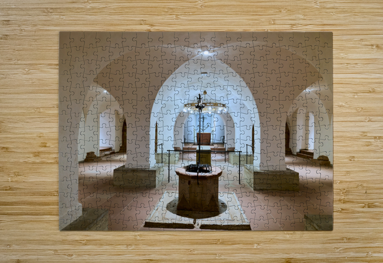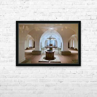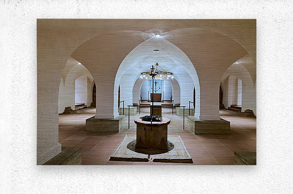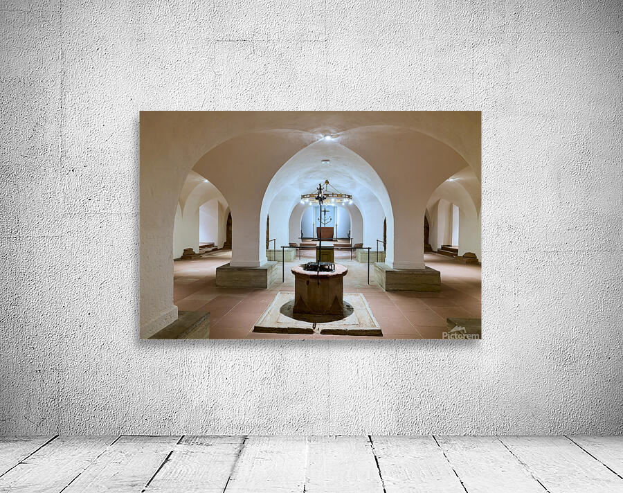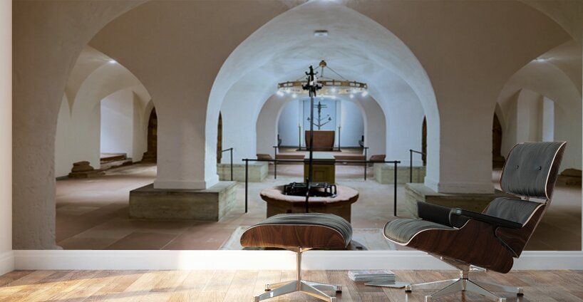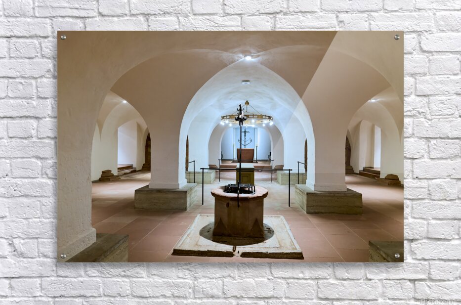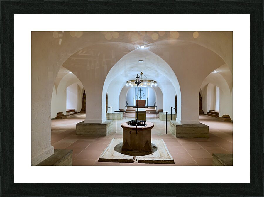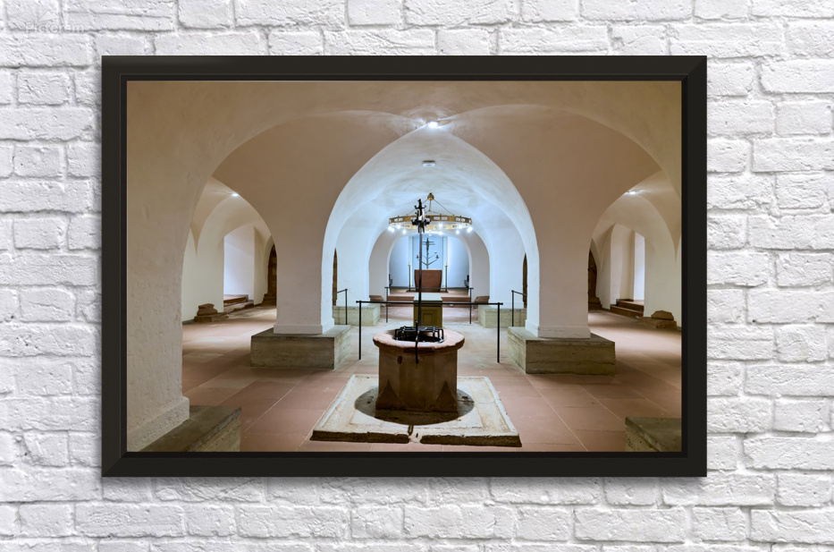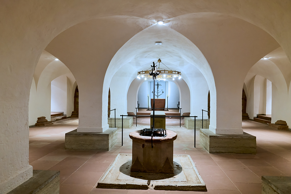 The crypt of Wurzburg Dom Cathedral in Germany shows stone architecture and a central well. Visitors explore the historical site in Bavaria.
