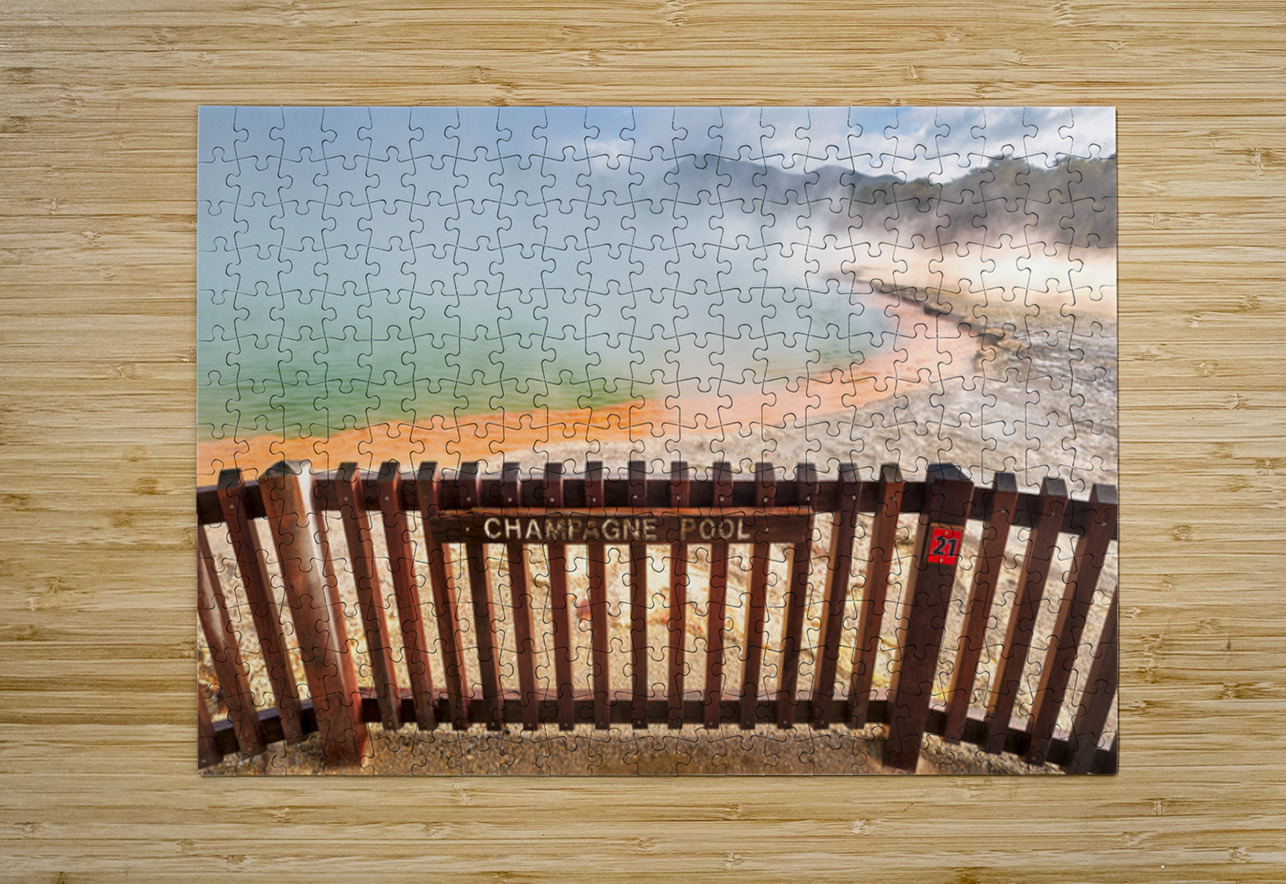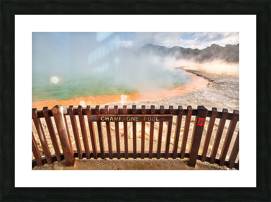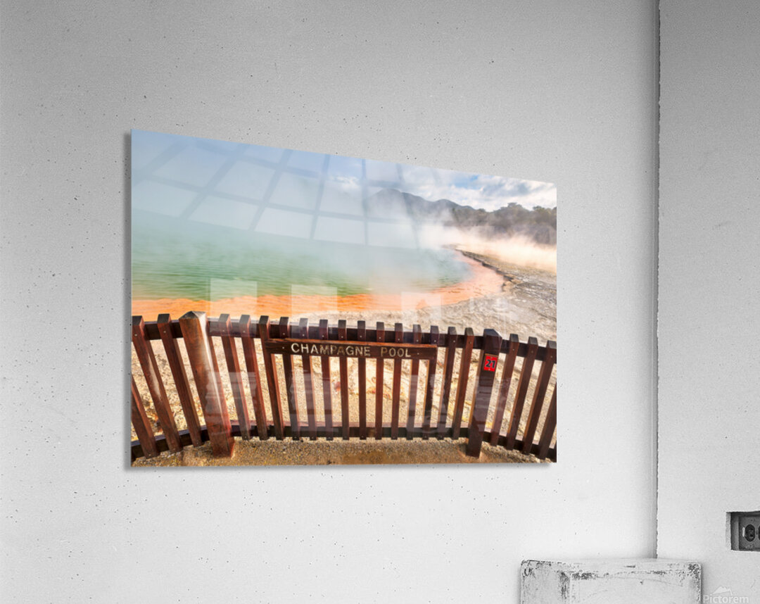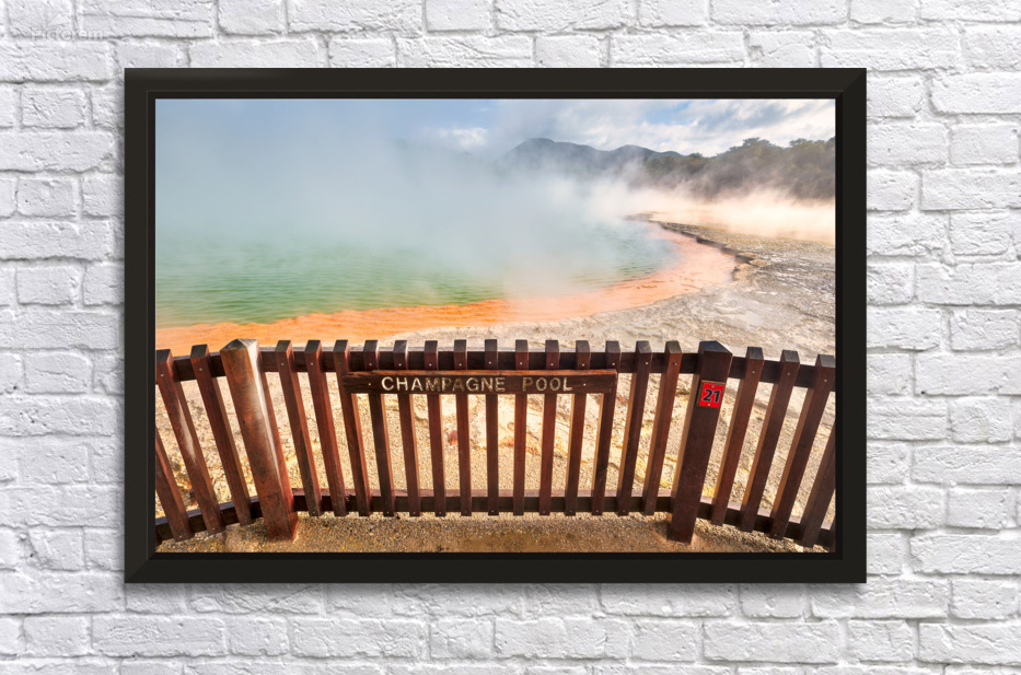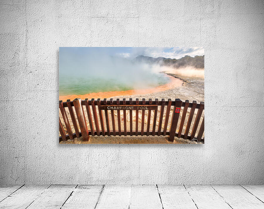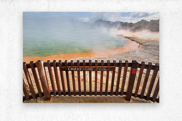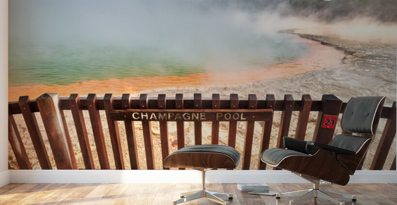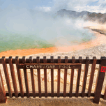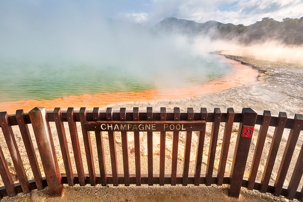 Visitors explore Champagne Pool at Waiotapu Thermal Wonderland in Rotorua New Zealand. Steam rises from the colorful geothermal area.