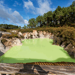 Devils Bath shows its bright green water in Waiotapu Thermal Wonderland of Rotorua. Visitors can see the unique landscape and geothermal features.