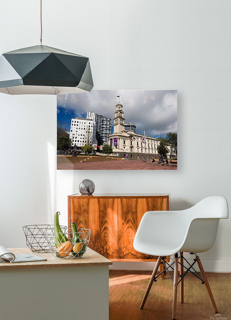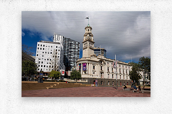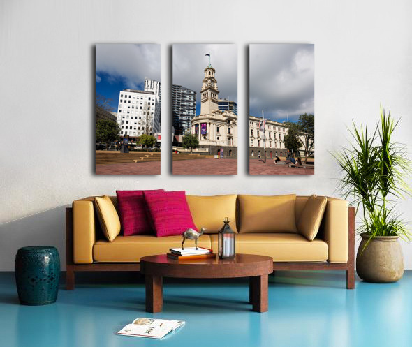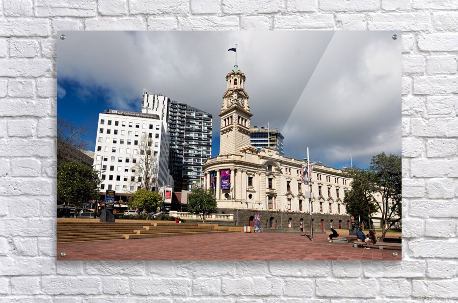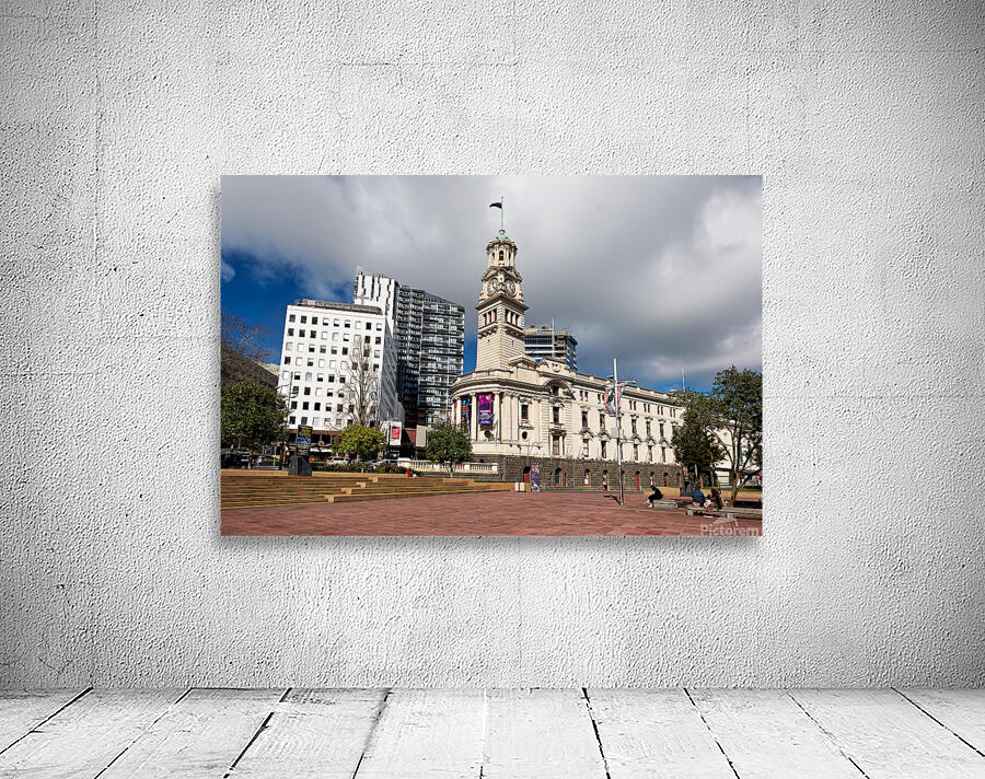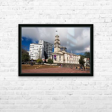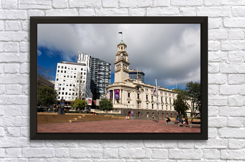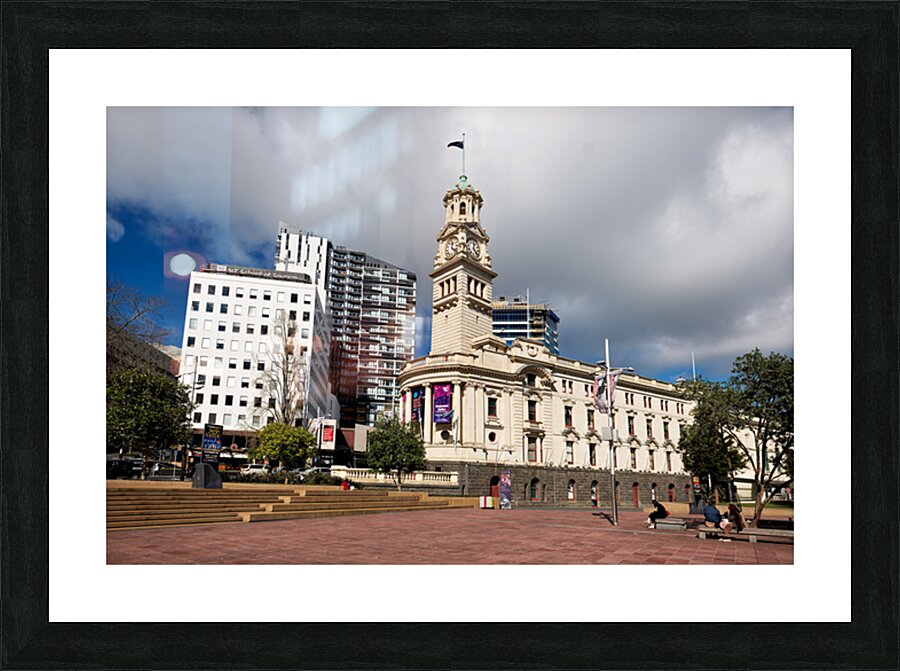 "Town hall in Aotea Square during the day in Auckland New Zealan" in a framed print.