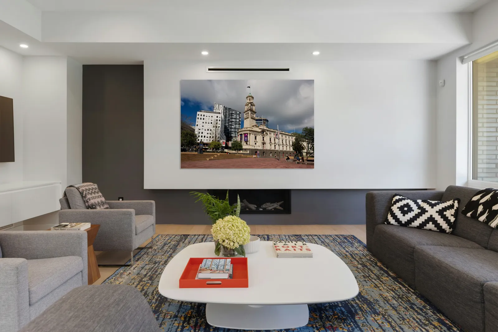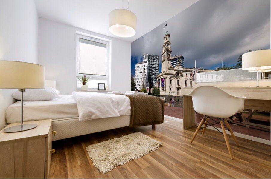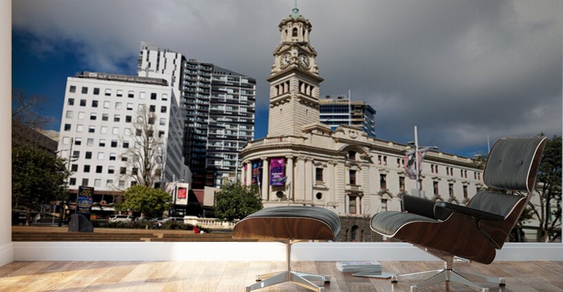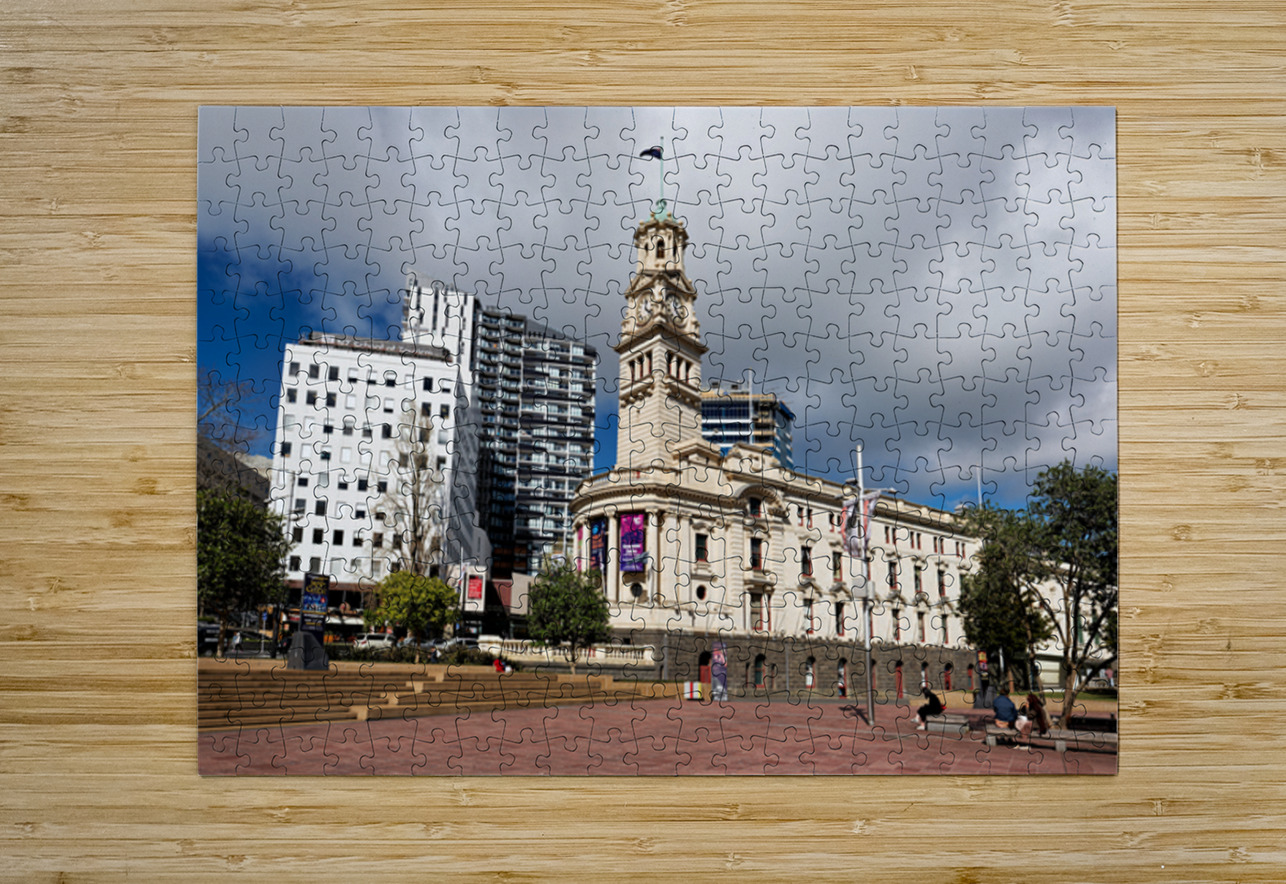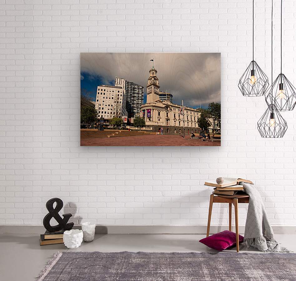 "Town hall in Aotea Square during the day in Auckland New Zealan" in a framed print.