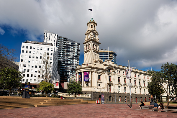 People walk and sit around the town hall in Aotea Square. Buildings surround the square under a partly cloudy sky.