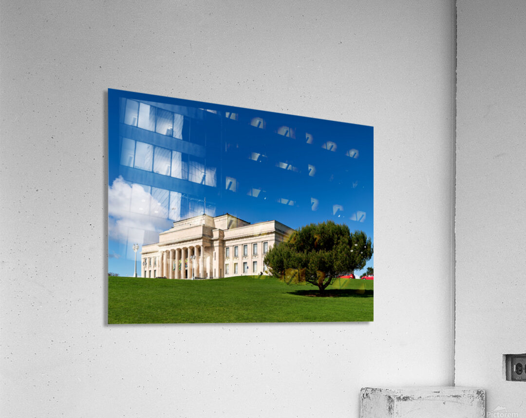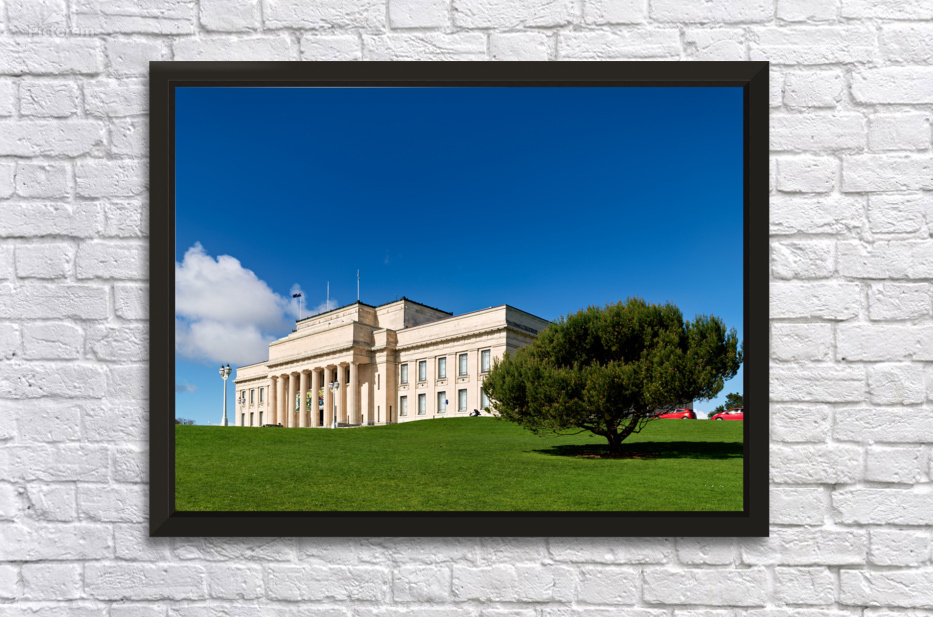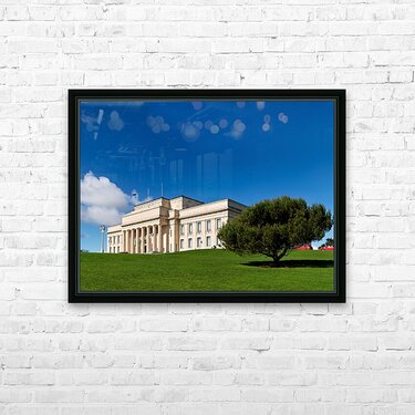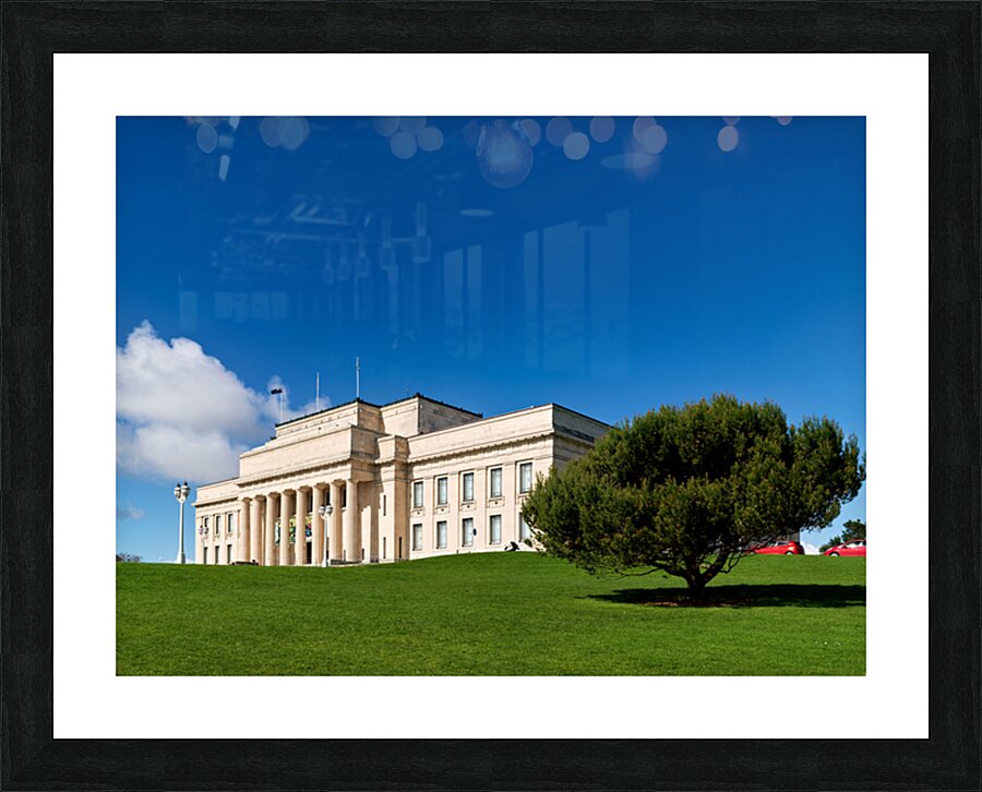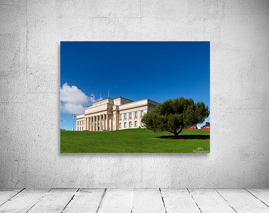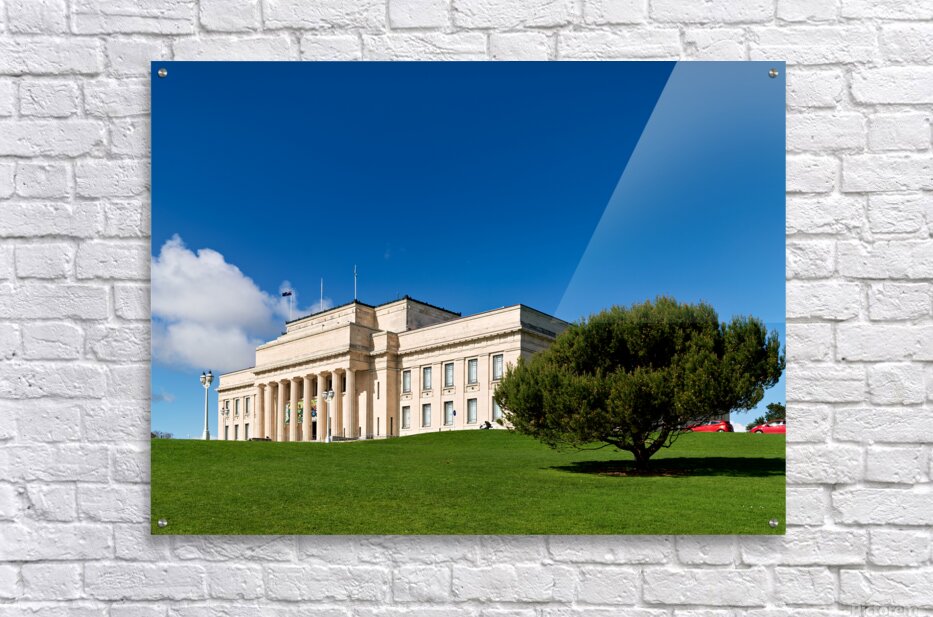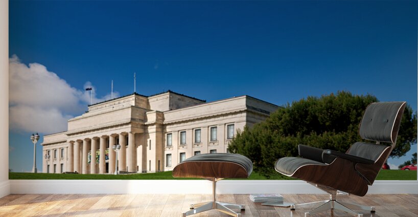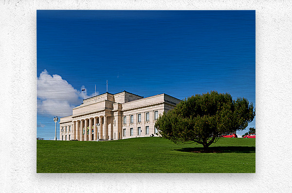 People enjoy visiting the entrance of Auckland War Memorial Museum on a sunny day. The building stands tall against the blue sky.