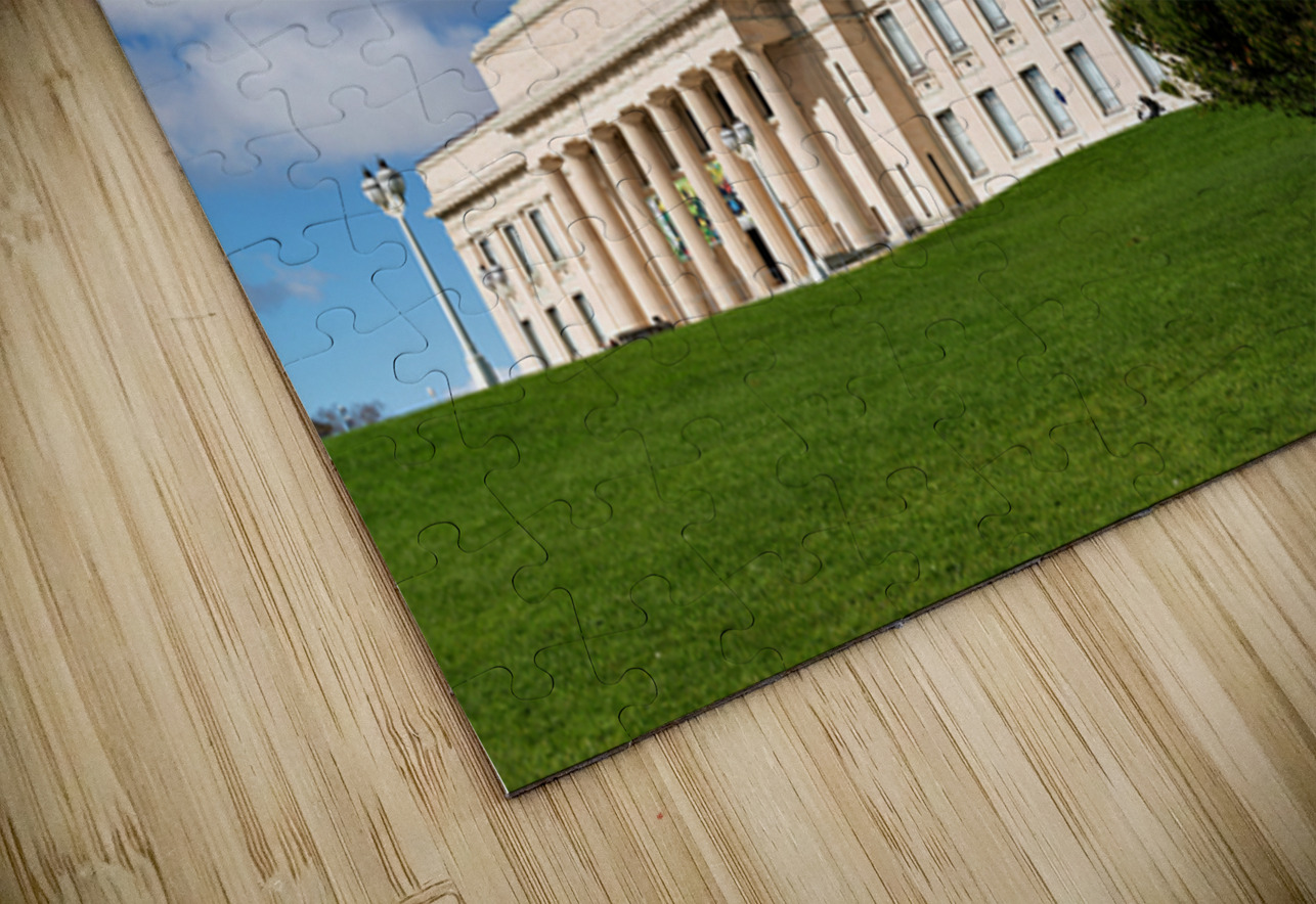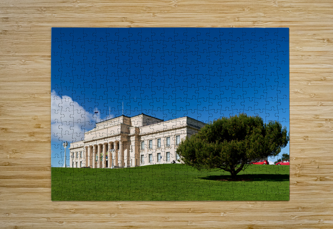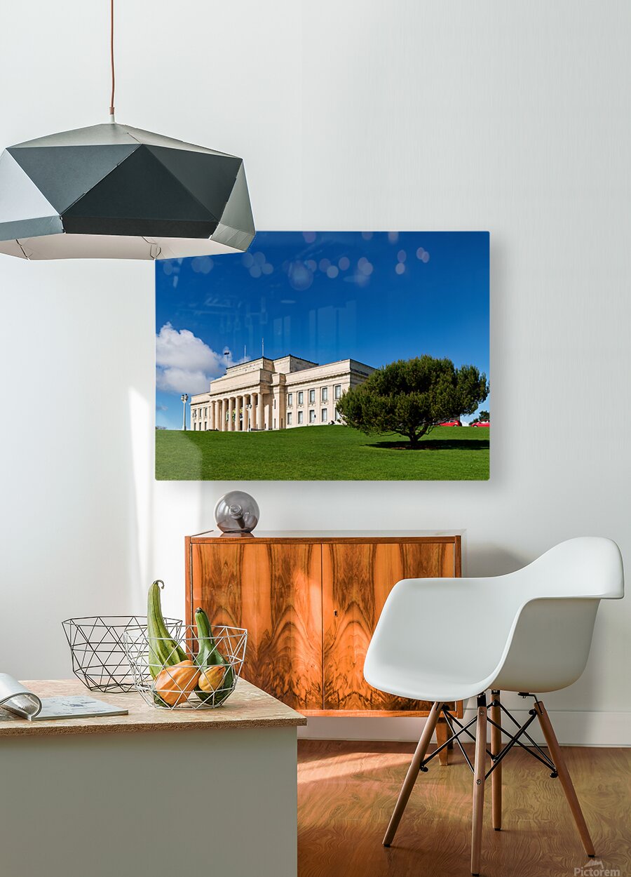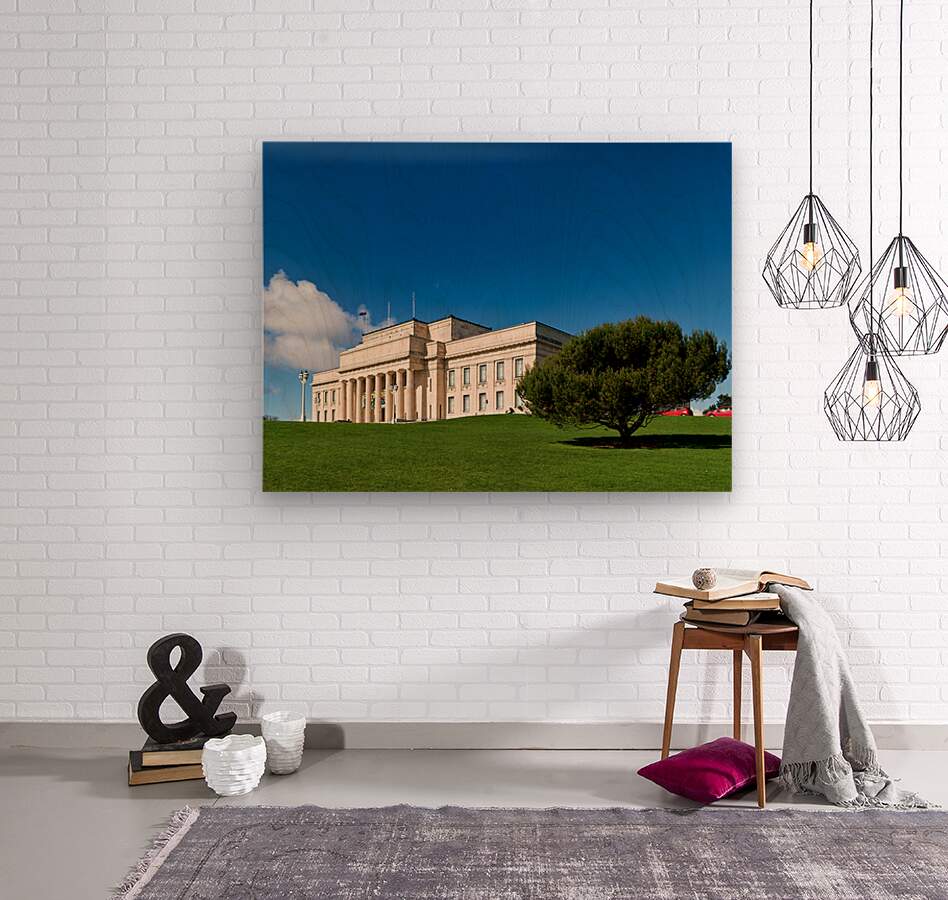 People enjoy visiting the entrance of Auckland War Memorial Museum on a sunny day. The building stands tall against the blue sky.