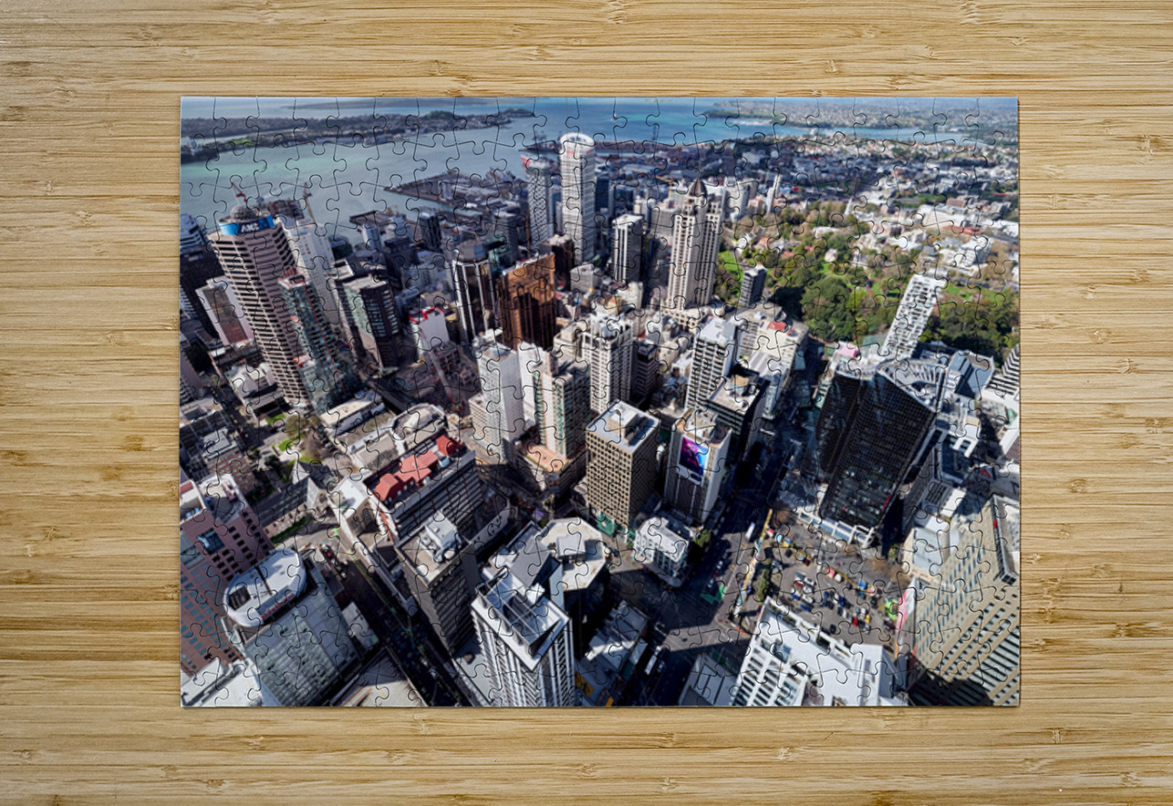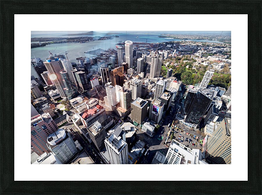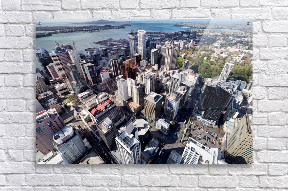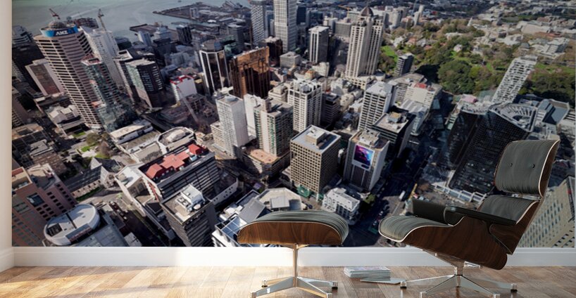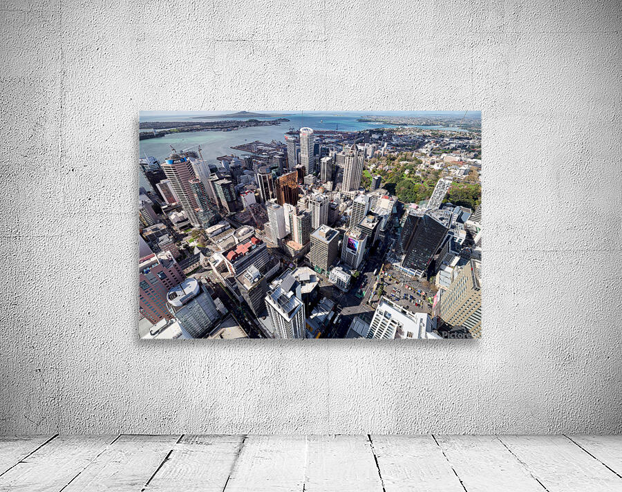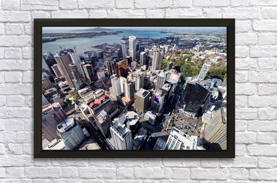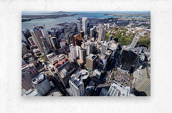 Auckland city is shown from above with buildings streets and waterfront visible. The financial district is highlighted in this view of New Zealand.