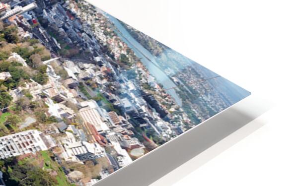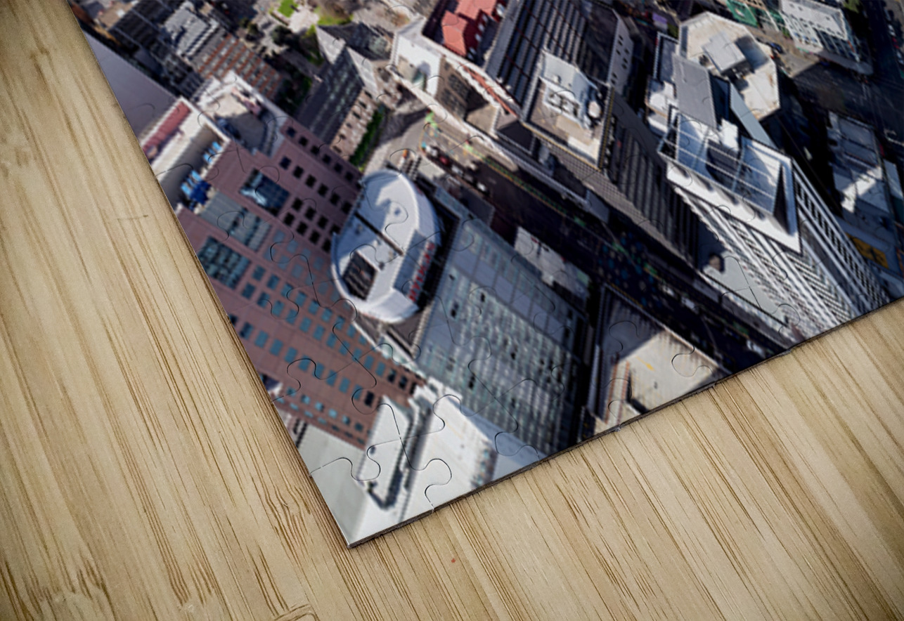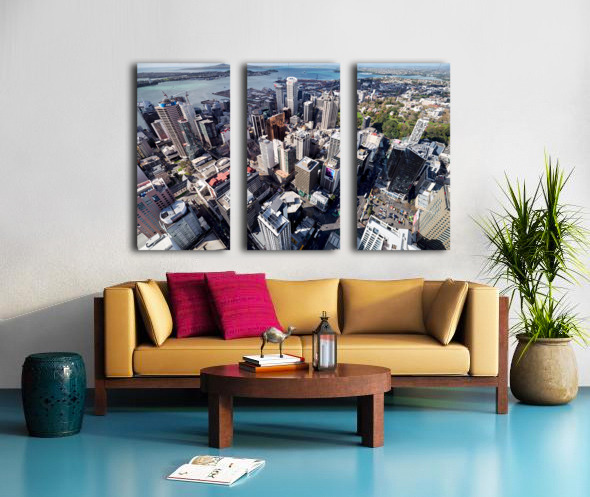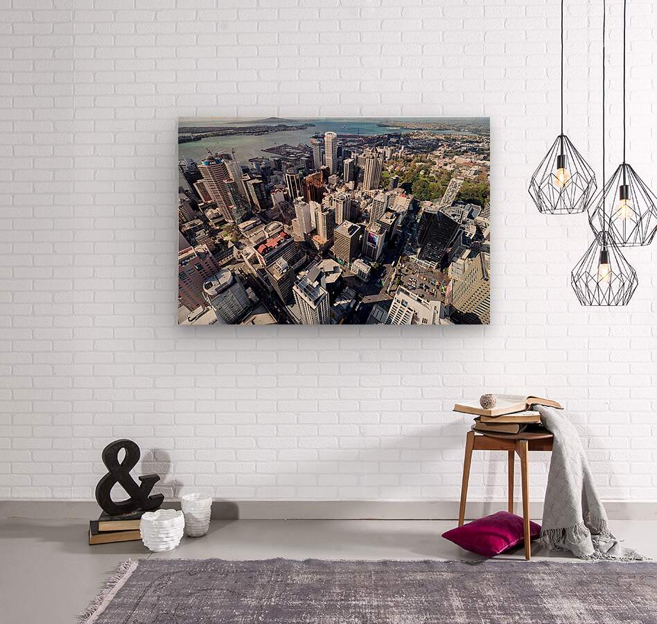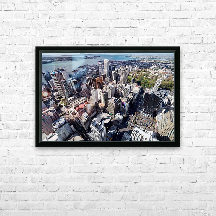 Auckland city is shown from above with buildings streets and waterfront visible. The financial district is highlighted in this view of New Zealand.
