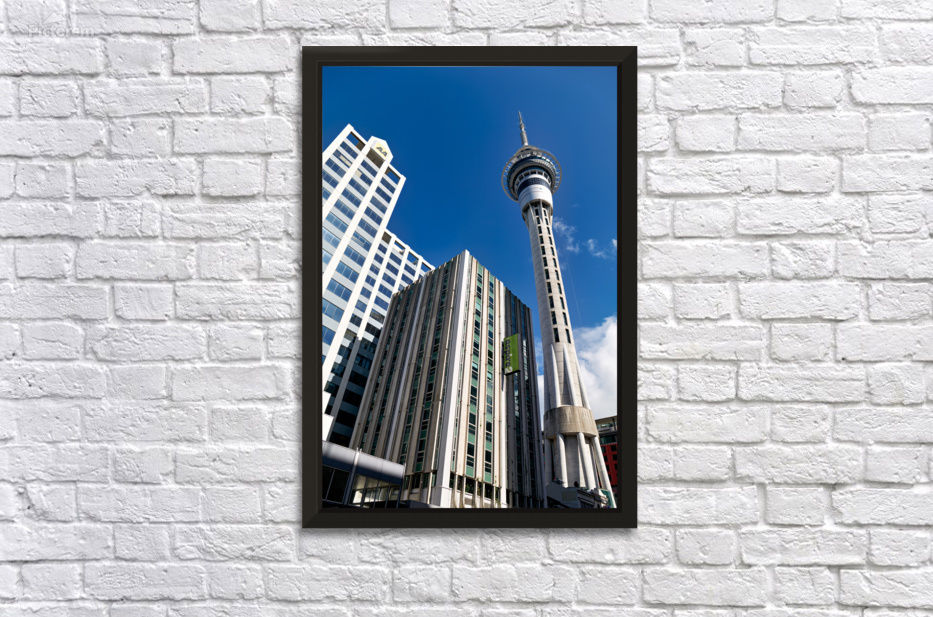 Sky Tower stands tall in Auckland with nearby buildings under a blue sky. The scene captures urban life and architectural design in New Zealand.