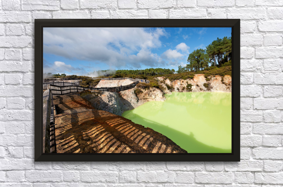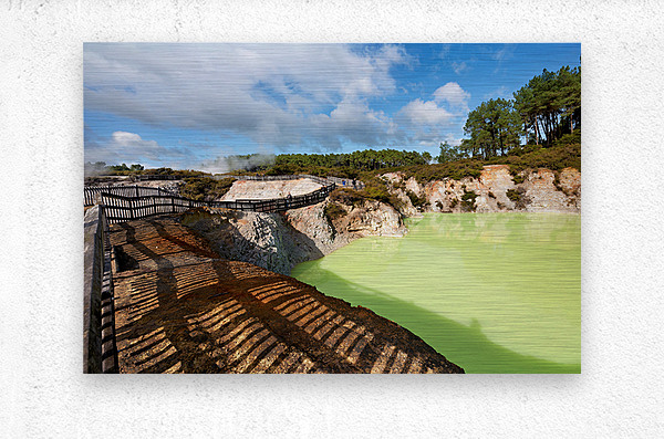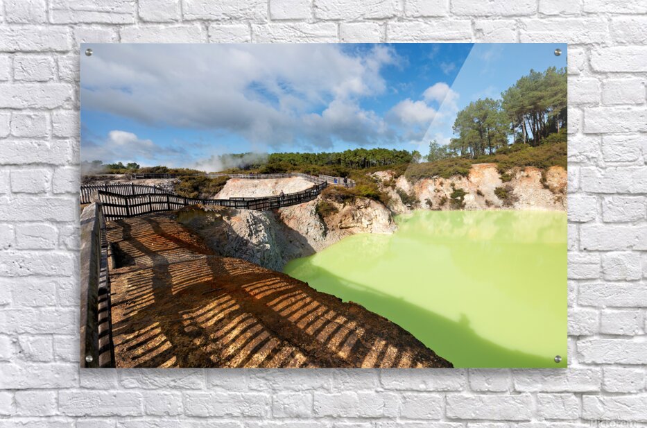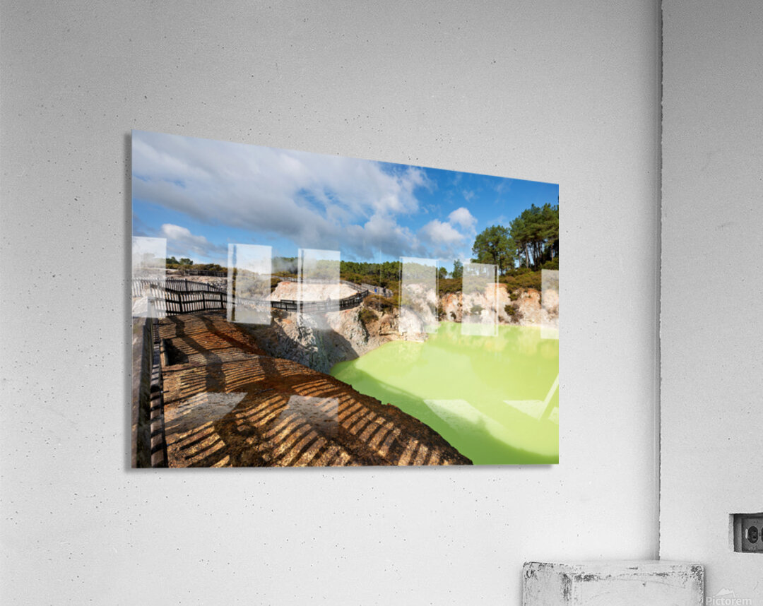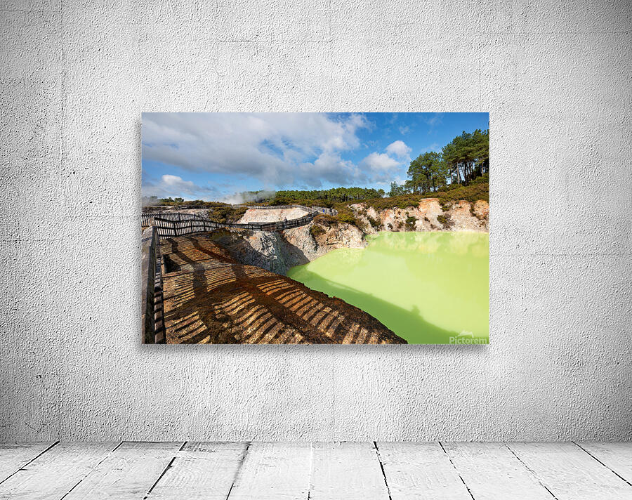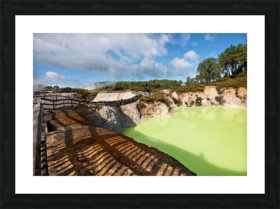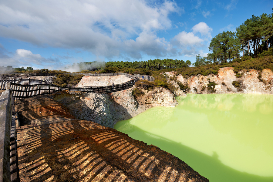 Visitors walk along the boardwalk at Devils Bath in Waiotapu Thermal Wonderland Rotorua New Zealand. Bright green water fills the geothermal pool.