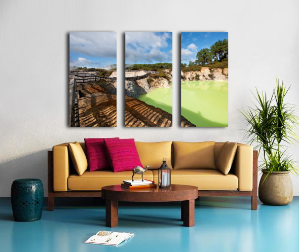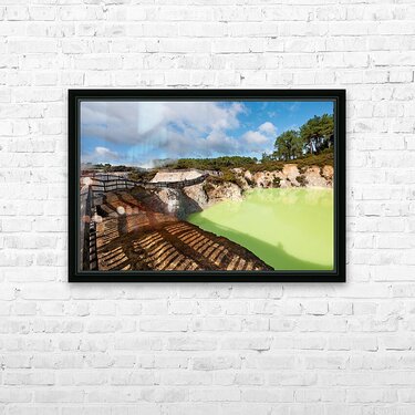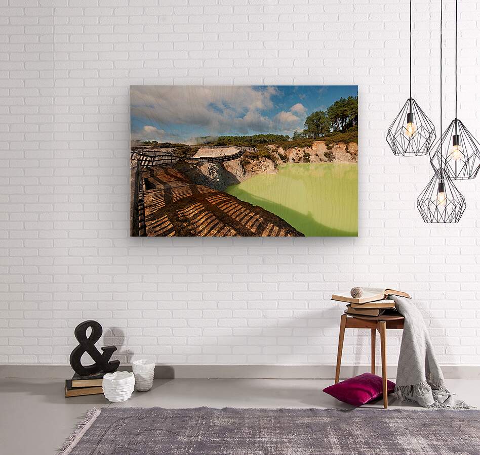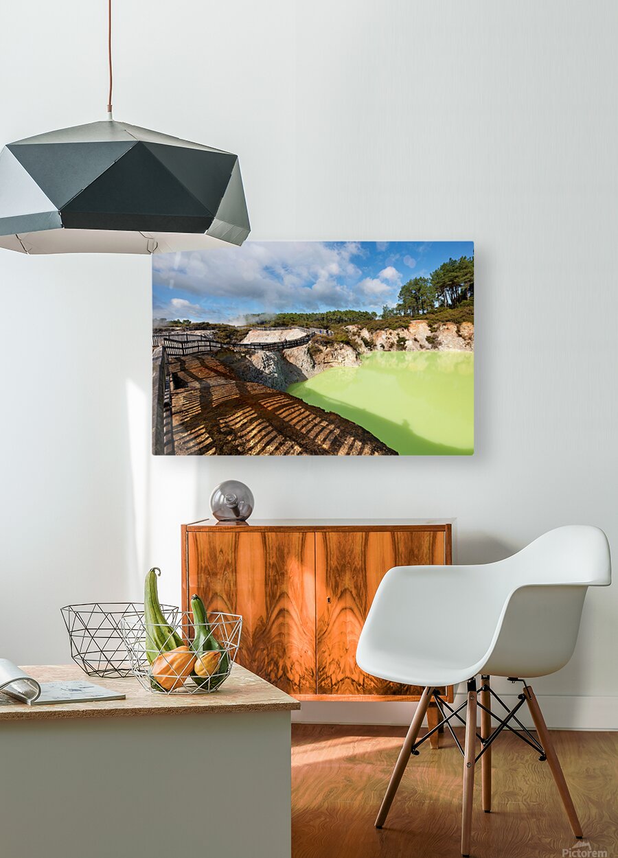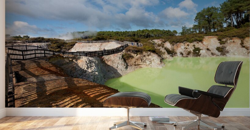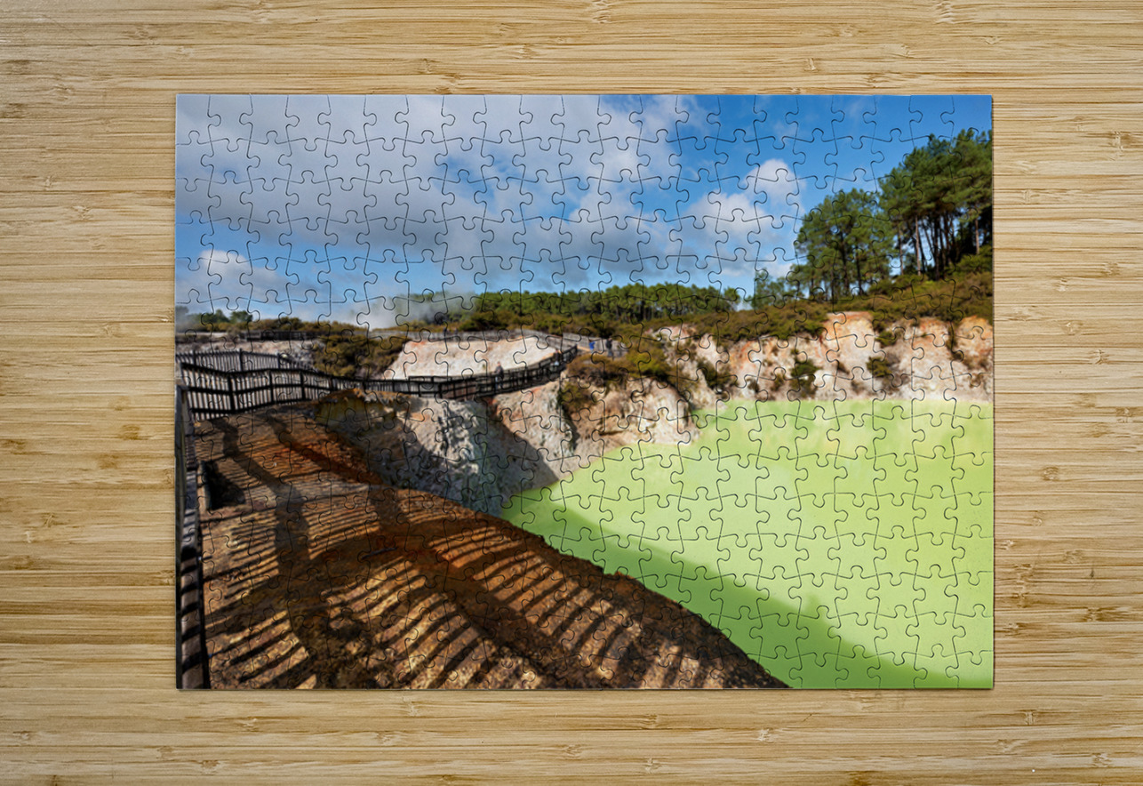 Visitors walk along the boardwalk at Devils Bath in Waiotapu Thermal Wonderland Rotorua New Zealand. Bright green water fills the geothermal pool.