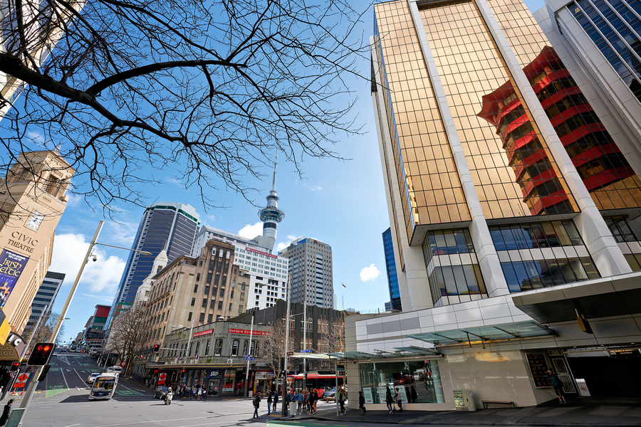 Downtown Auckland features buildings and the Sky Tower on a clear day with blue sky and busy streets filled with people.
