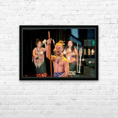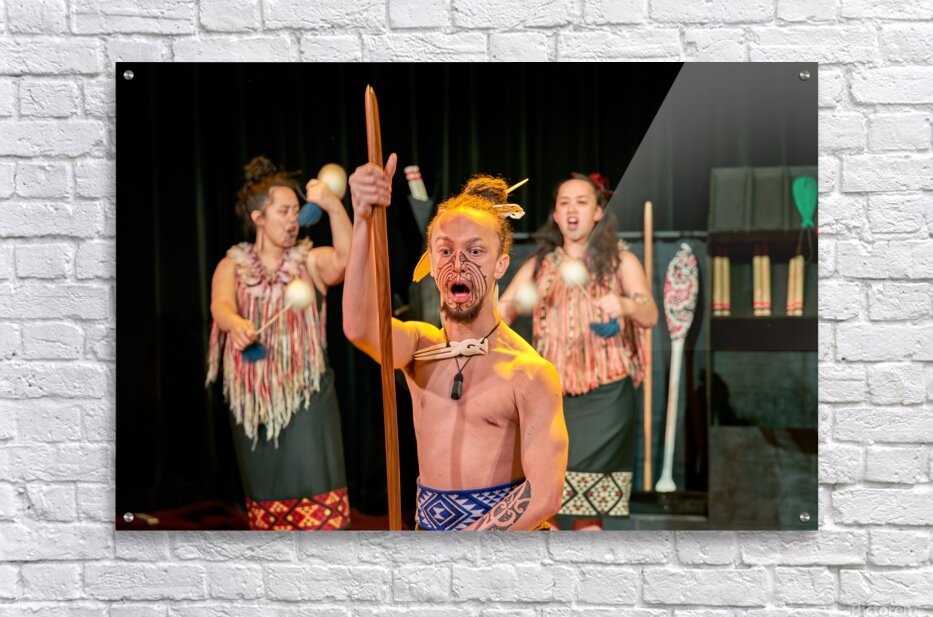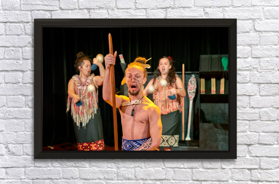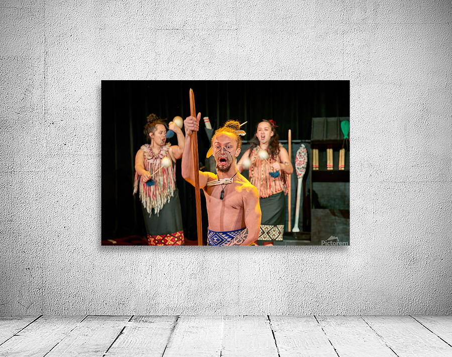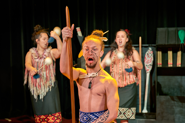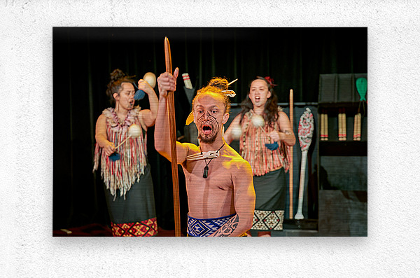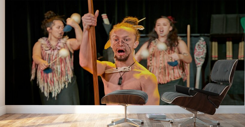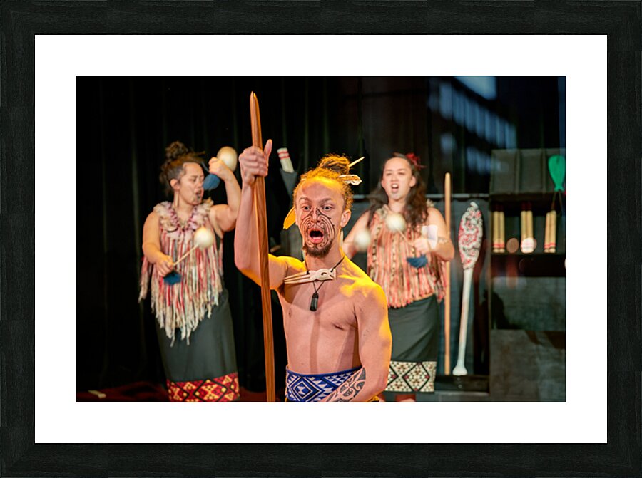 A man performs the Maori haka dance in Auckland New Zealand. He shows strength while two women provide rhythm with instruments.
