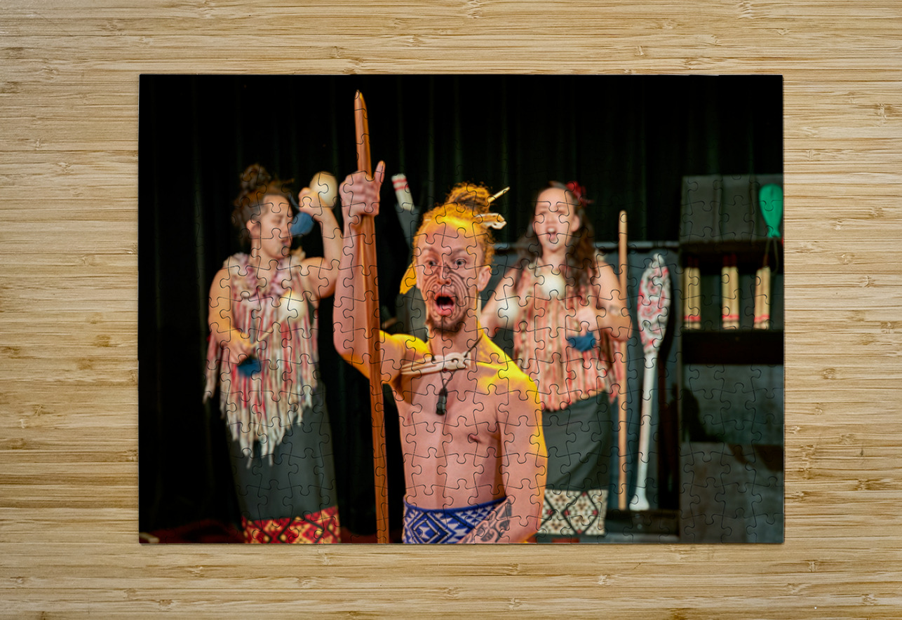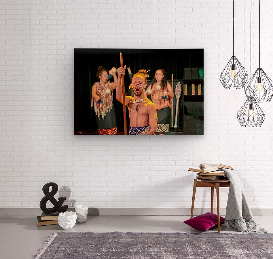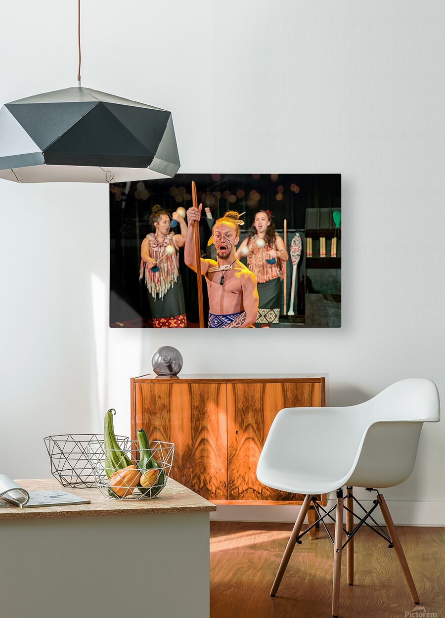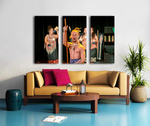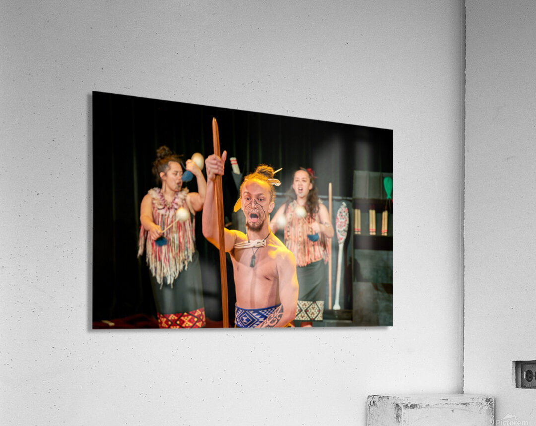 A man performs the Maori haka dance in Auckland New Zealand. He shows strength while two women provide rhythm with instruments.