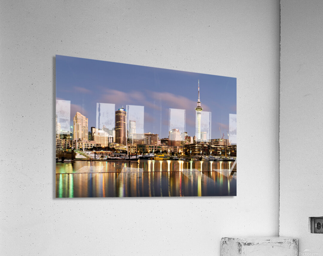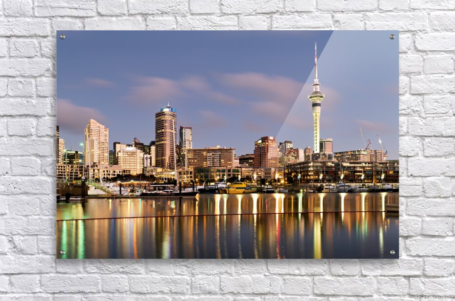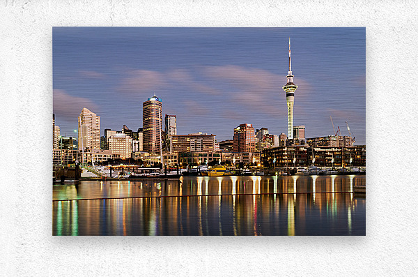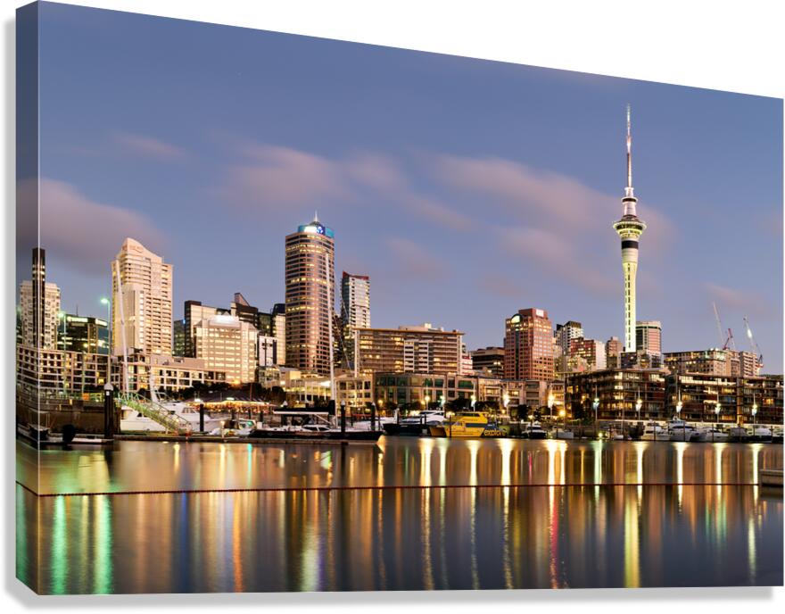 ABOUT THIS ARTWORK: AUCKLAND SKYLINE WITH BUILDINGS AND SKY TOWER DURING EVENING