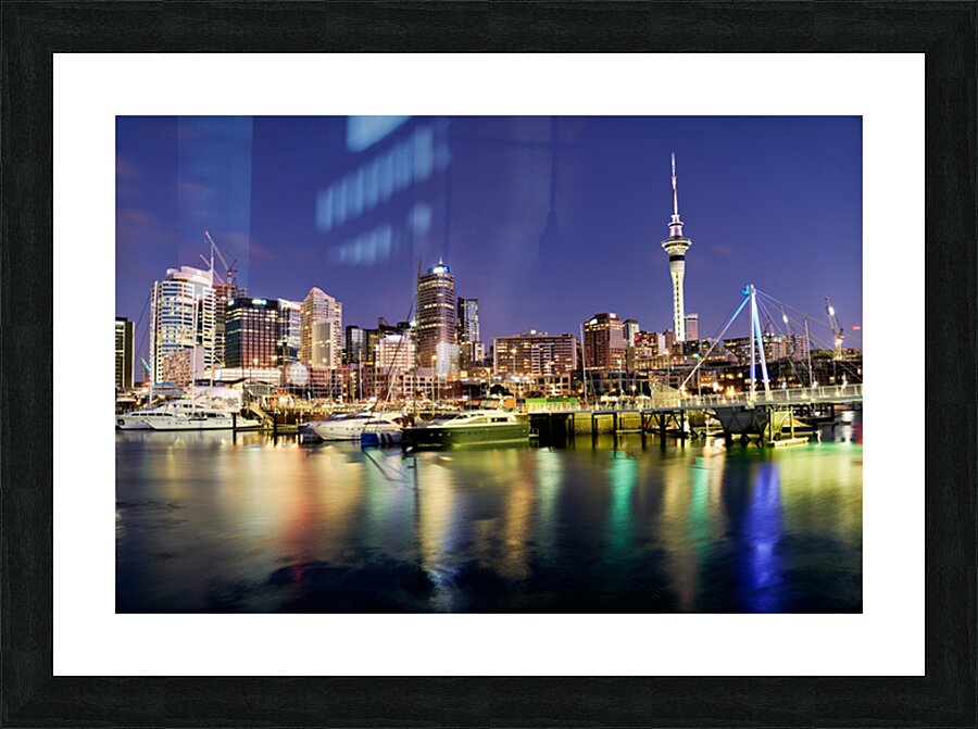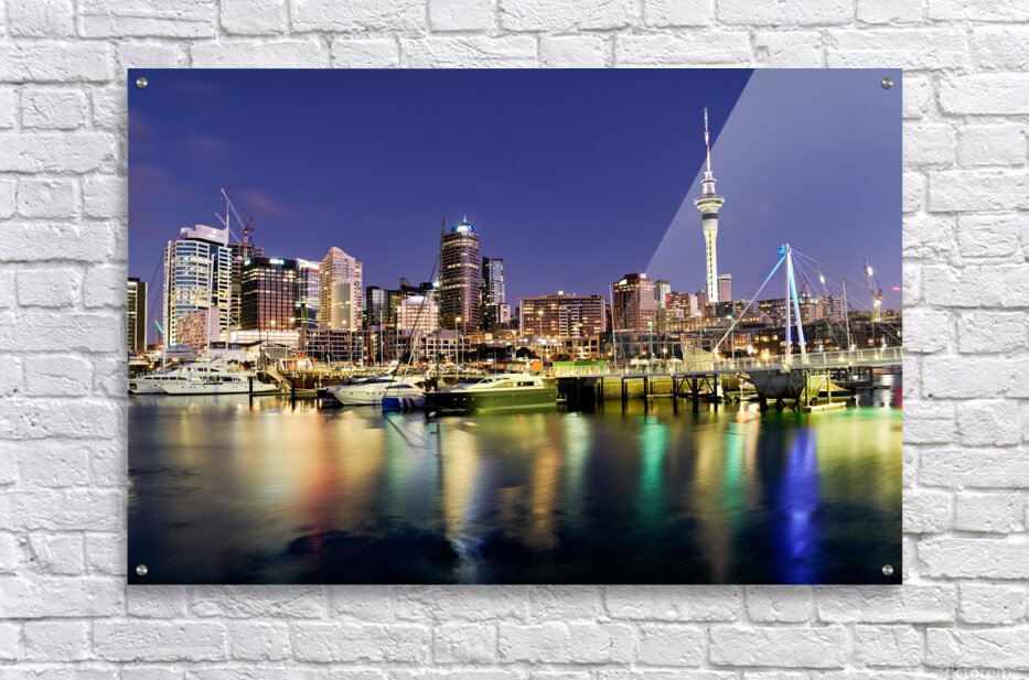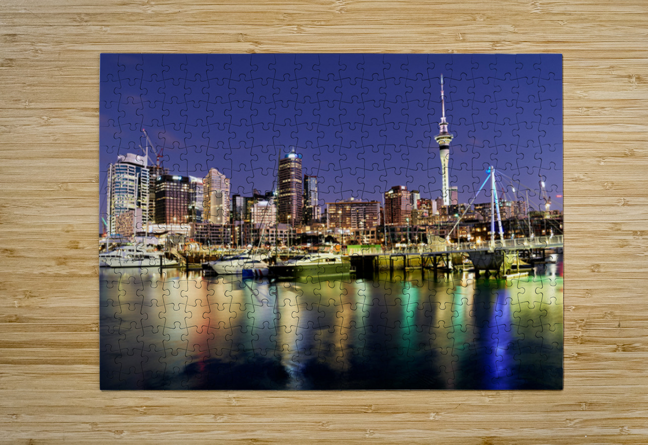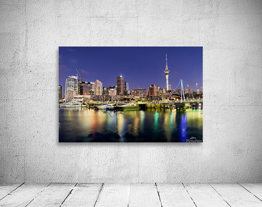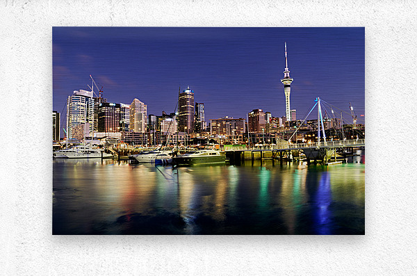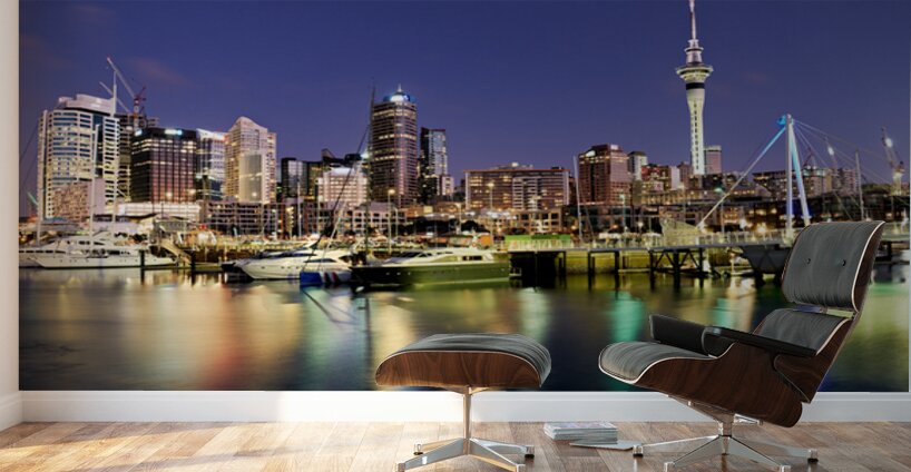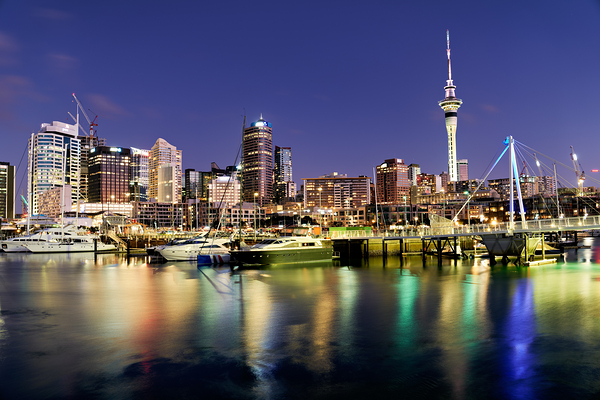 Auckland skyline is visible from Viaduct Harbour during sunset. The buildings reflect on the water below with boats docked nearby.