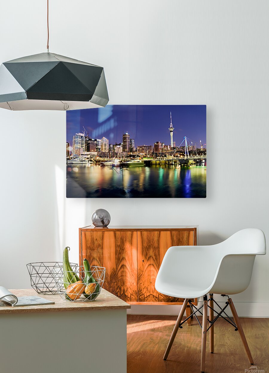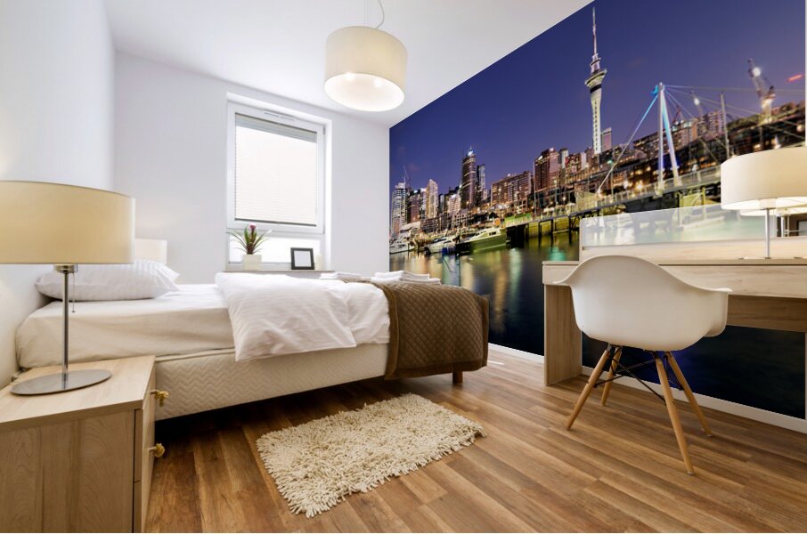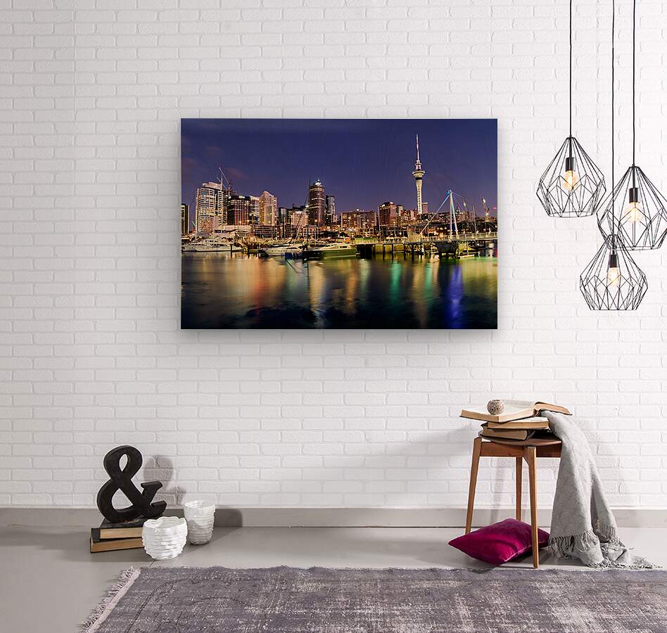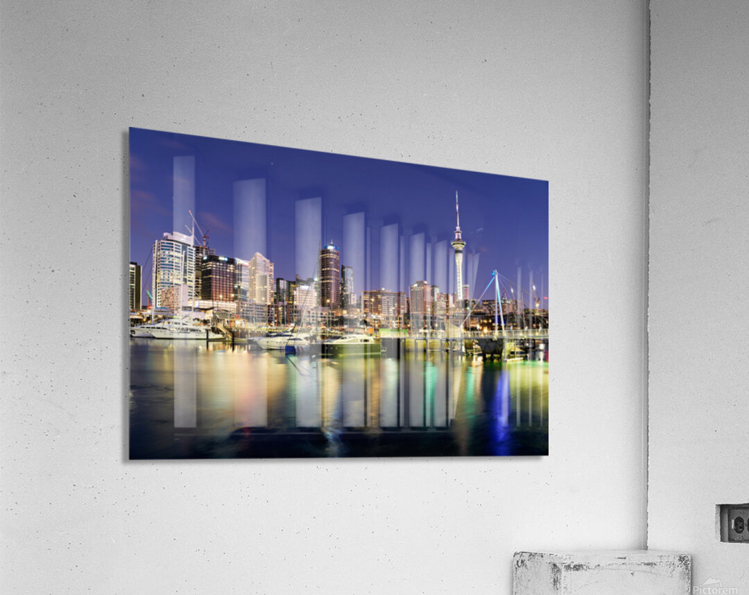 Auckland skyline is visible from Viaduct Harbour during sunset. The buildings reflect on the water below with boats docked nearby.