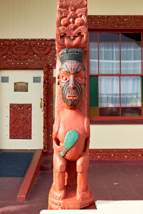 A Maori carving stands by the entrance of the Whakarewarewa living village in Rotorua showing traditional art and cultural heritage.