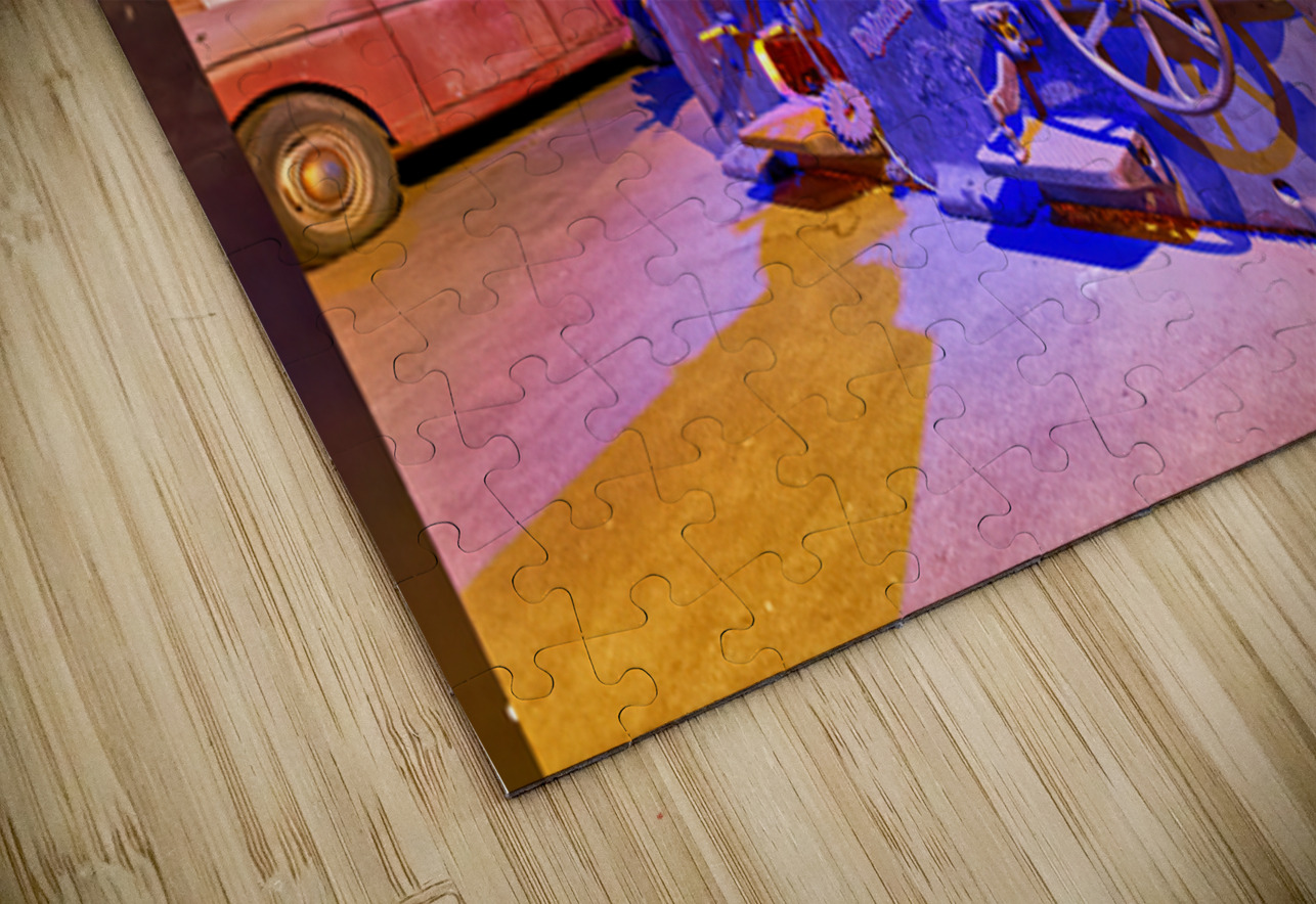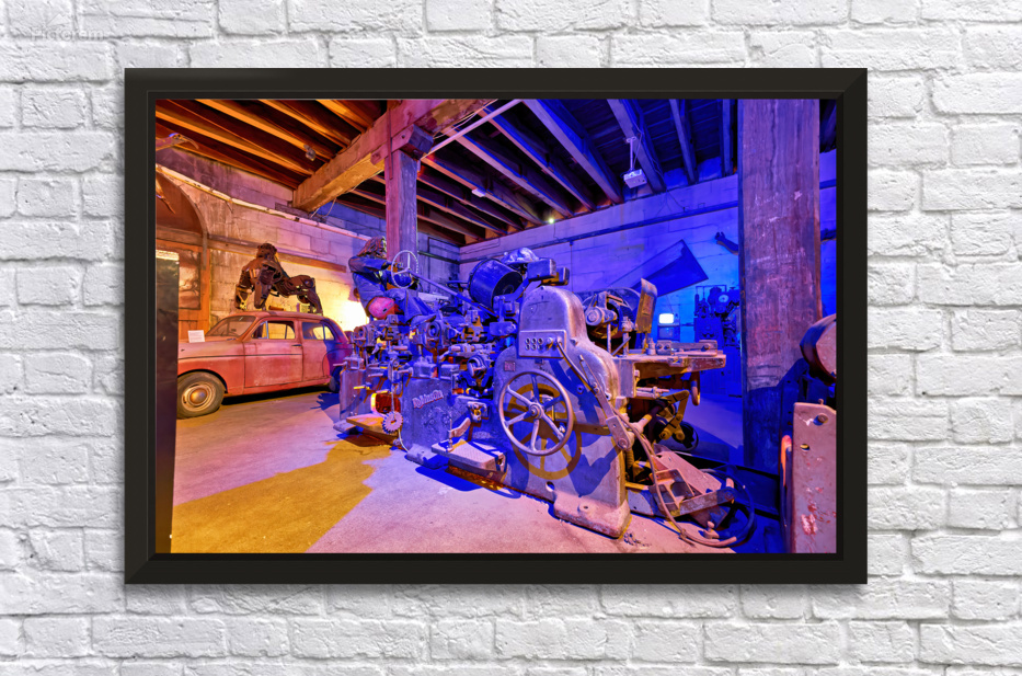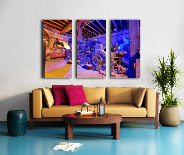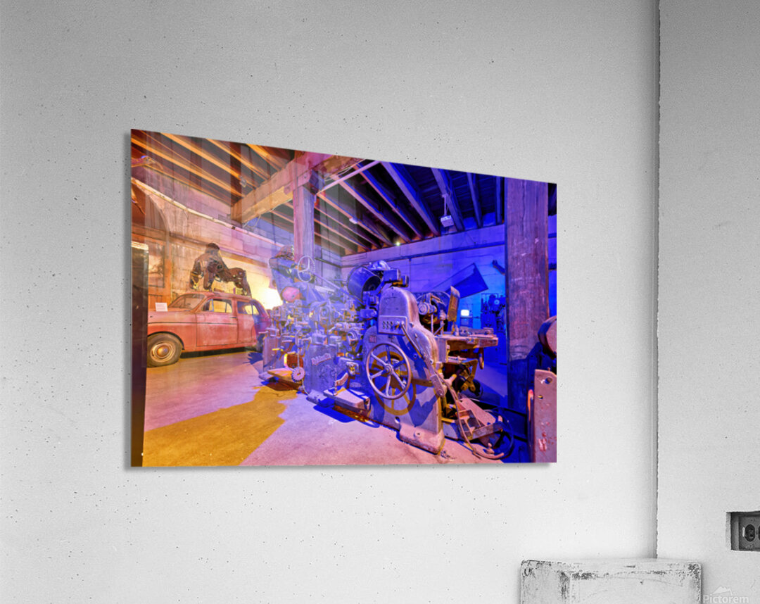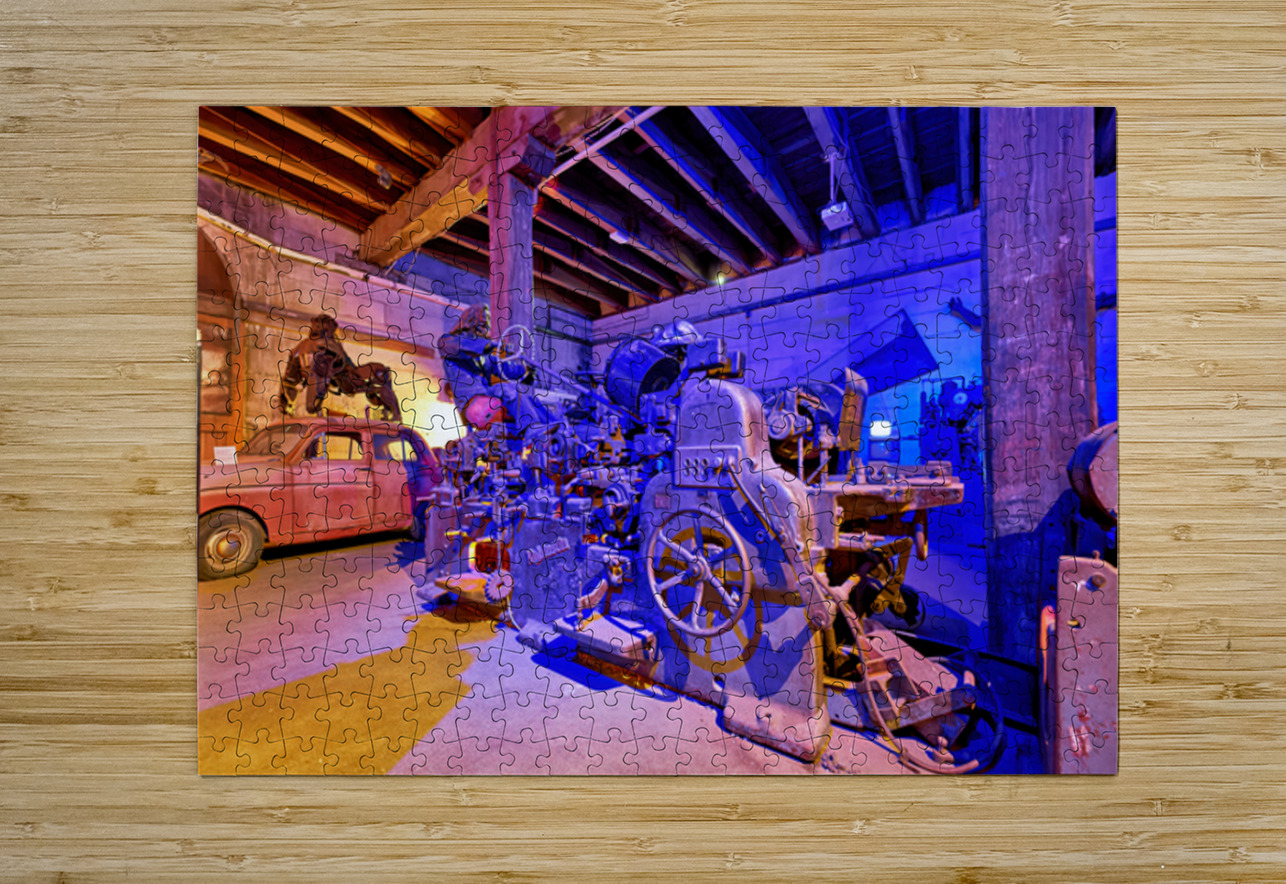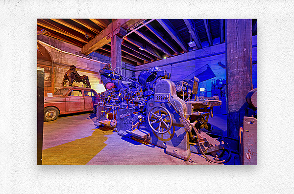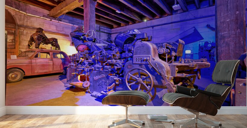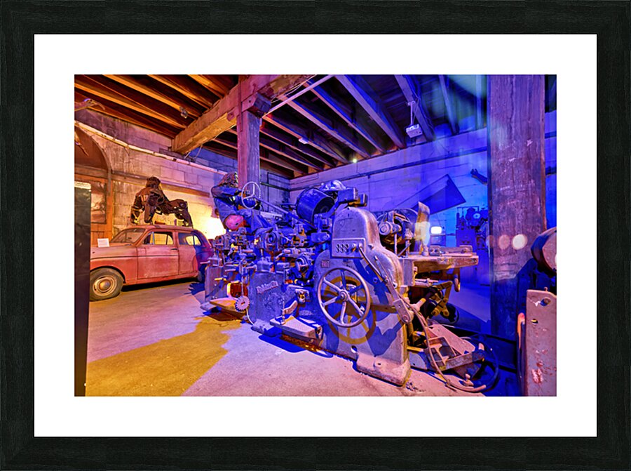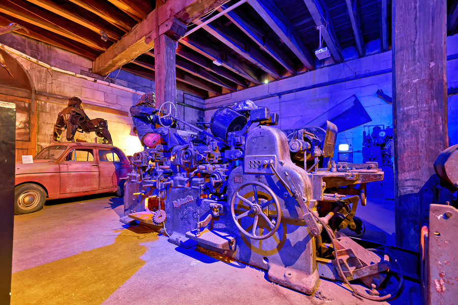 Visitors view old machines and classic cars at Steampunk HQ Art gallery in Oamaru New Zealand during daytime hours in the vibrant setting.