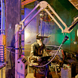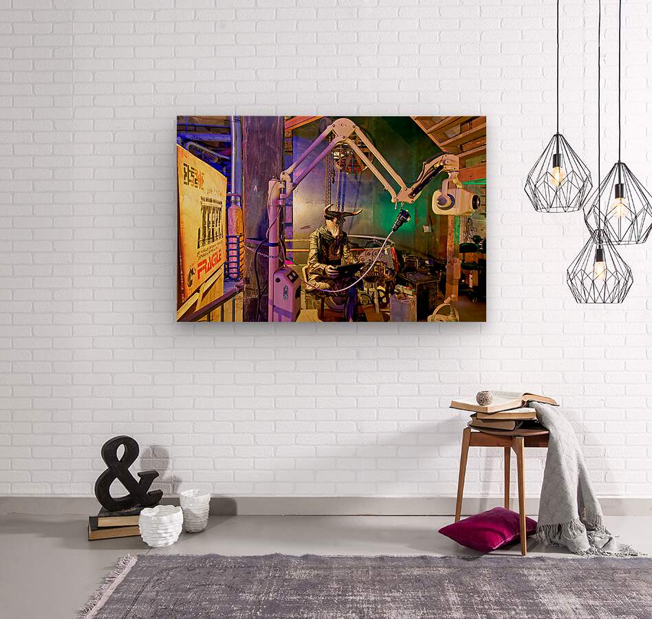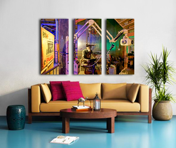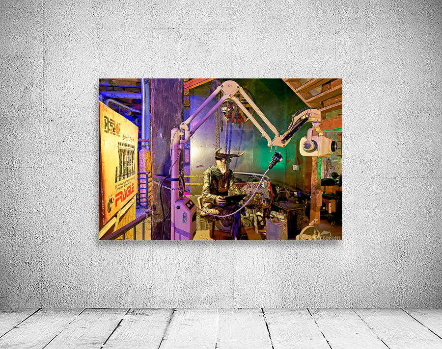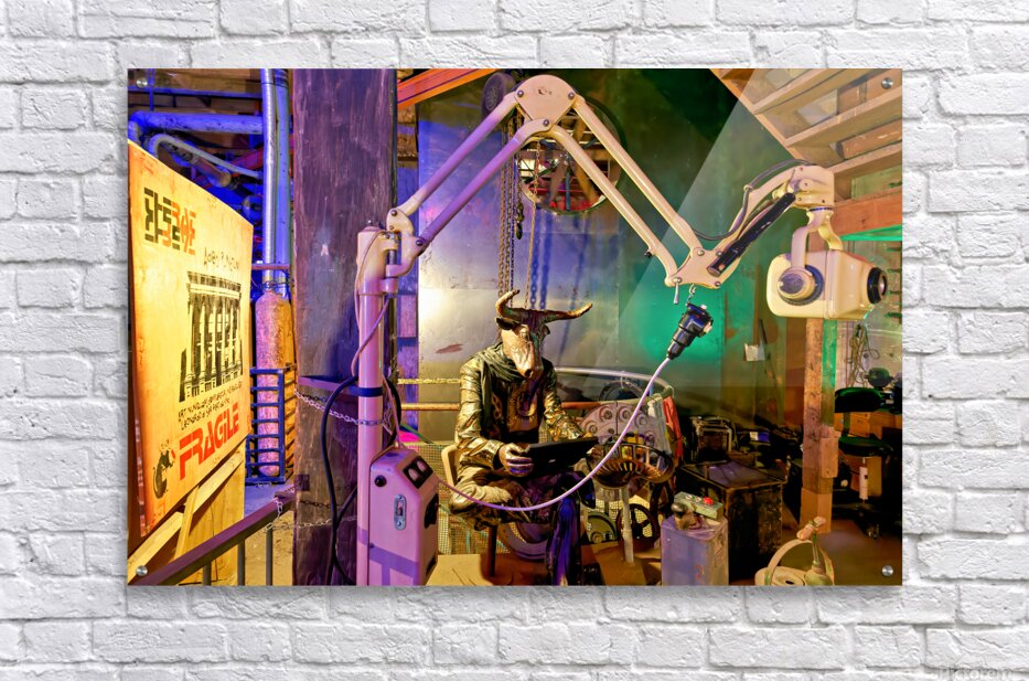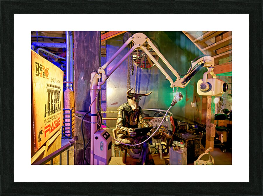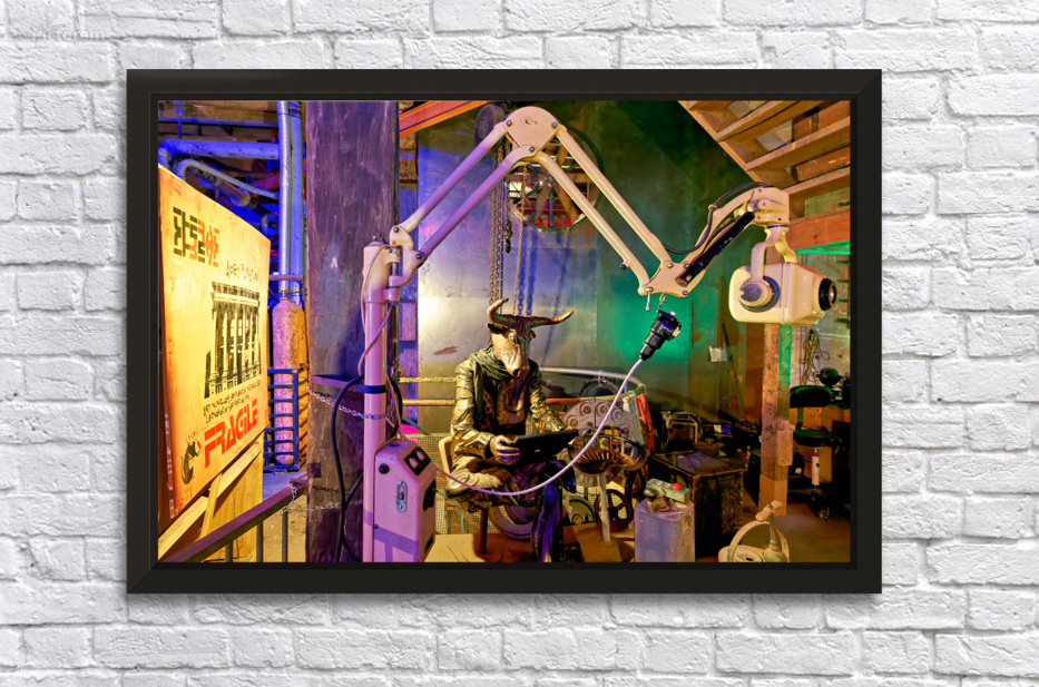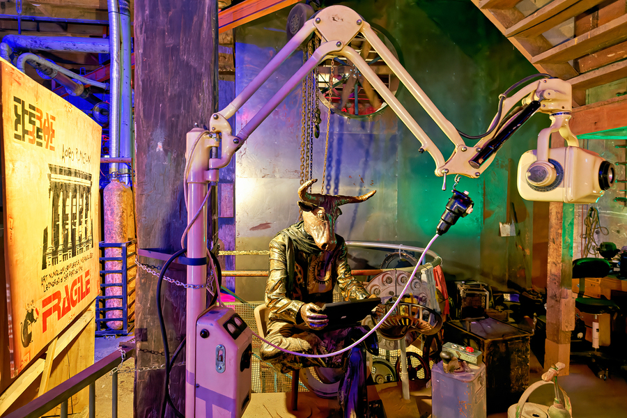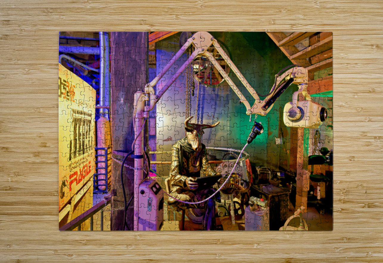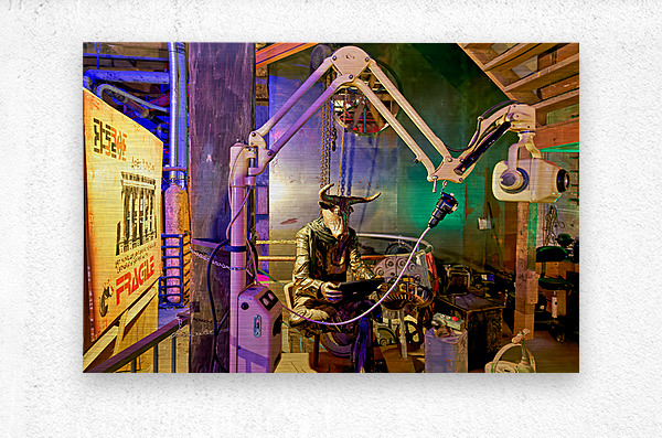 A view of an art piece featuring a bull-headed figure in the Steampunk HQ gallery. Oamaru New Zealand showcases creative designs and art.