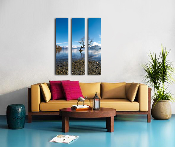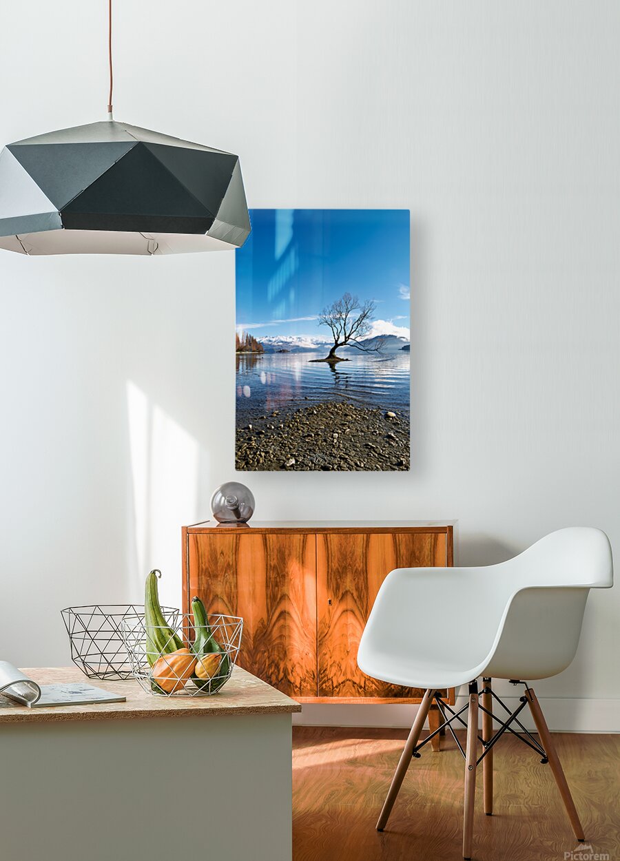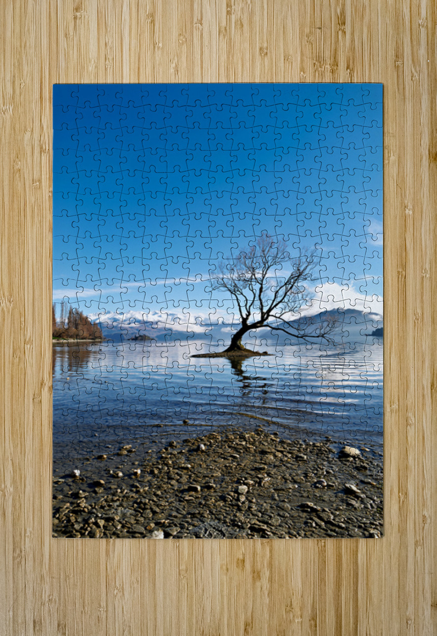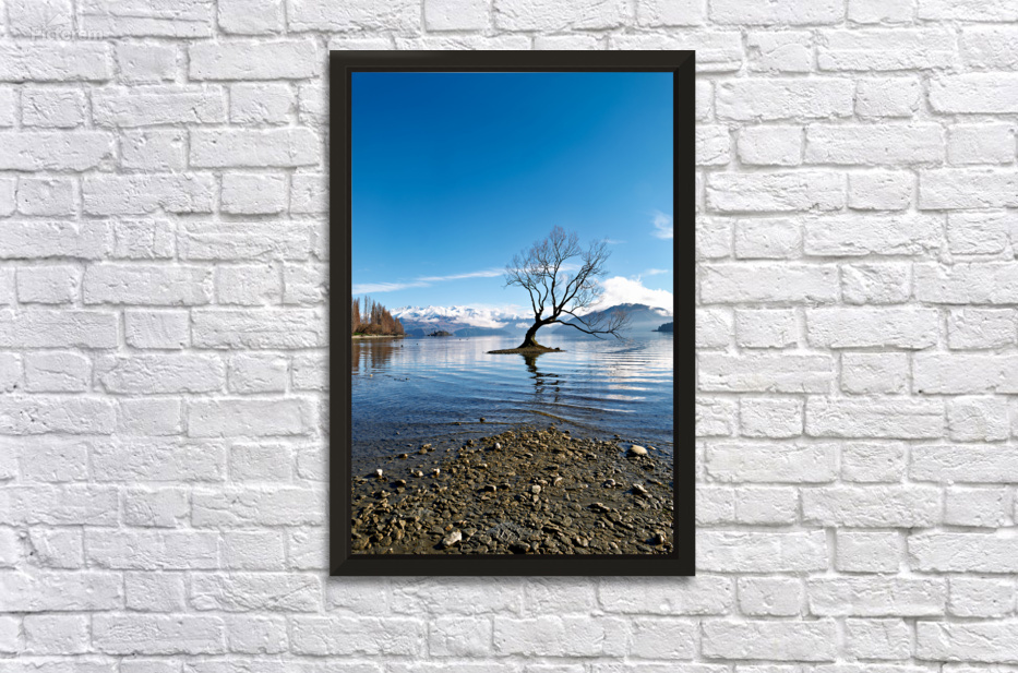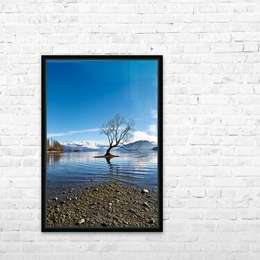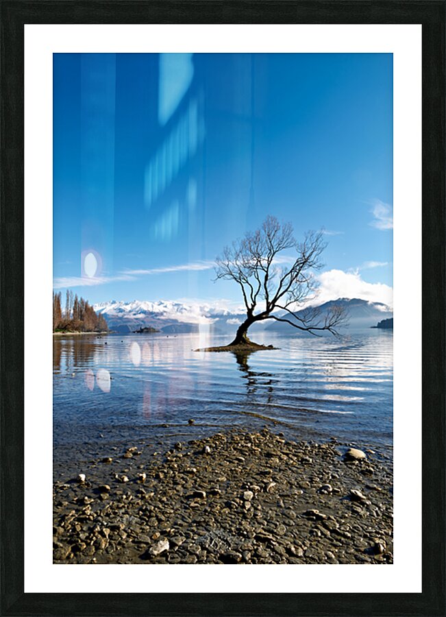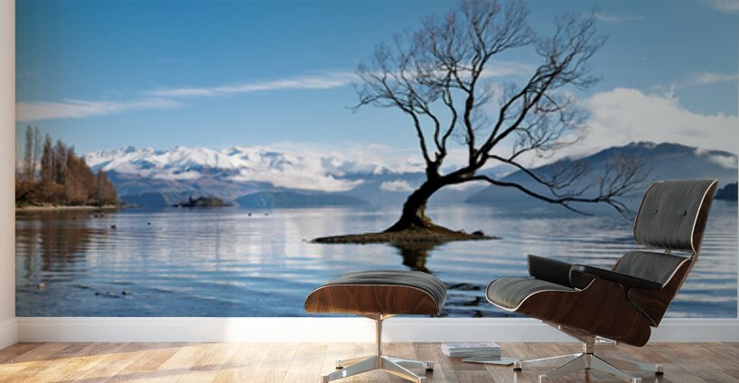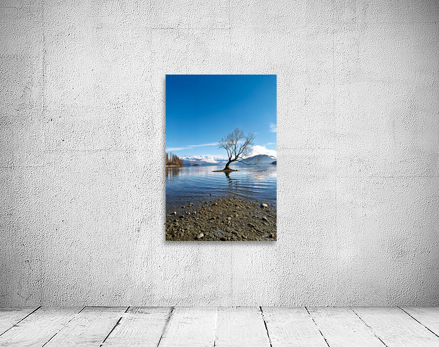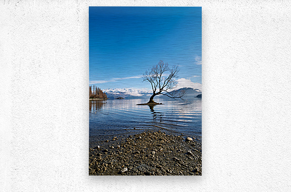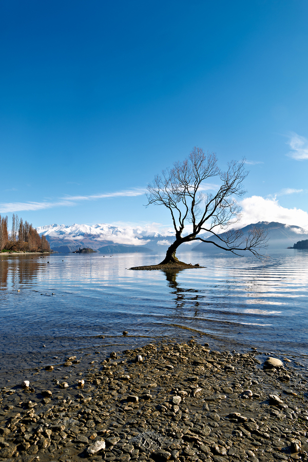 A tree is seen in the water of Lake Wanaka with mountains in the background. The sky is clear and the water has gentle ripples.