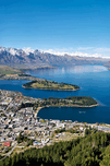 Lake Wakatipu with Queenstown in the foreground on South Island. Mountains are in the background under a clear sky.
