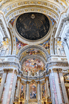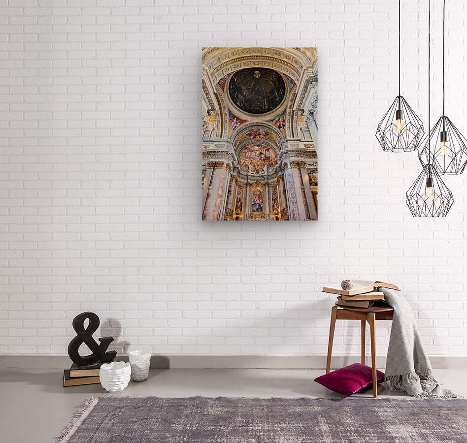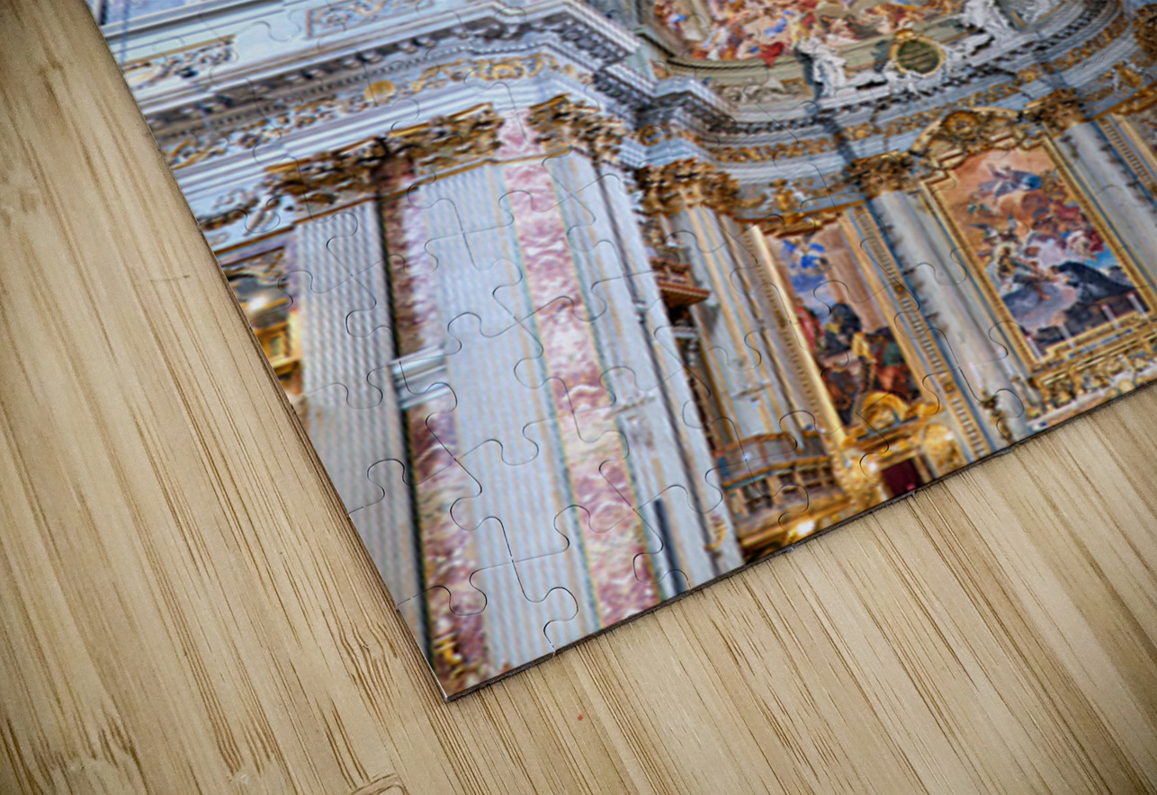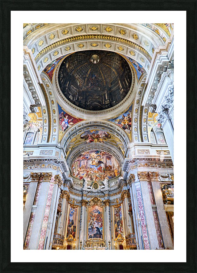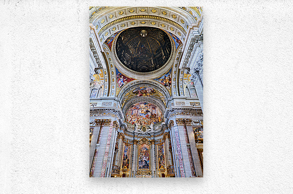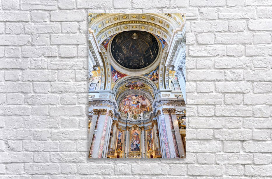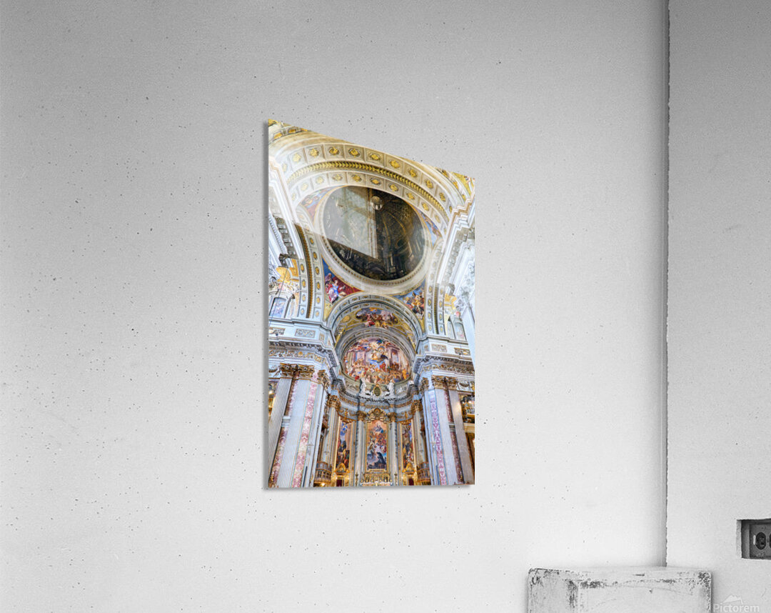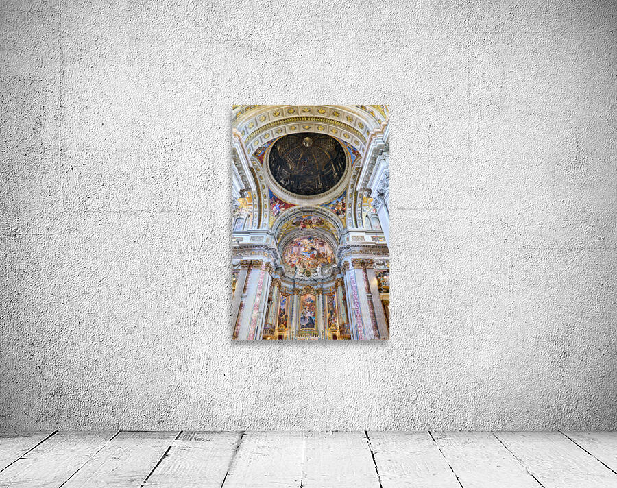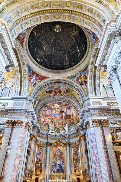 Visitors explore the interior of the Church of St. Ignatius of Loyola in Rome. The walls and ceilings feature many artistic designs and decorations.