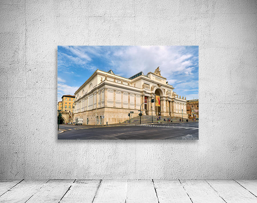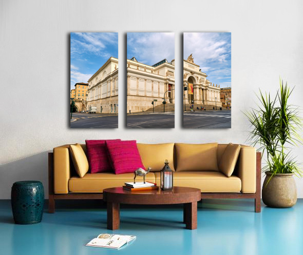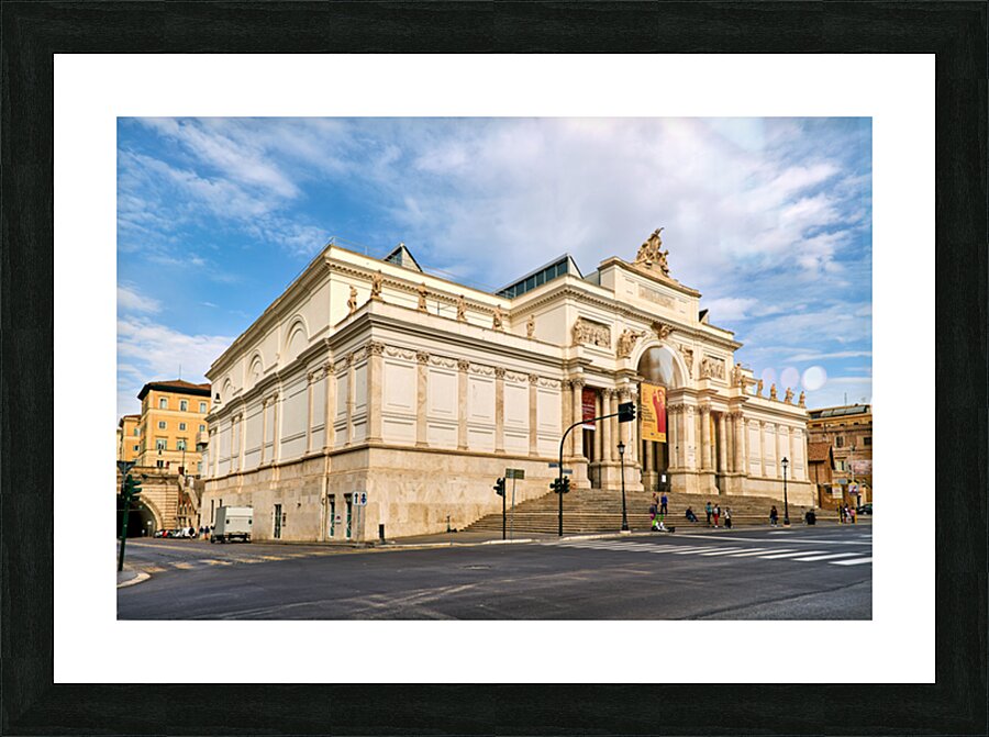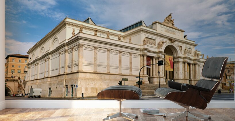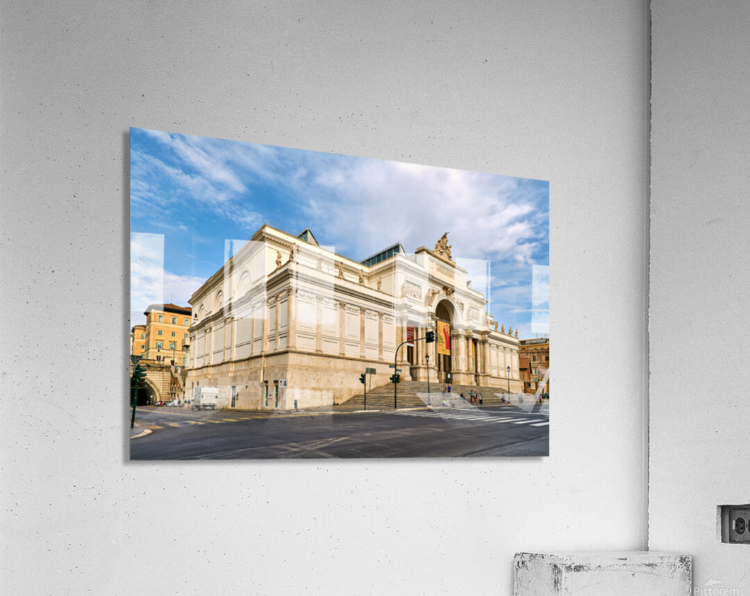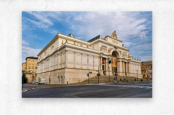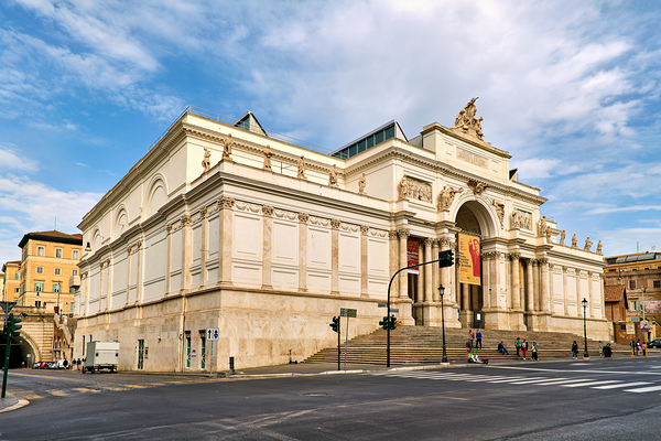 People walk near Palazzo delle Esposizioni in Rome. The building shows neoclassical design and is located in an urban area.