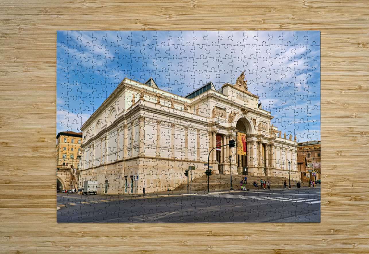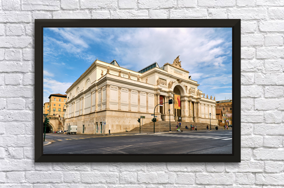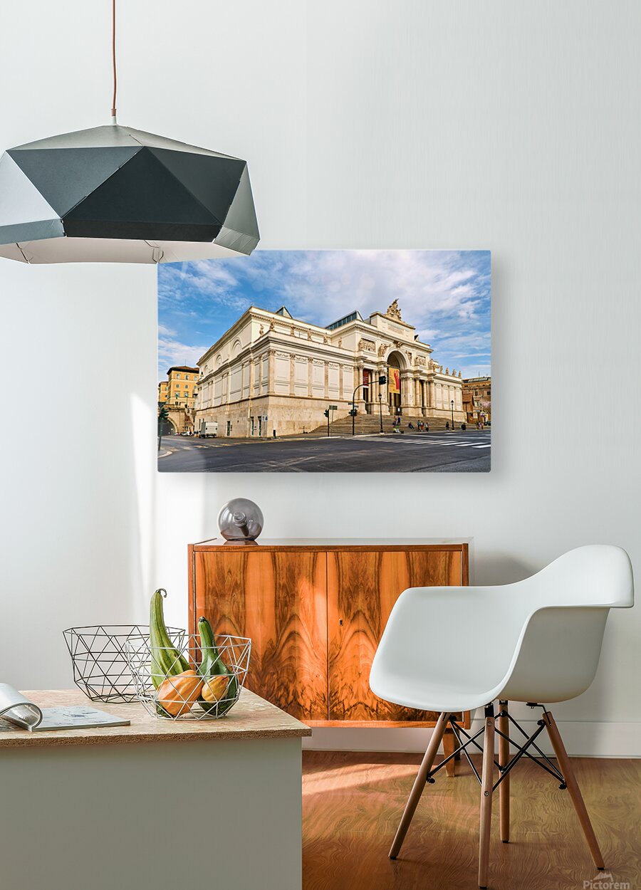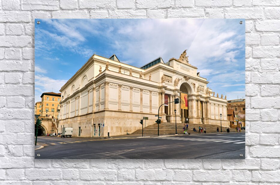 People walk near Palazzo delle Esposizioni in Rome. The building shows neoclassical design and is located in an urban area.